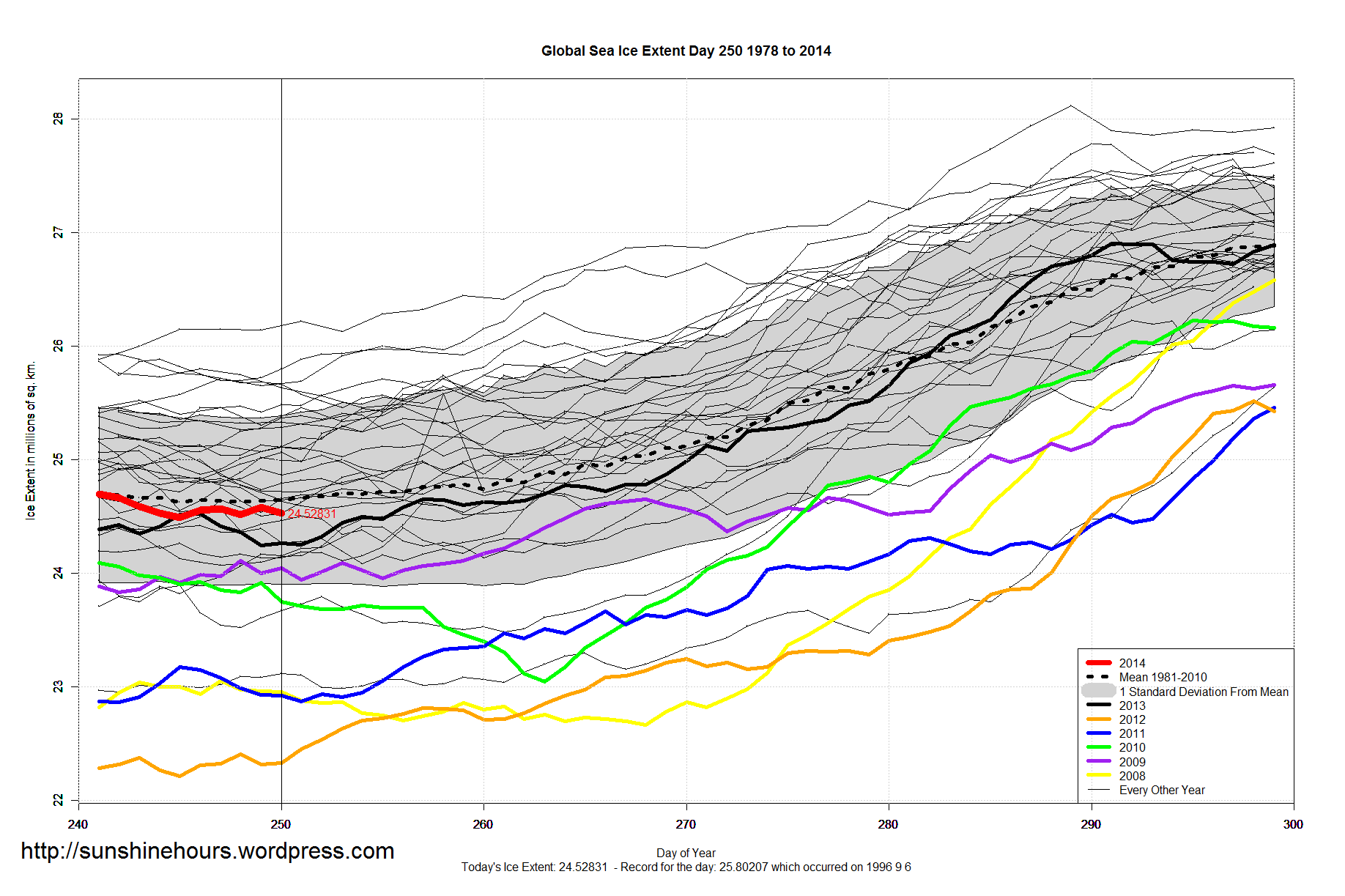 Global Sea Ice Extent Sep 08 2014 – -120,000 sq km below the 1981-2010 mean. Data for Day 250. Data here.