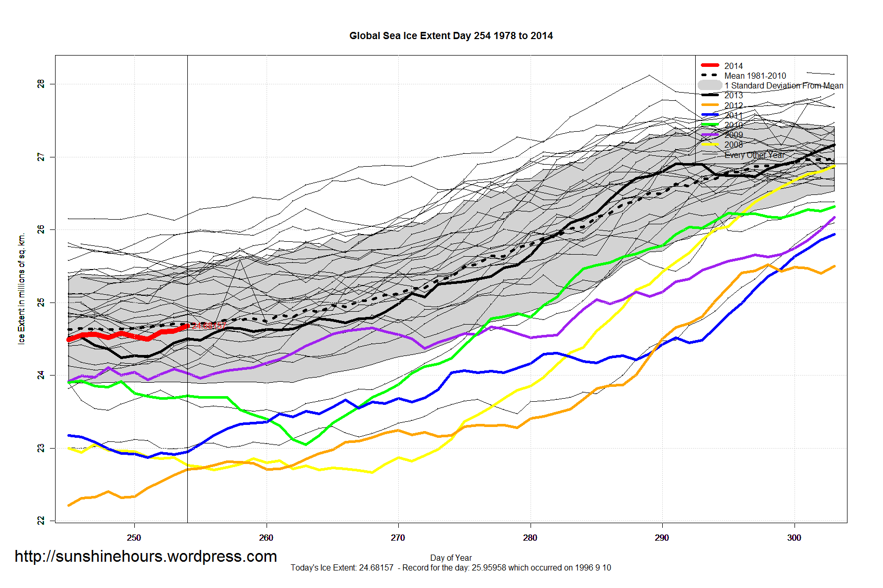 Global Sea Ice Extent Sept 12 2014 – Teensy, Tiny Bit Below Mean (About .07%) Published on September 12, 2014September 12, 2014 by sunshinehours1 Global Sea Ice Extent Sept 12 2014 – -17,000 sq km below the 1981-2010 mean. Data for Day 254. Data here. Share this: Click to share on X (Opens in new window) X Click to share on Facebook (Opens in new window) Facebook Like Loading... Related