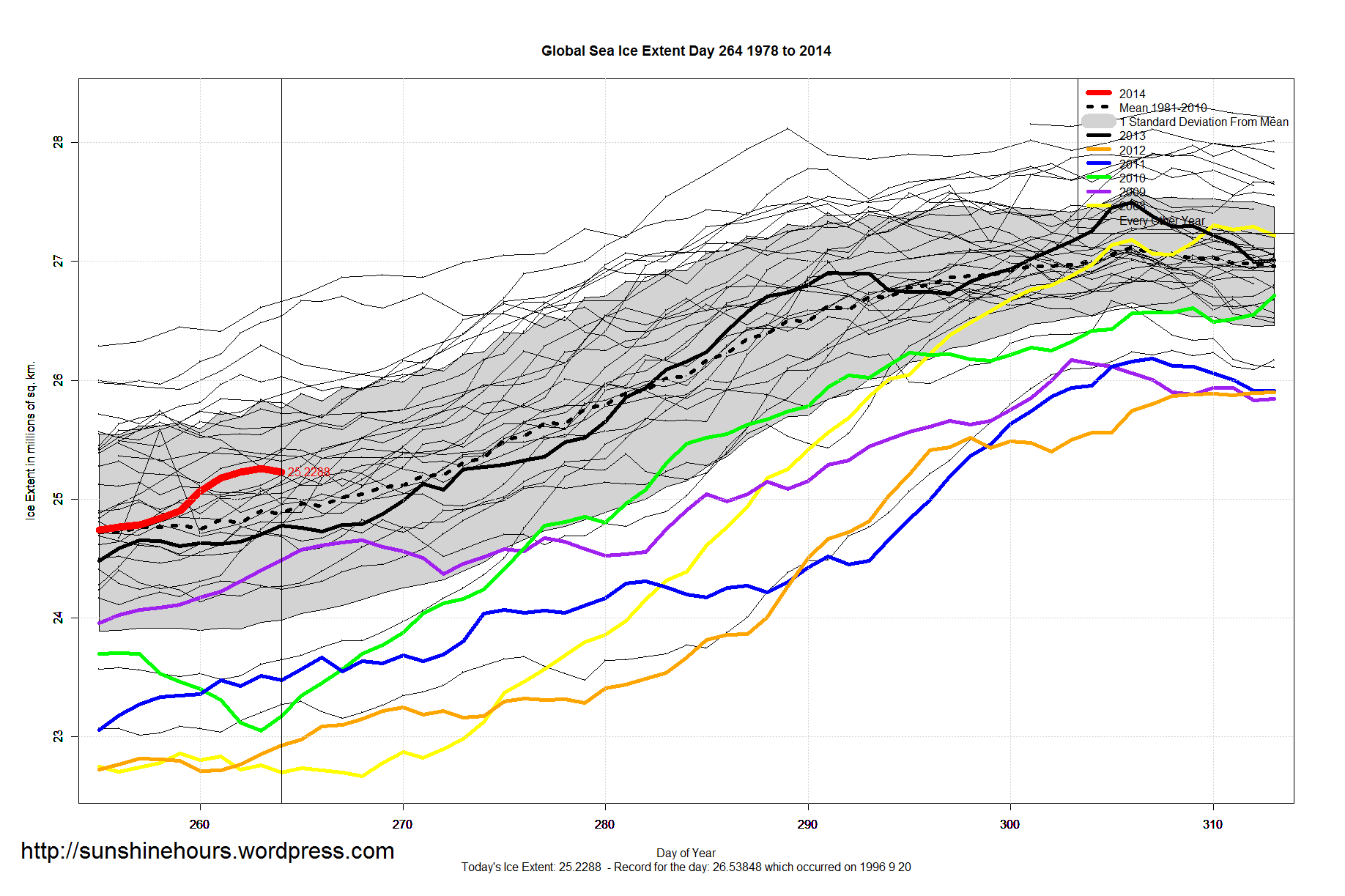 Global Sea Ice Extent Sep 22 2014 – 356,000 sq km above the 1981-2010 mean. Data for Day 264. Data here.