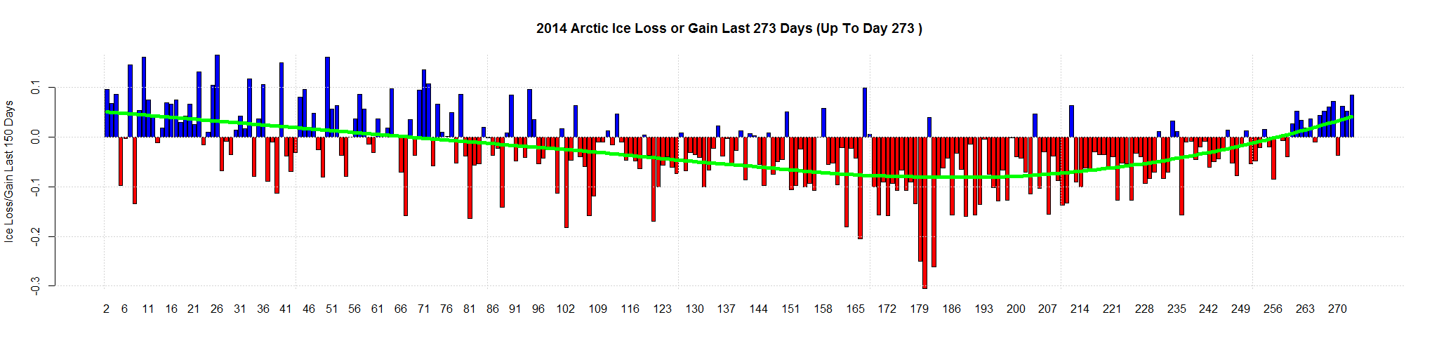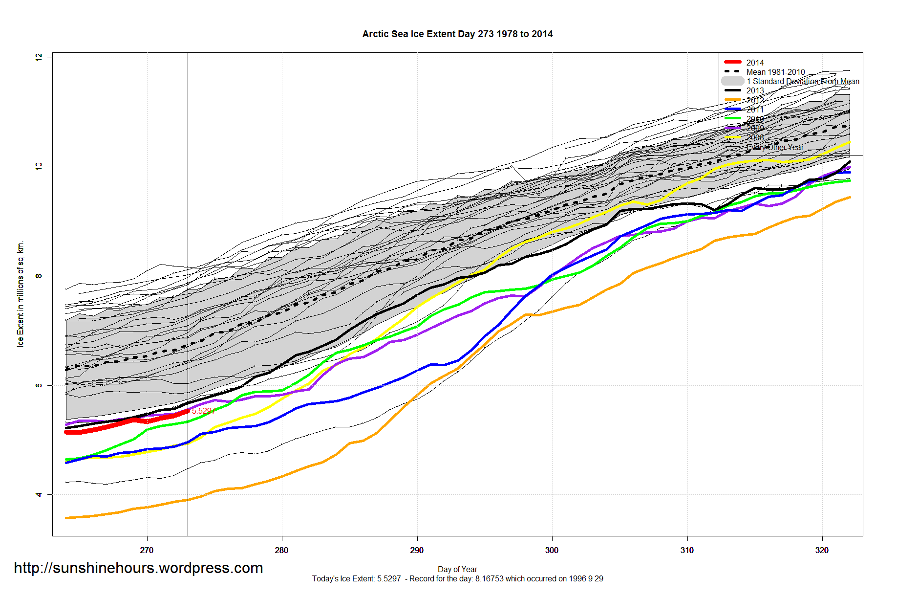 1. So NOAA Sea Ice Index shows a gain of 84,000 Km2 in the Arctic, for a Sept 30 total of 5.53 M Km2. This gives an average extent of 5.21 M Km2 for the month of September 2014.