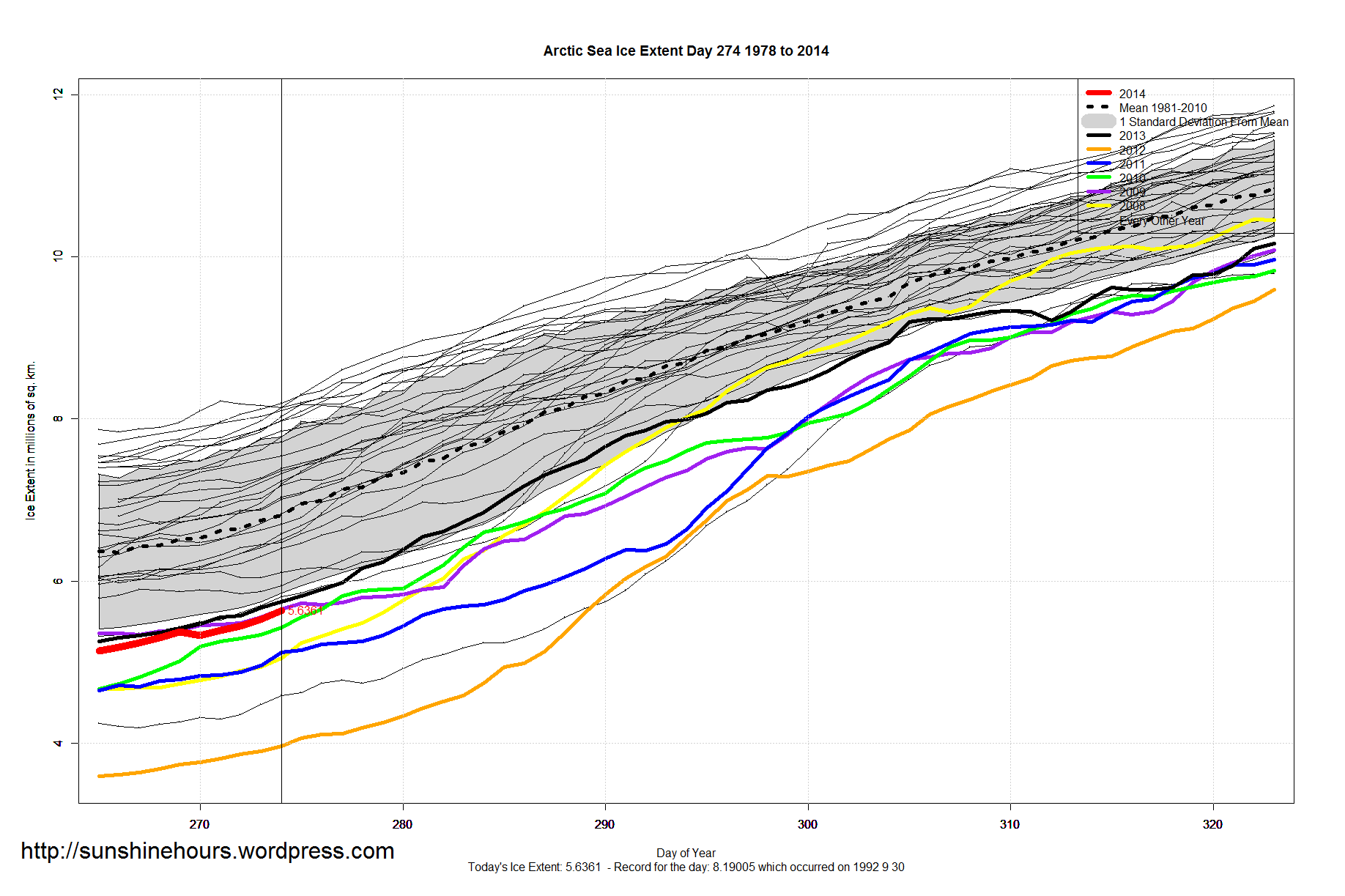 Day 275: MASIE extent increased by 174,000 Km2 in the last 2 days to reach 5.69 MKm2, the highest since August 29.