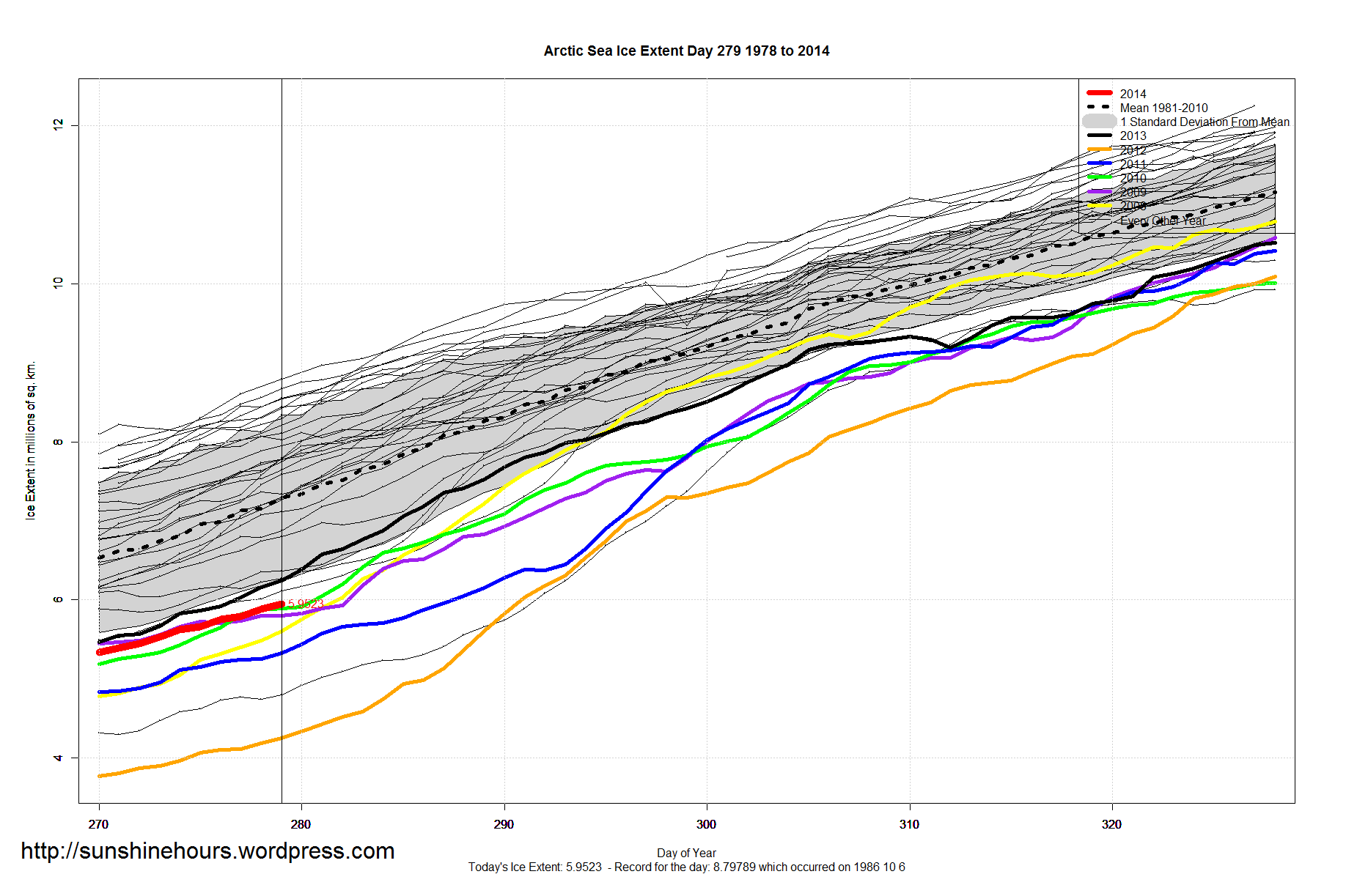 Arctic Sea Ice Extent Oct 07 2014 – -1.3 million sq km below Normal – But 1.7 million above 2012 Published on October 7, 2014October 7, 2014 by sunshinehours1 Arctic Sea Ice Extent Oct 07 2014 – -1,338,000 sq km below the 1981-2010 mean. Data for Day 279. Data here. Share this: Click to share on X (Opens in new window) X Click to share on Facebook (Opens in new window) Facebook Like Loading... Related