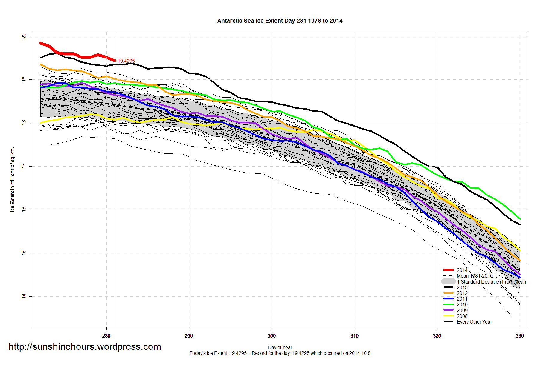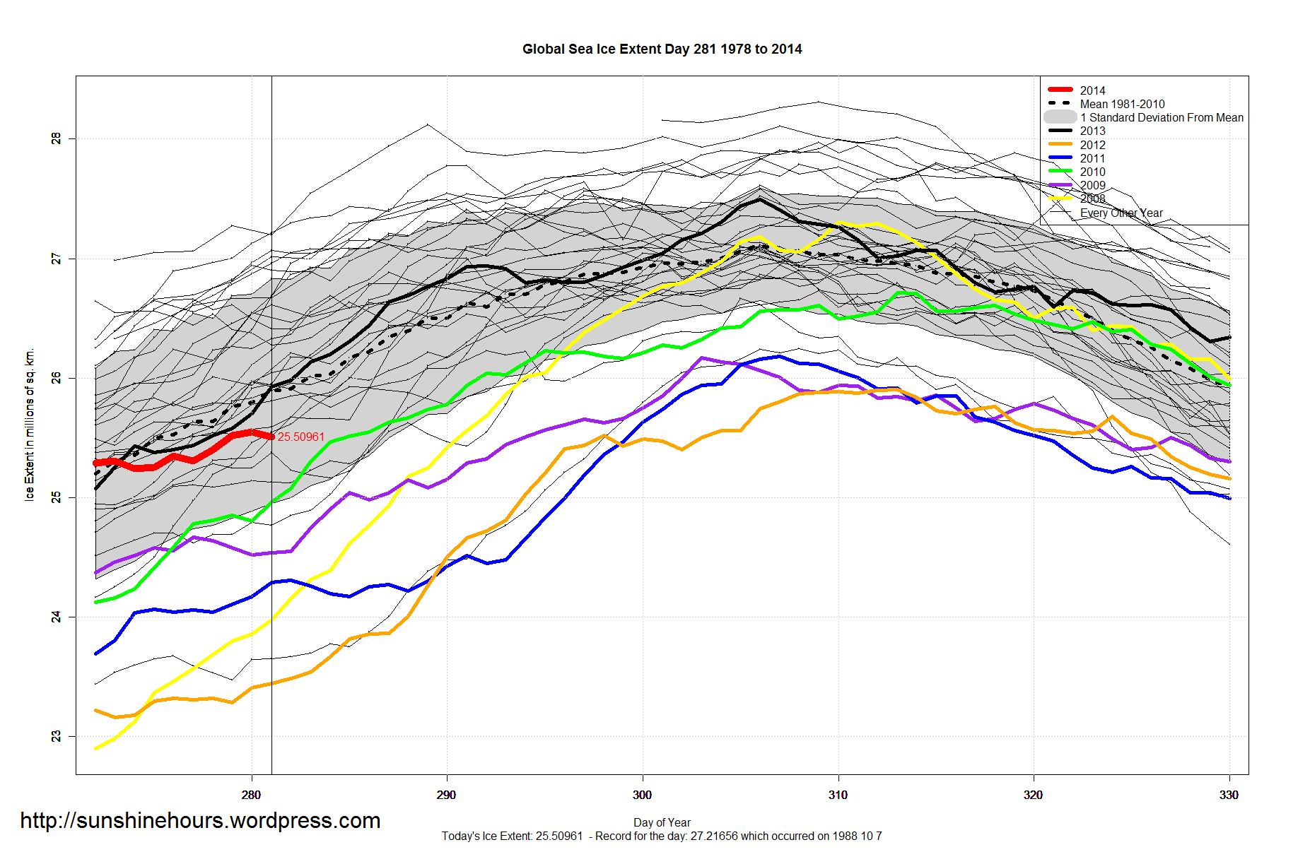 Sea Ice Extent – Day 281 Published on October 9, 2014 by sunshinehours1 Share this: Click to share on X (Opens in new window) X Click to share on Facebook (Opens in new window) Facebook Like Loading... Related