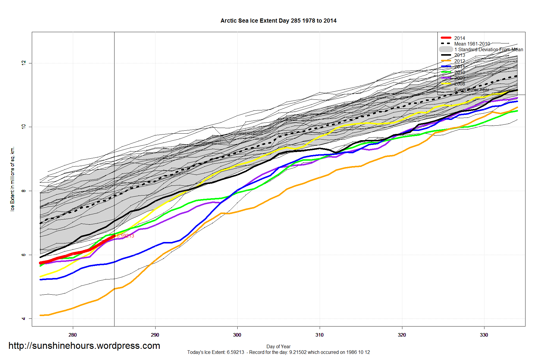 Day 286: MASIE extent grows by 220,000 in the last 2 days to 6.86 M Km2 or 44% of March max. Most regions with ice remaining are recovering strongly: