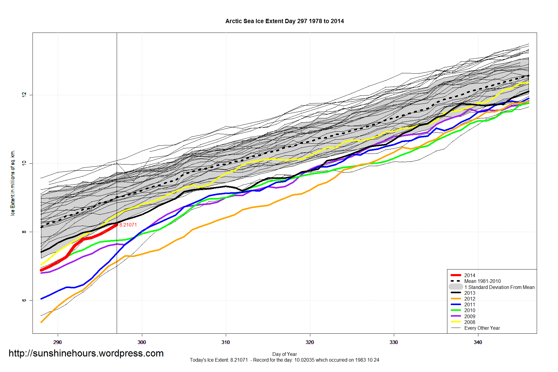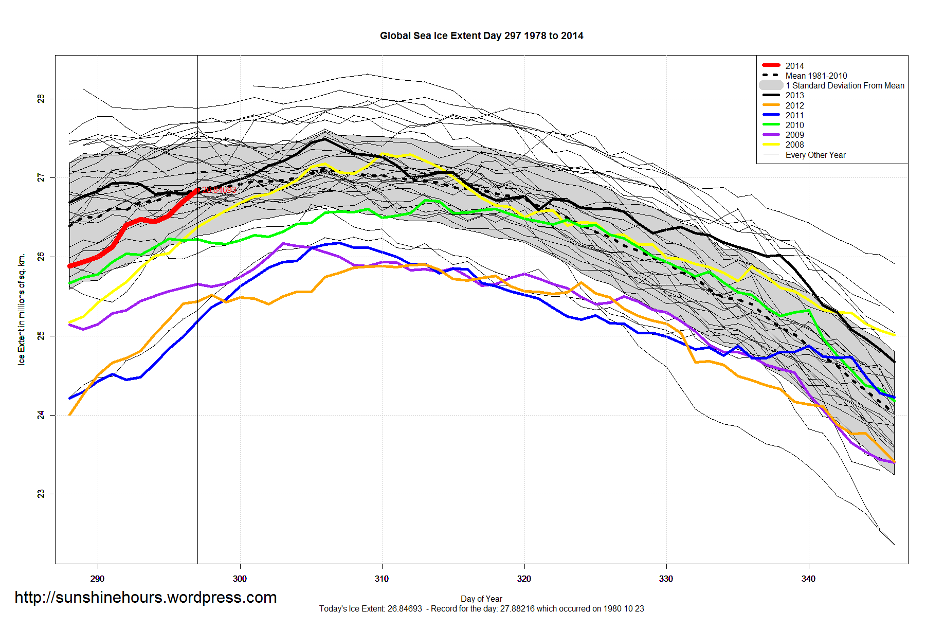 Sea Ice Extent – Day 297 – Global Sea Ice Higher Than 1984 1986 1987 1991 1995 1997 and more Published on October 25, 2014 by sunshinehours1 Share this: Click to share on X (Opens in new window) X Click to share on Facebook (Opens in new window) Facebook Like Loading... Related