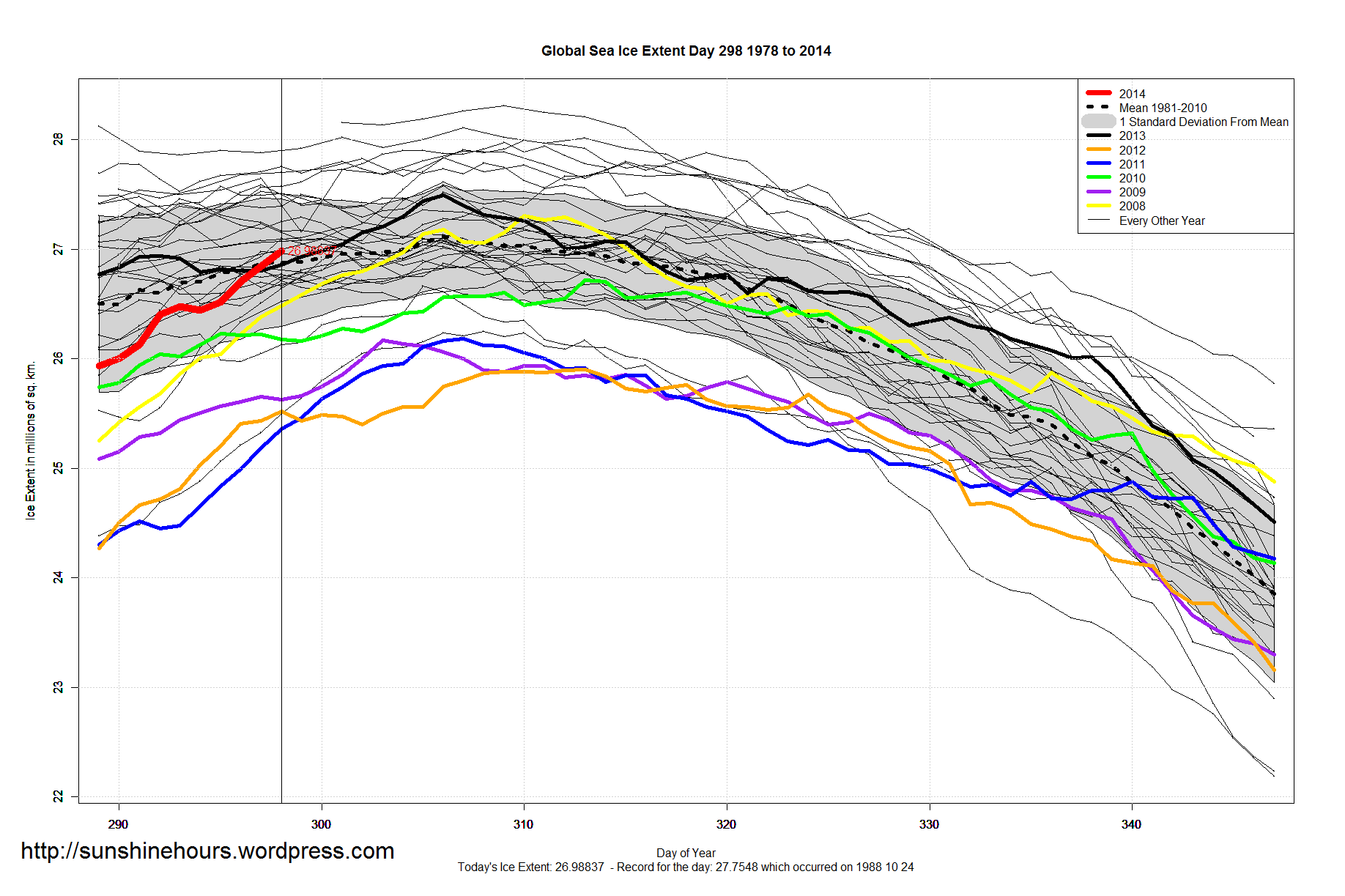 Sea Ice Extent – Day 298 – Arctic Within One Std Dev Published on October 26, 2014 by sunshinehours1 Share this: Click to share on X (Opens in new window) X Click to share on Facebook (Opens in new window) Facebook Like Loading... Related