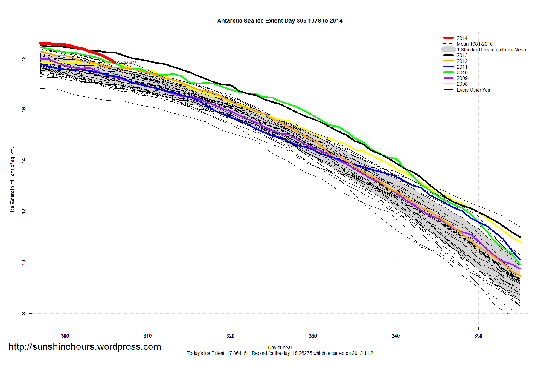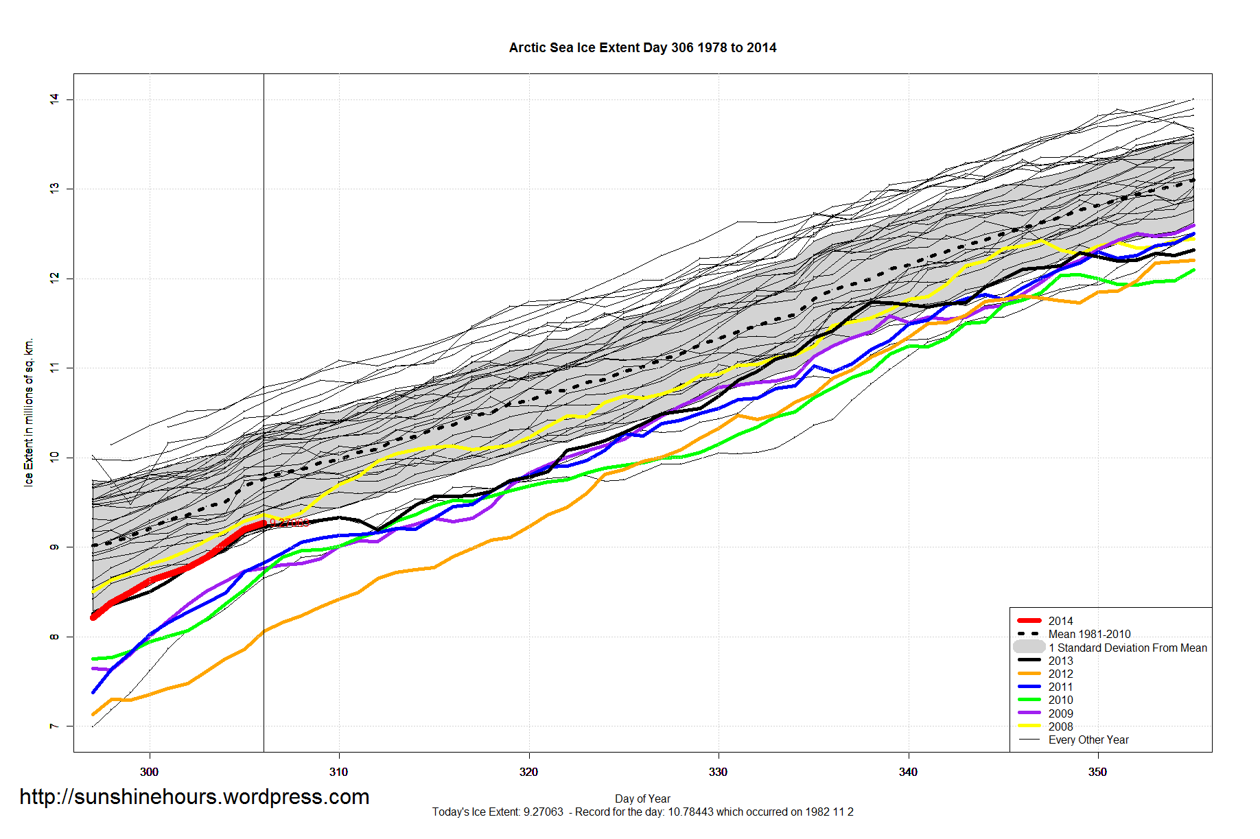 1. Day 306: In the last two days MASIE extent grew by 123,000 Km2 to 9.55 M Km2 or 62% of last March max.