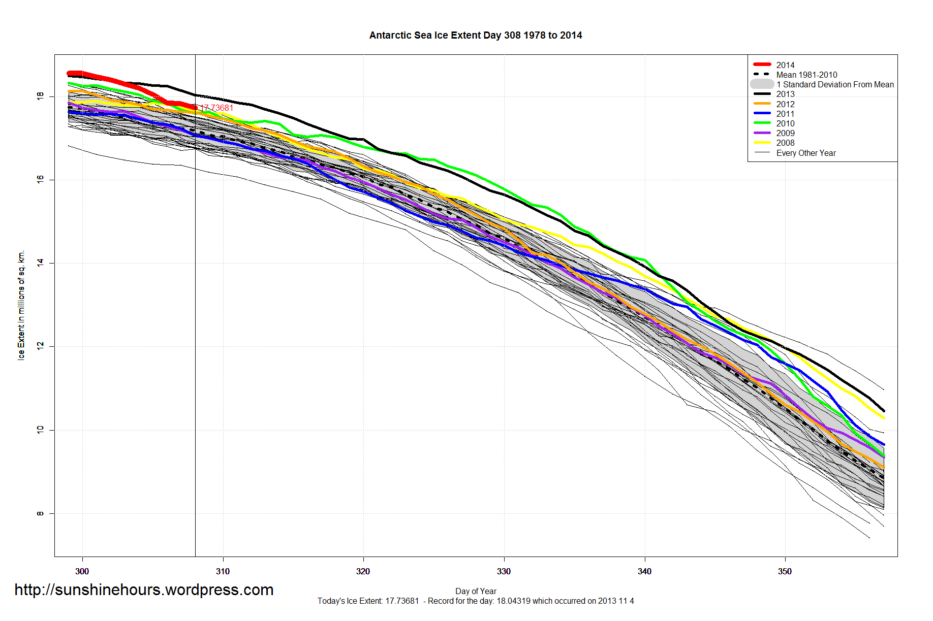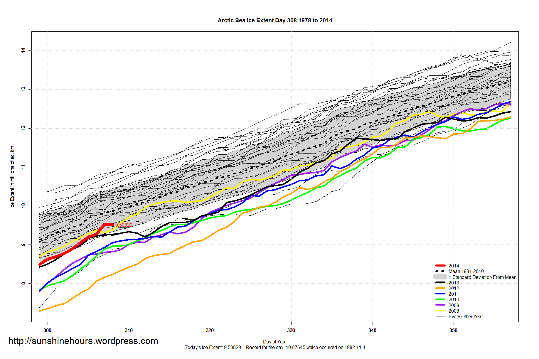 Day 308: In the last two days MASIE extent grew by 215,000 Km2 to 9.77 M Km2 or 62% of last March max.