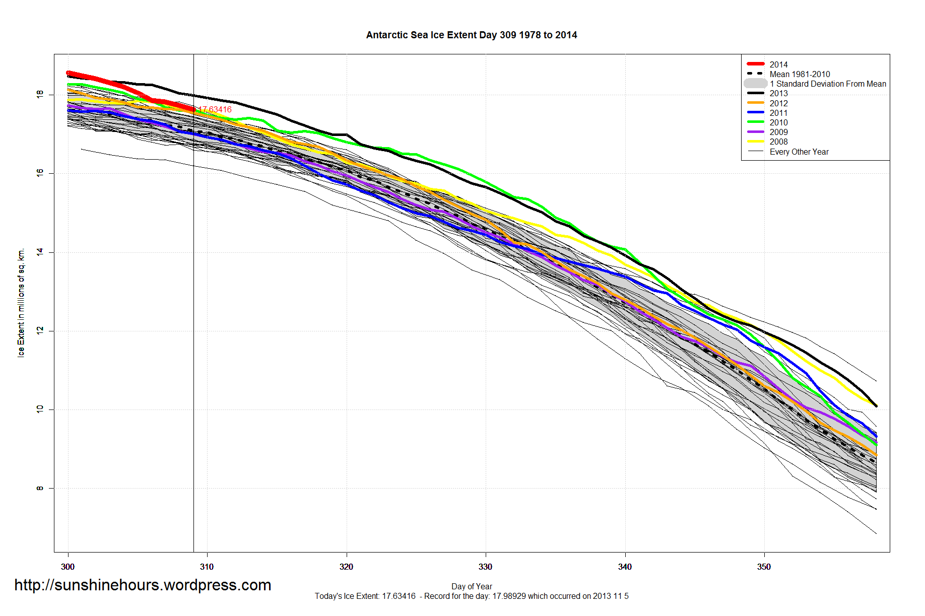 Sea Ice Extent – Day 309 – Global Sea Ice 12th Day In A Row Above ‘Normal’ Published on November 6, 2014 by sunshinehours1 Share this: Click to share on X (Opens in new window) X Click to share on Facebook (Opens in new window) Facebook Like Loading... Related