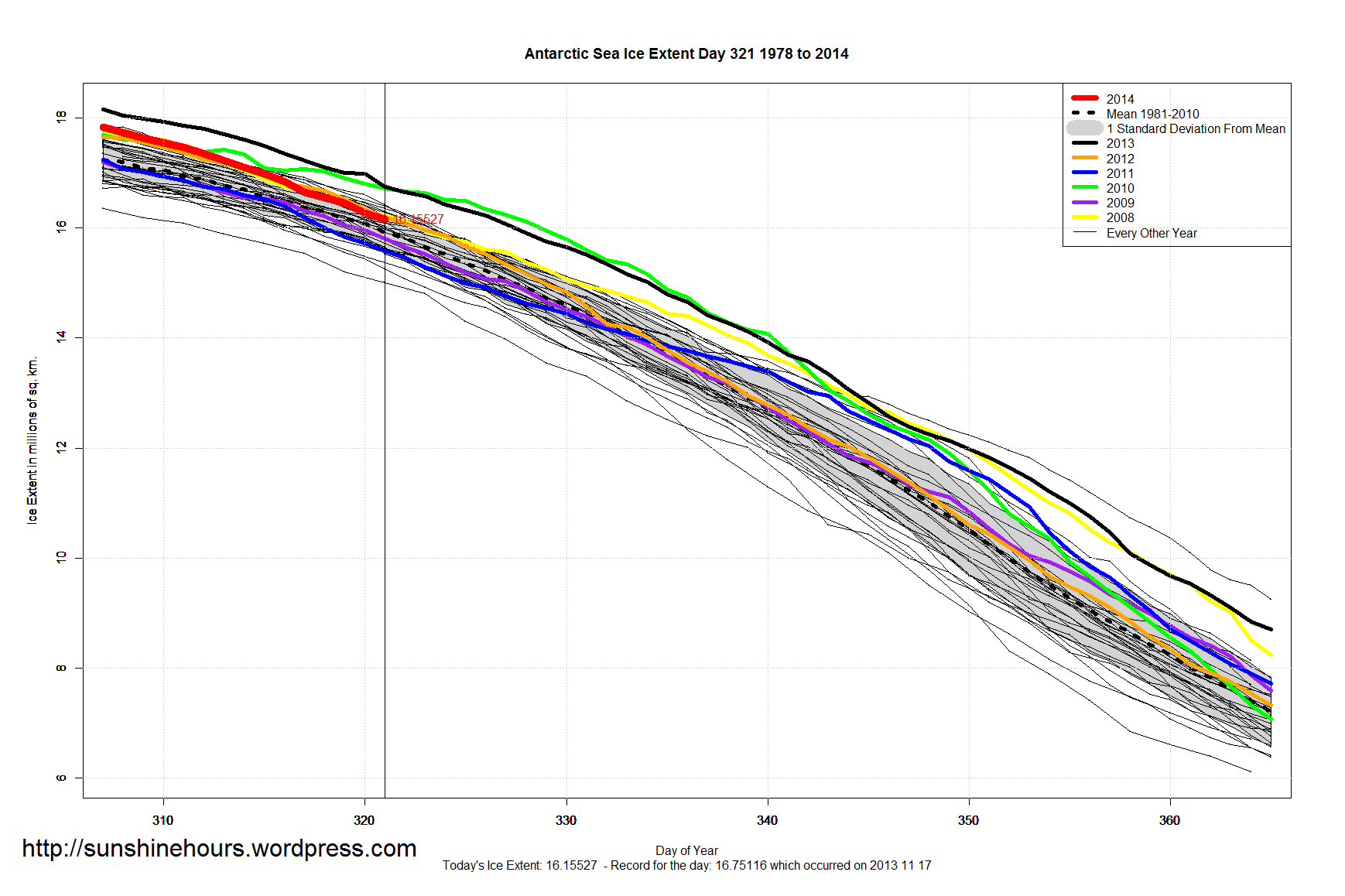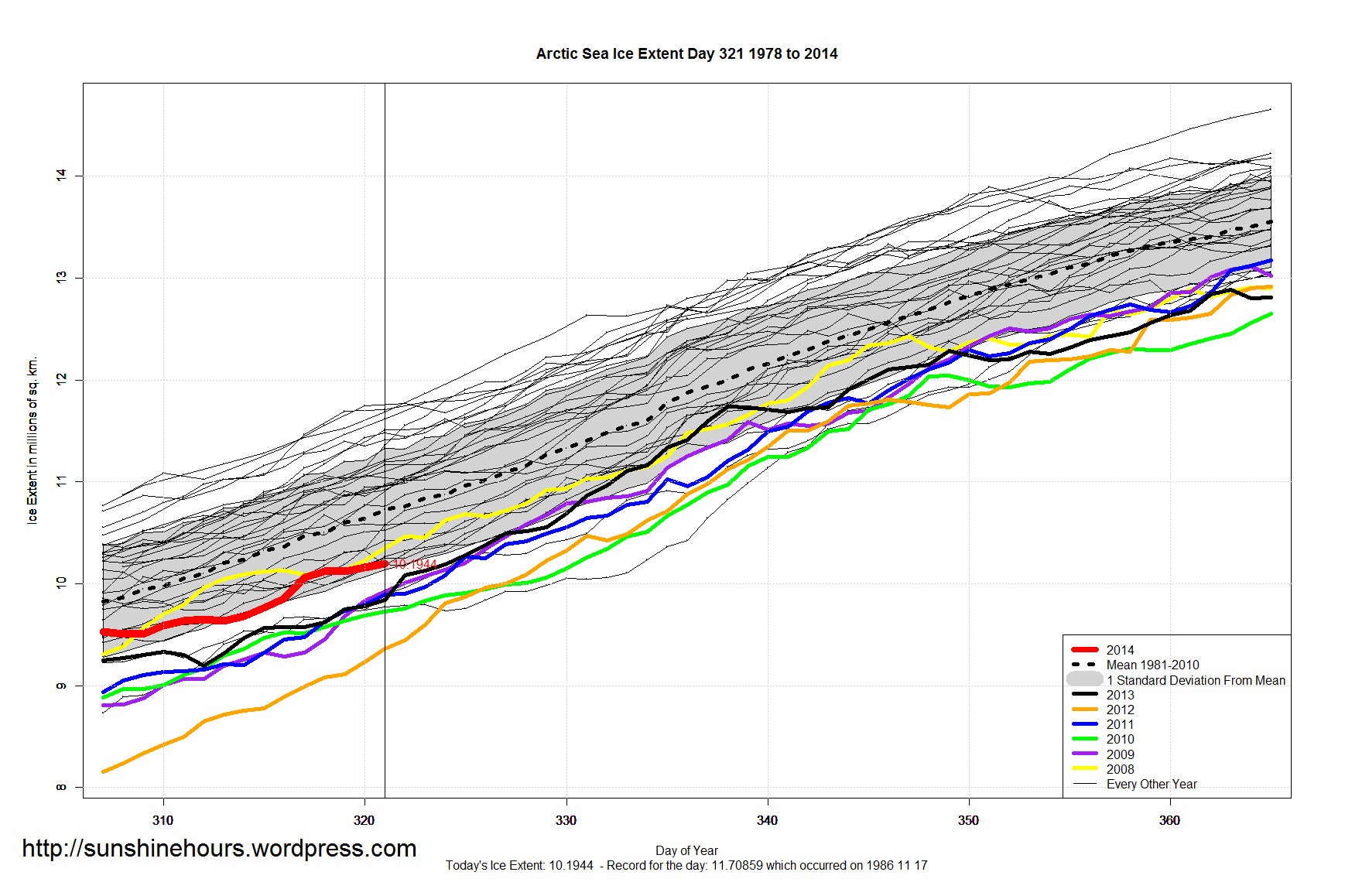 Sea Ice Extent – Day 321 Published on November 18, 2014 by sunshinehours1 Share this: Click to share on X (Opens in new window) X Click to share on Facebook (Opens in new window) Facebook Like Loading... Related