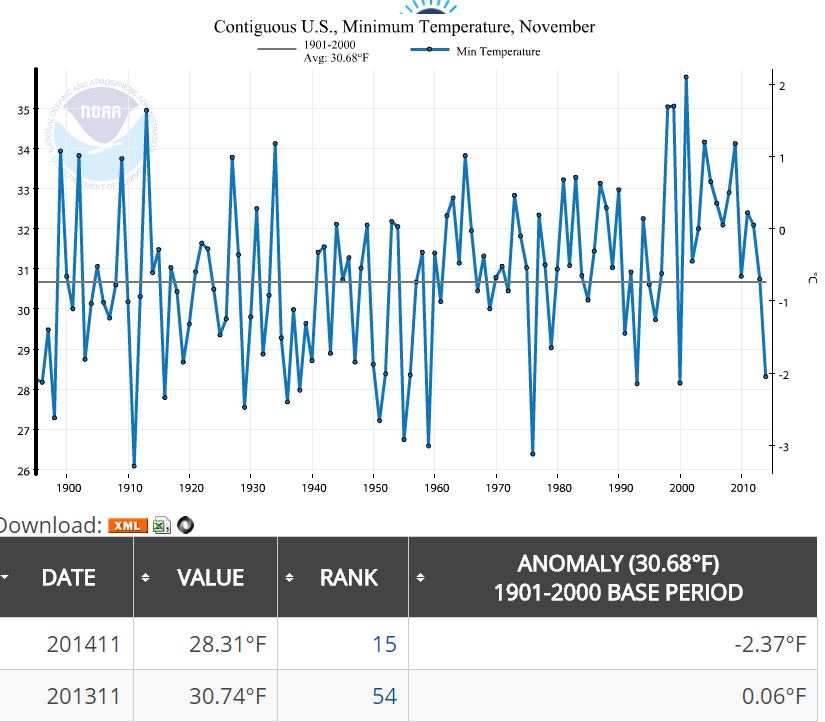 One thought on “USA NOAA November 2014 – 15th Coldest Minimum Temperature”