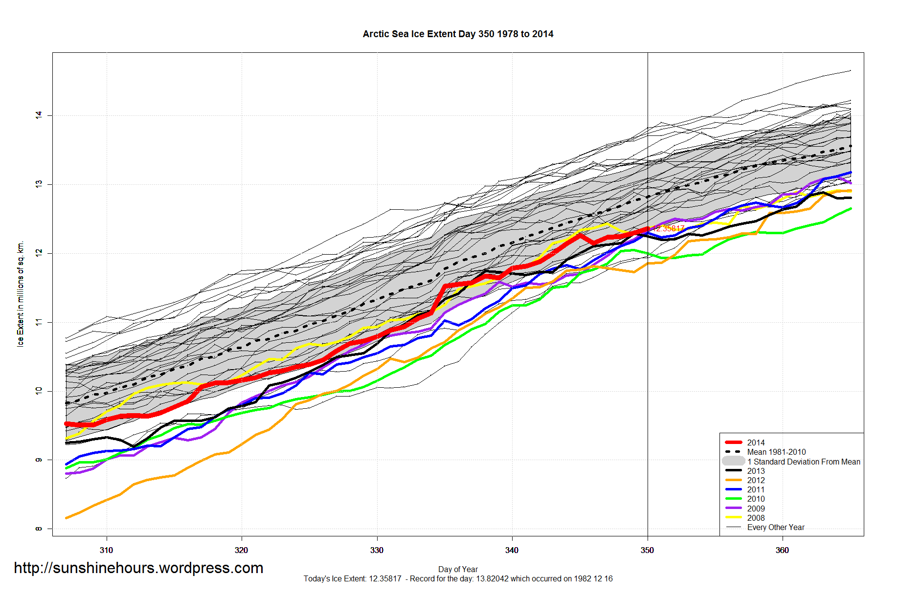 Sea Ice Extent – Day 350 Published on December 17, 2014 by sunshinehours1 Share this: Click to share on X (Opens in new window) X Click to share on Facebook (Opens in new window) Facebook Like Loading... Related
