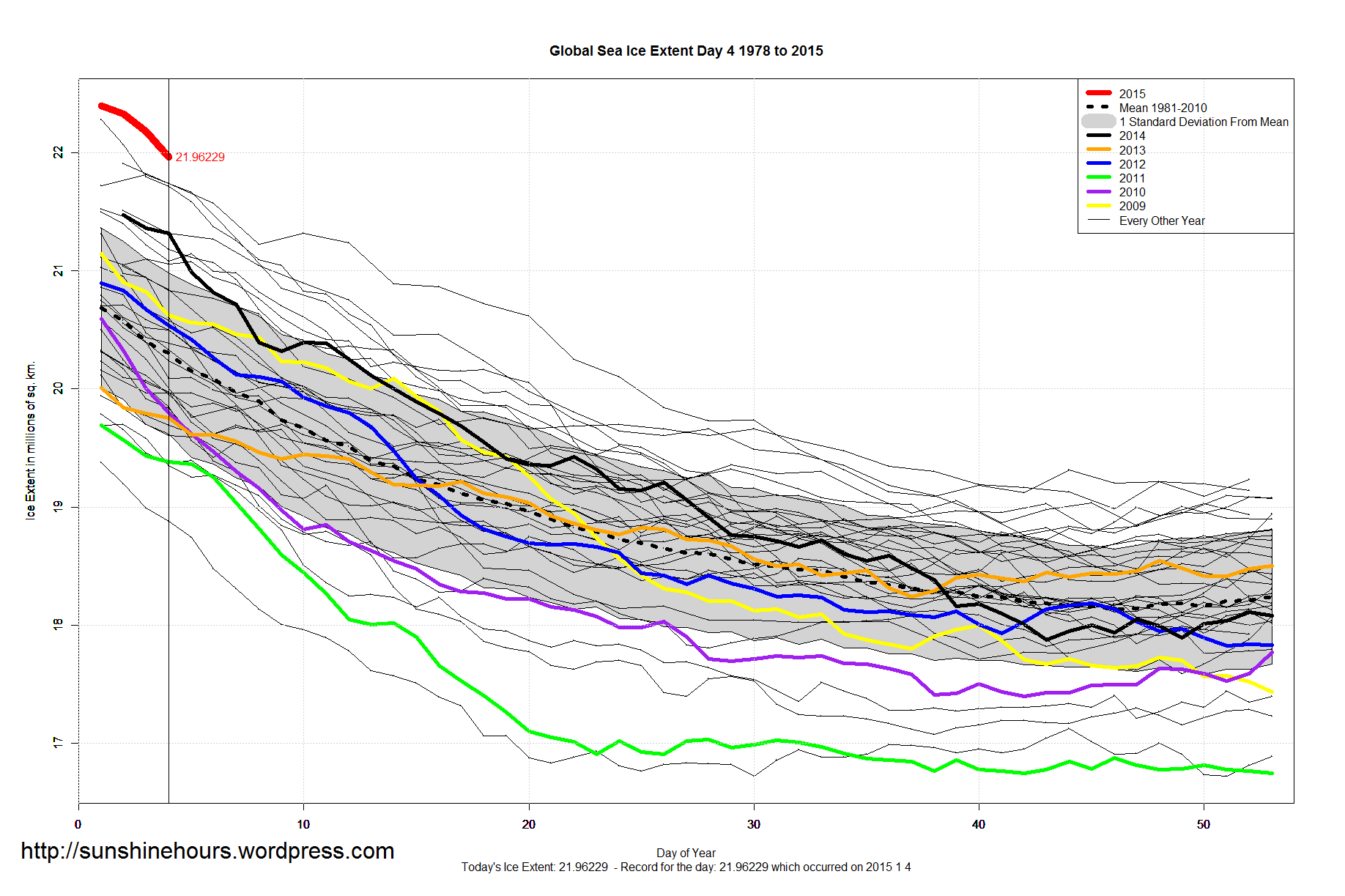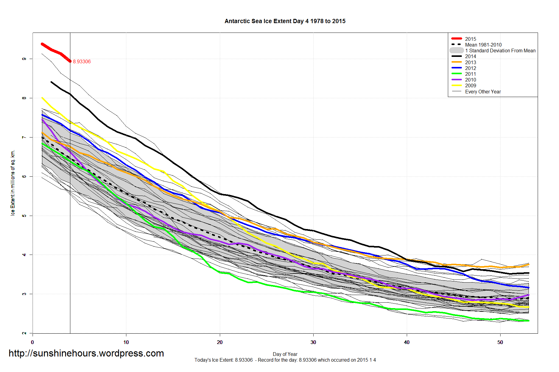 Sea Ice Extent – Day 4 – Extraordinary Antarctic/Global Sea Ice Published on January 5, 2015 by sunshinehours1 Data: South / North Share this: Click to share on X (Opens in new window) X Click to share on Facebook (Opens in new window) Facebook Like Loading... Related