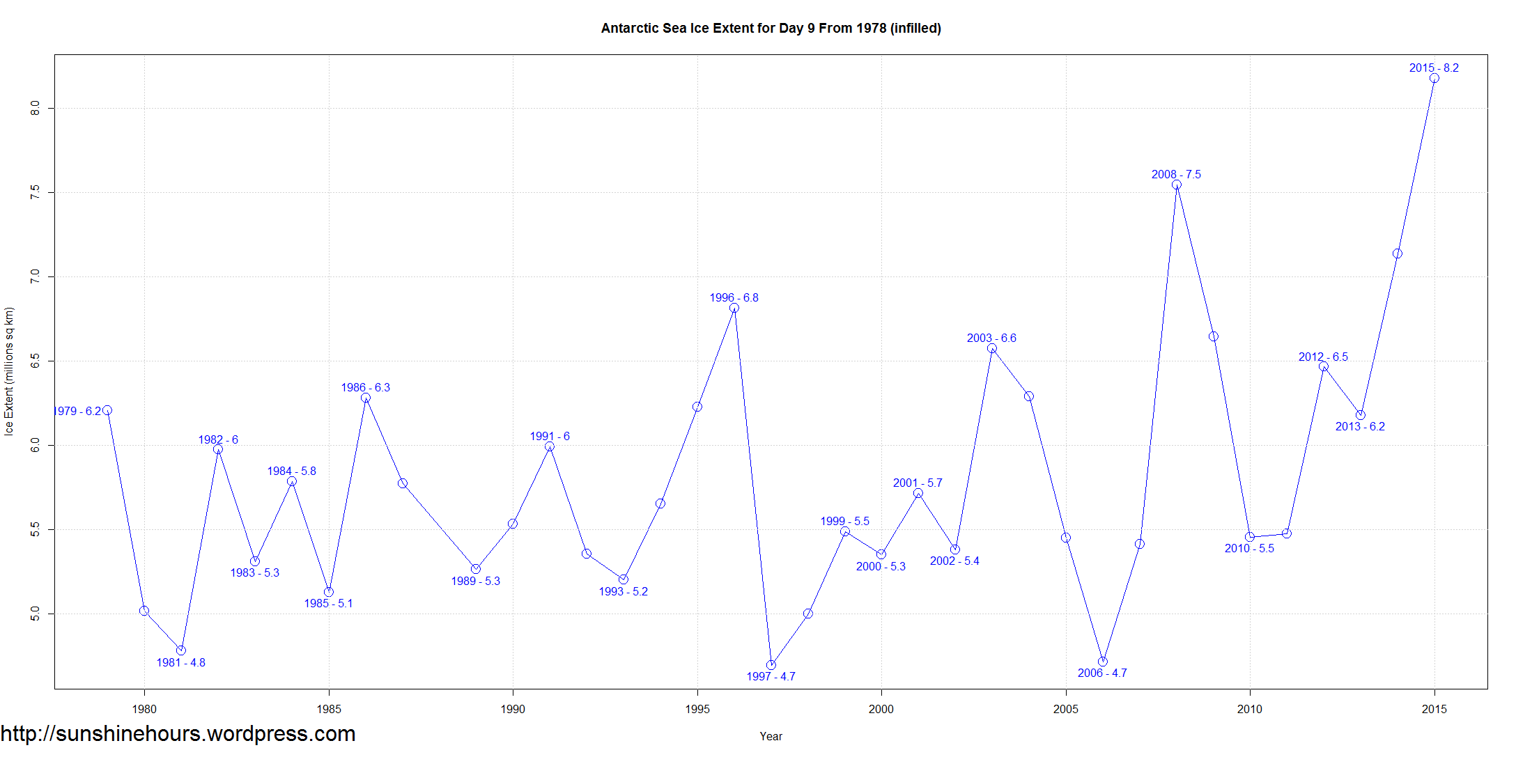 Exactly, we do need more satellite data. But compare the effects of adding more CO2 to the atmosphere ABOVE that of “historical” levels, versus that of direct solar irradiance on ocean surfaces and what’s being reflected back by the Antarctic sea ice extent. Which of the two adds or subtracts more from the net annual solar energy gain? I say increased albedo effect far outpaces that of a few ten-thousandths more CO2.