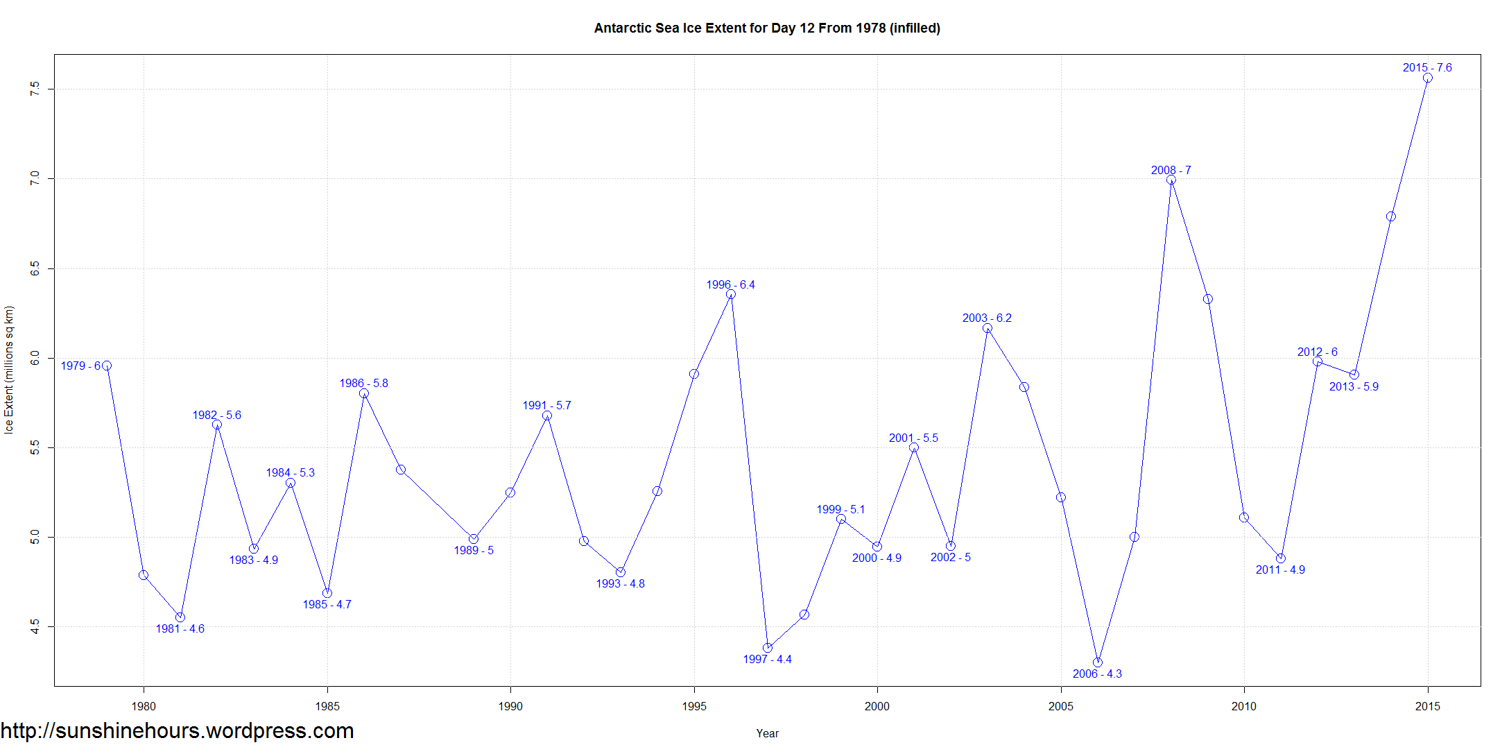 12 daily records in a row in 2015 for Antarctica. Antarctic Sea Ice Extent Breaks Daily Record By 600,000 sq km.
