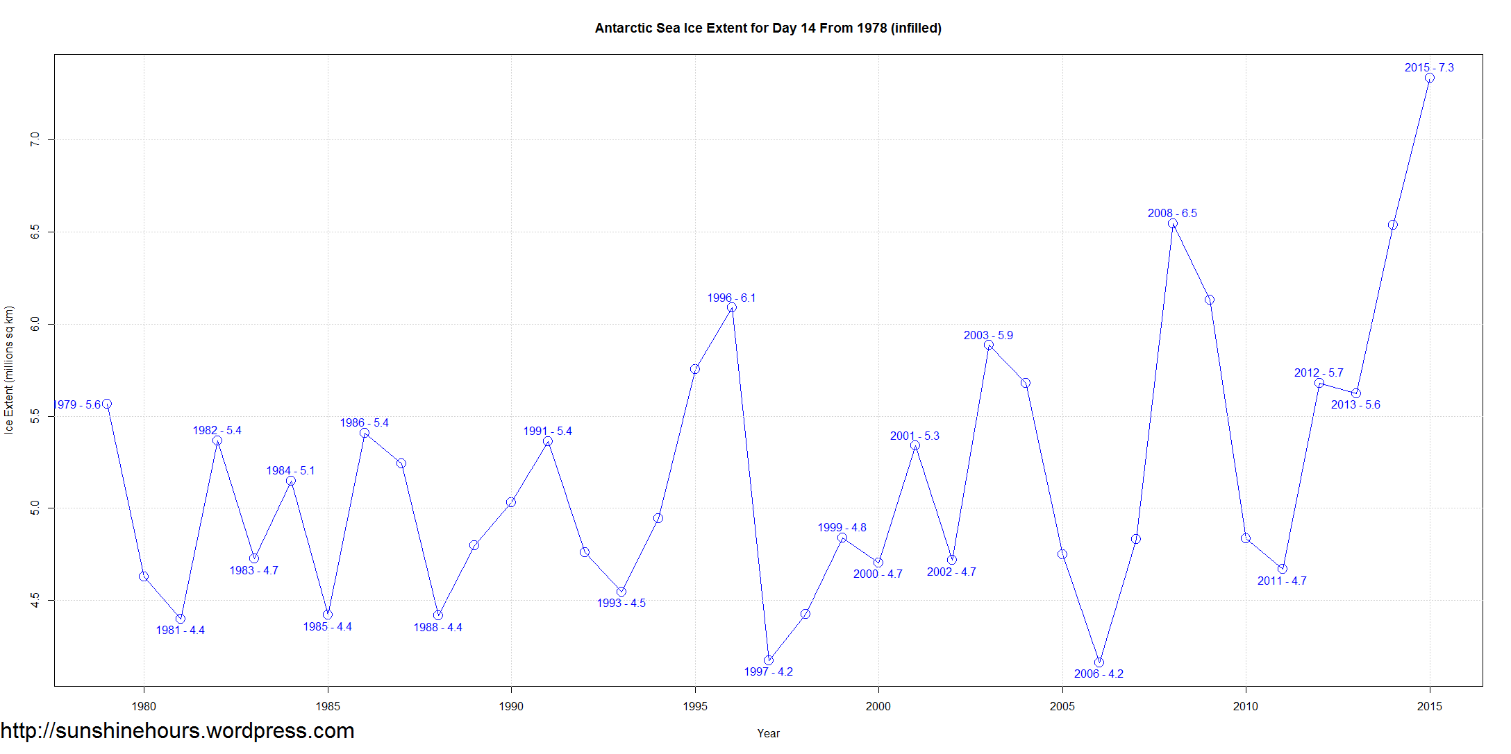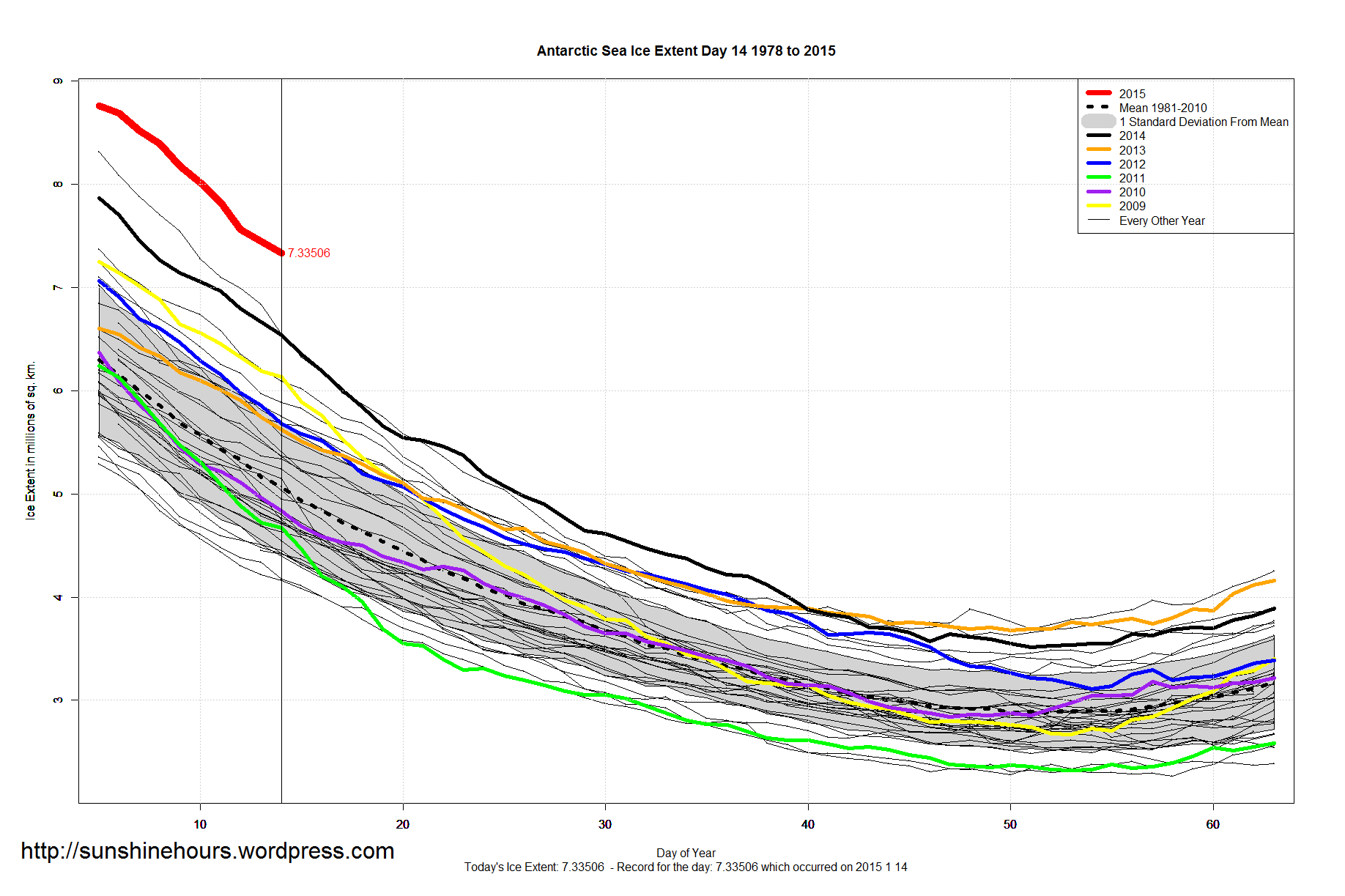 14 daily records in a row in 2015 for Antarctica. Antarctic Sea Ice Extent Breaks Daily Record By Almost 800,000 sq km.