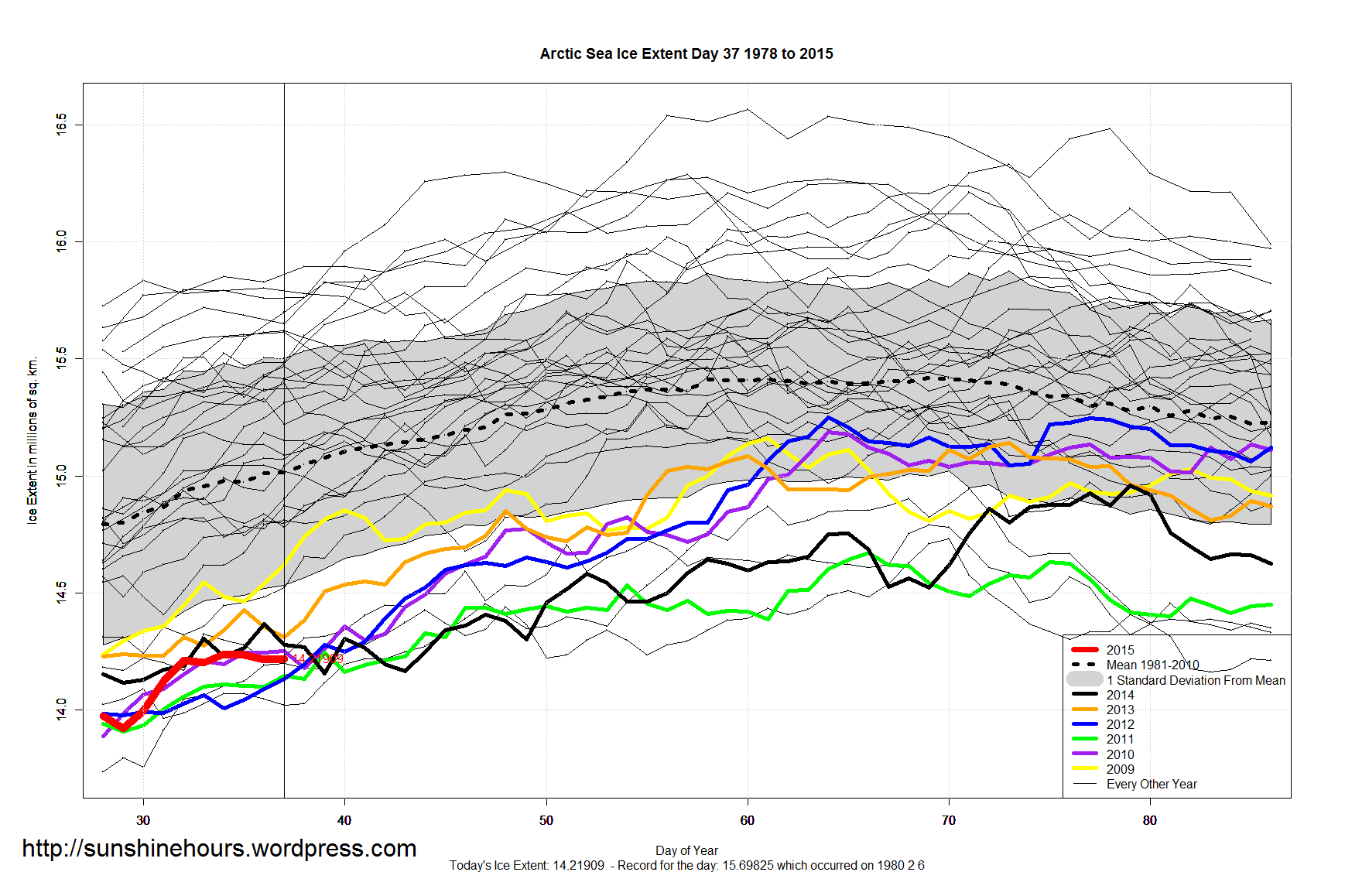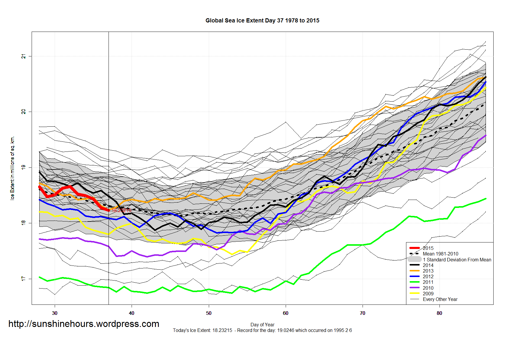 Sea Ice Extent – Day 37 – Antarctica 700,000 sq km Above Mean Published on February 7, 2015 by sunshinehours1 Data: South / North Share this: Click to share on X (Opens in new window) X Click to share on Facebook (Opens in new window) Facebook Like Loading... Related