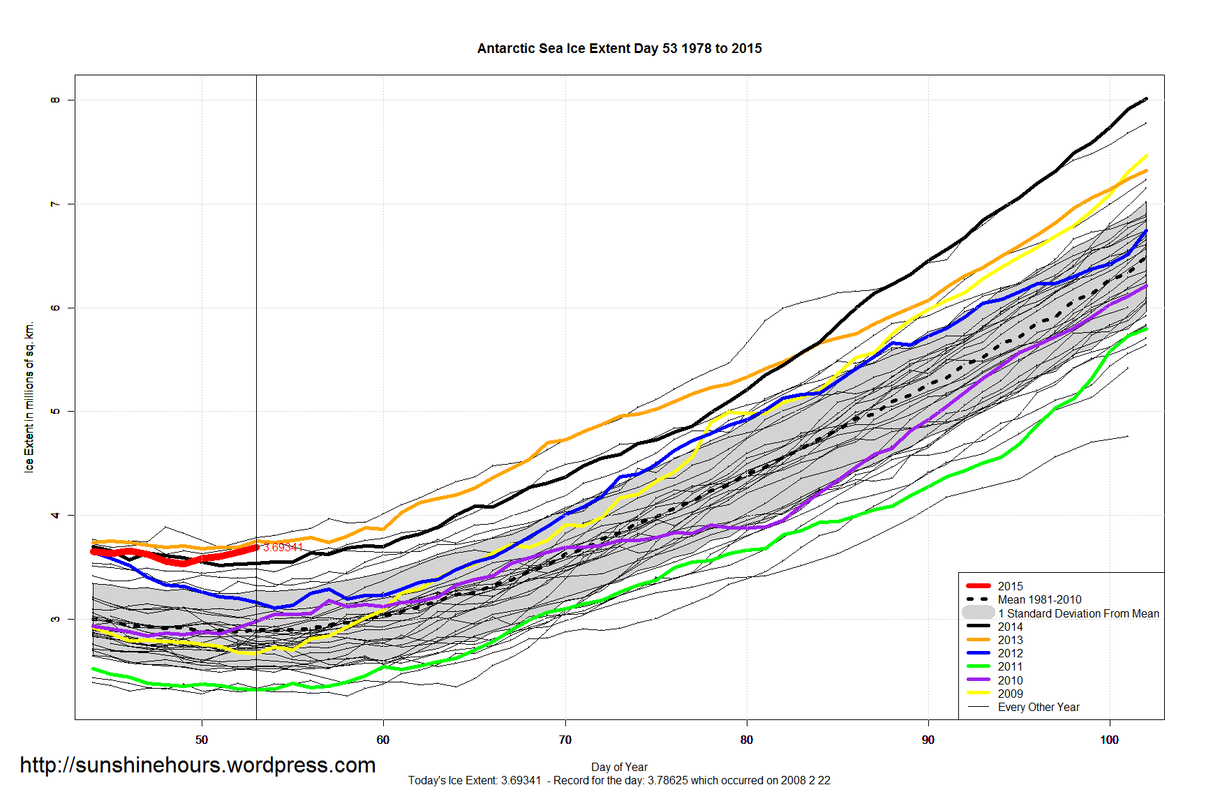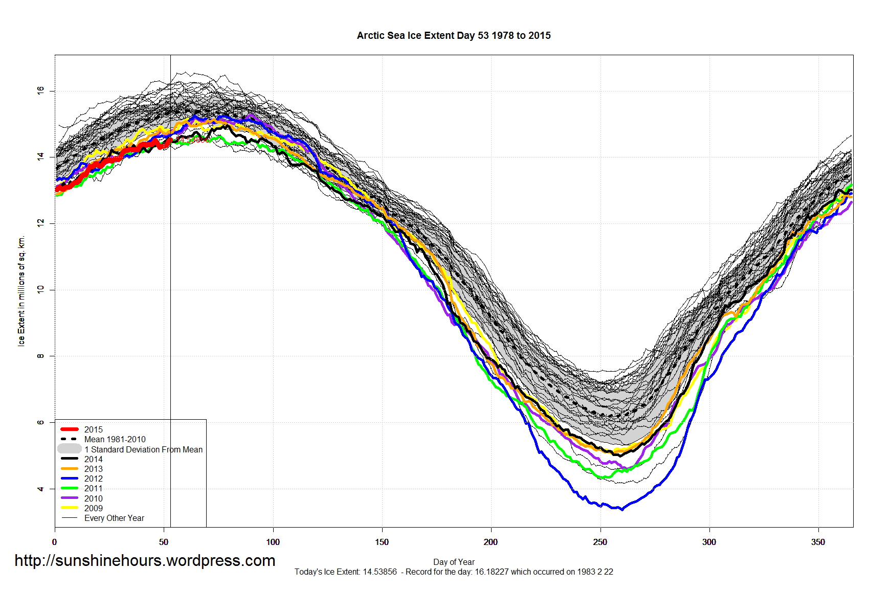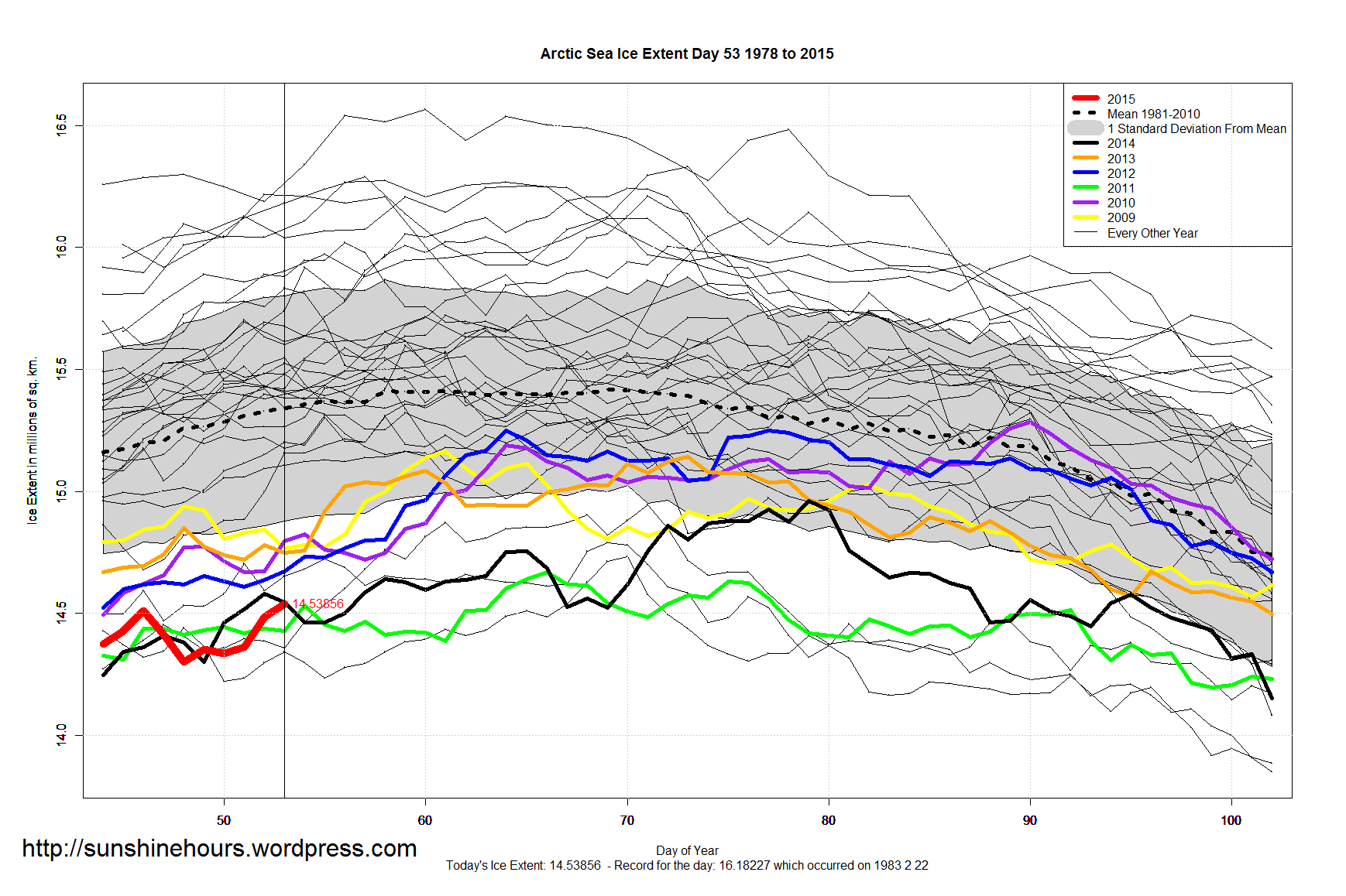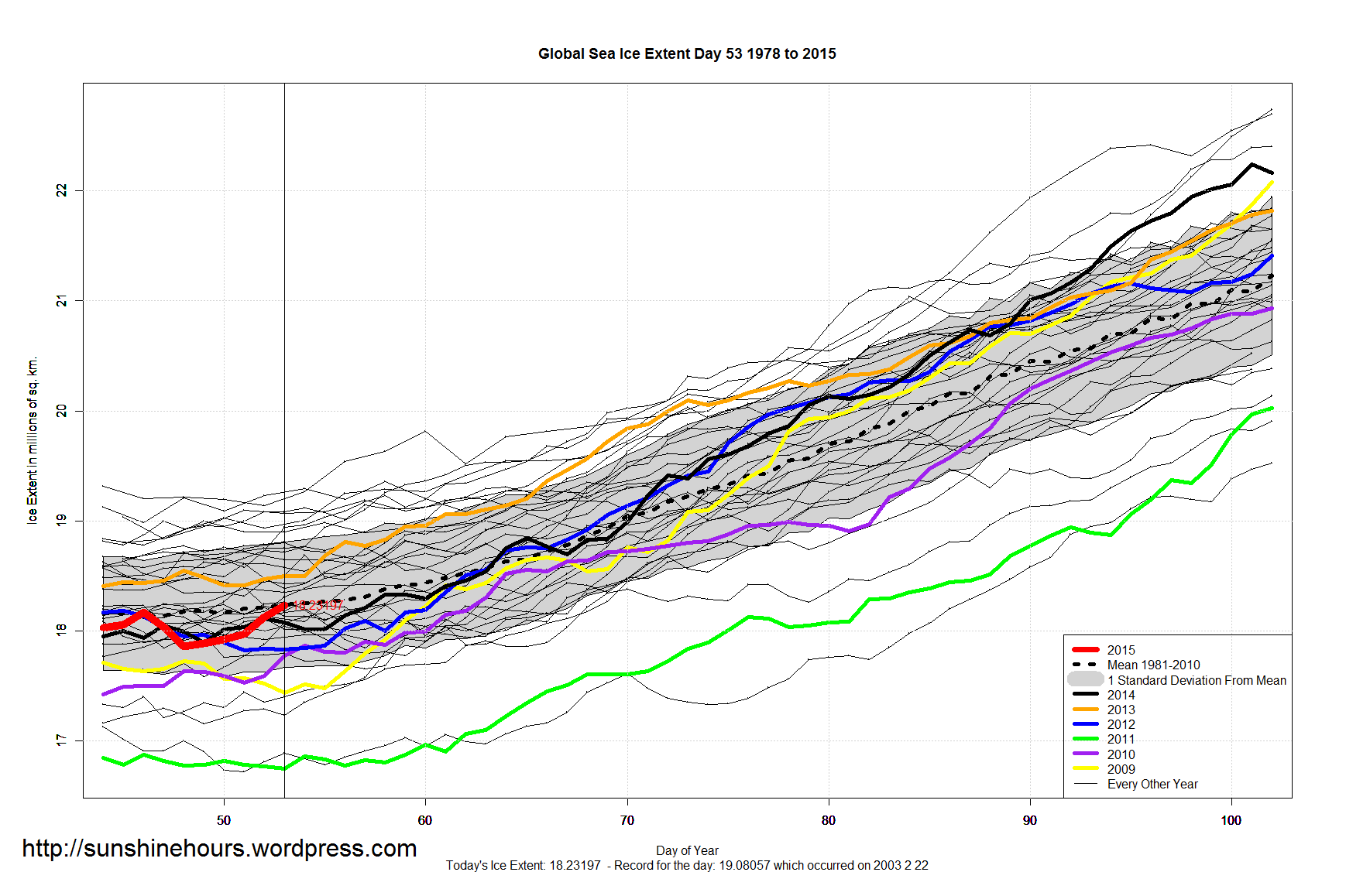 Sea Ice Extent – Day 53 – Global Back to ‘Normal’ Published on February 23, 2015 by sunshinehours1 Data: South / North Share this: Click to share on X (Opens in new window) X Click to share on Facebook (Opens in new window) Facebook Like Loading... Related