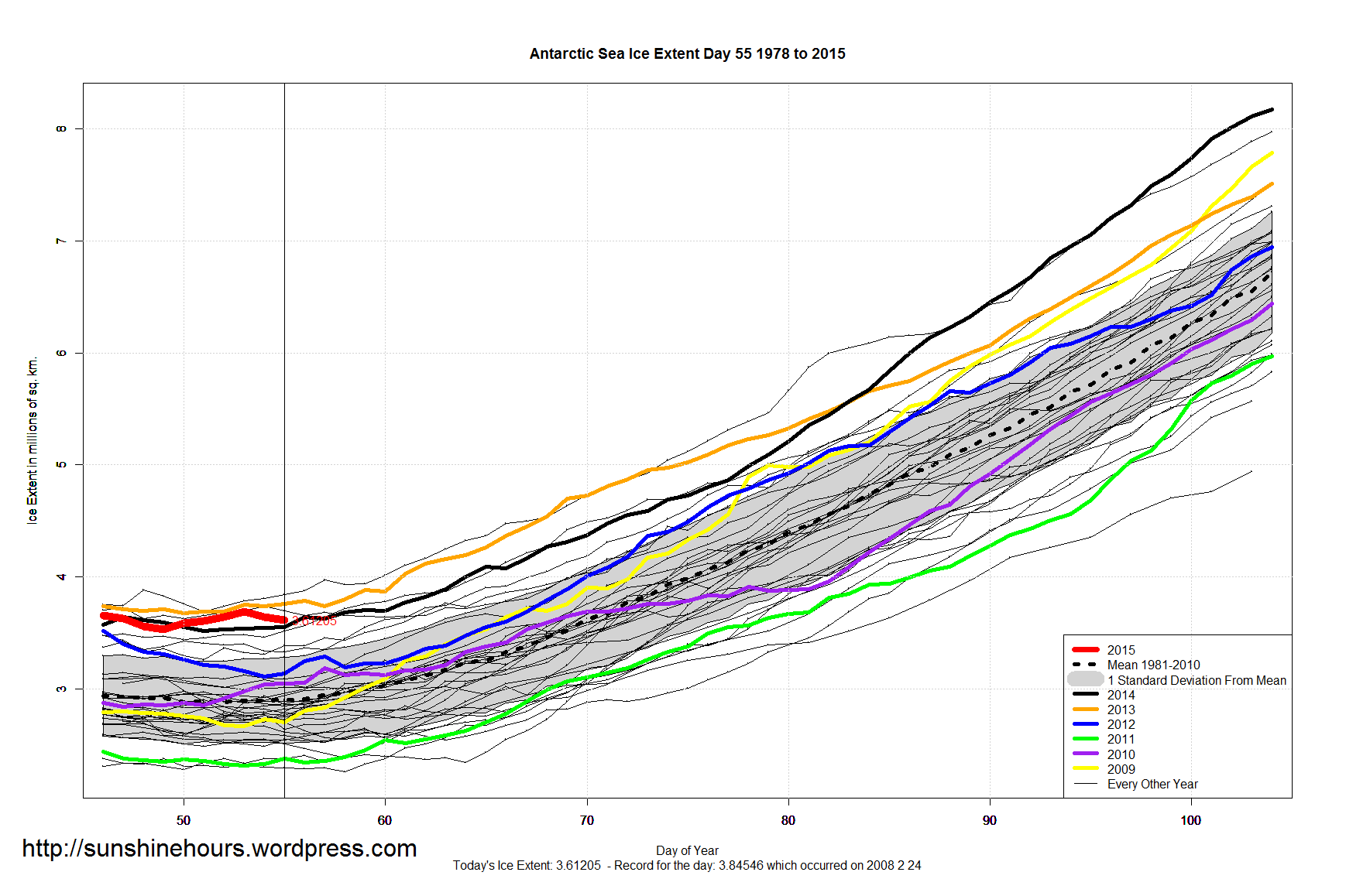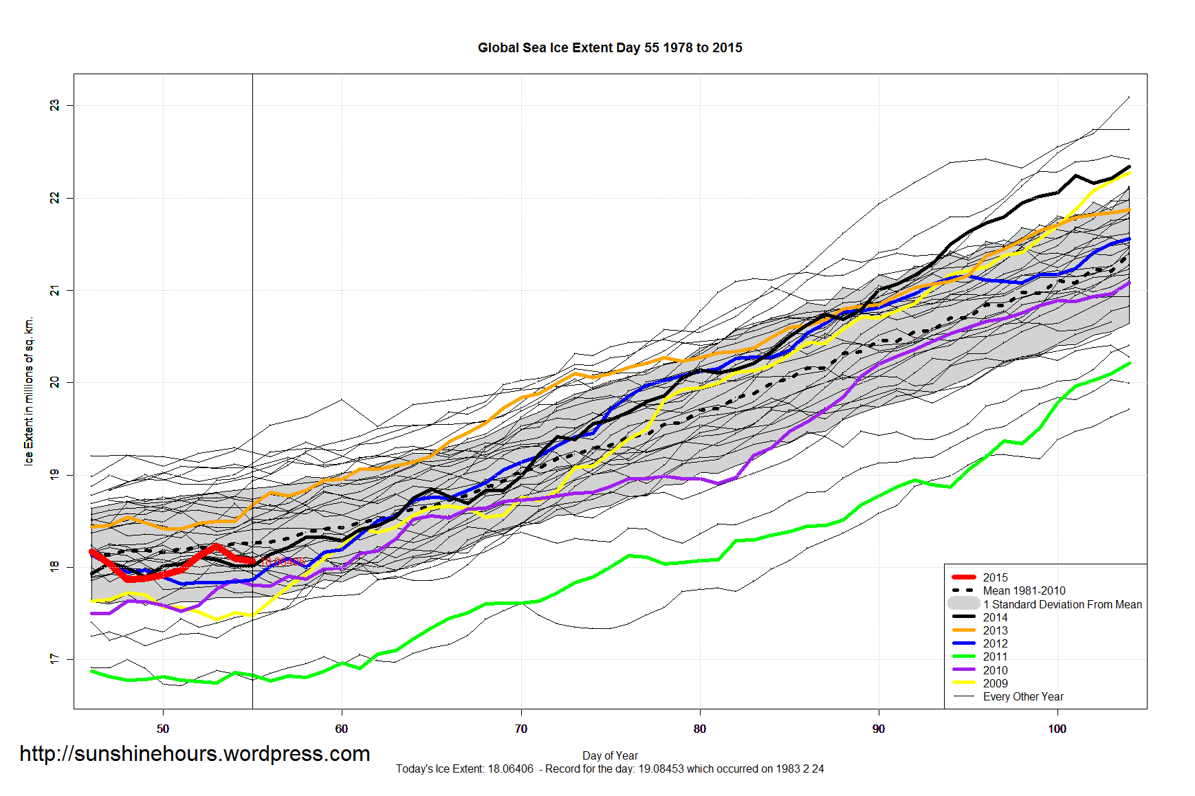 Sea Ice Extent – Day 55 Published on February 25, 2015 by sunshinehours1 Data: South / North Share this: Click to share on X (Opens in new window) X Click to share on Facebook (Opens in new window) Facebook Like Loading... Related