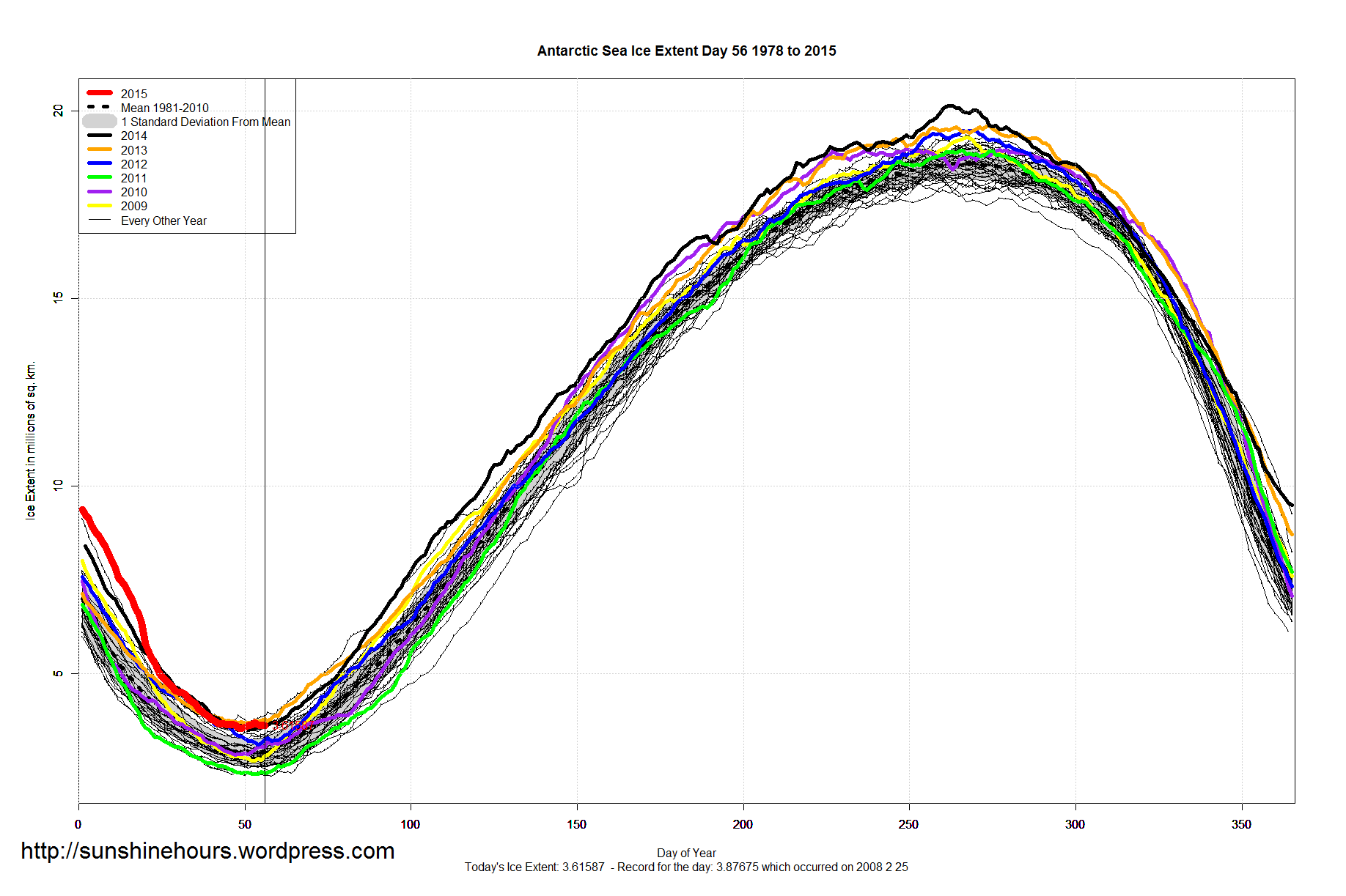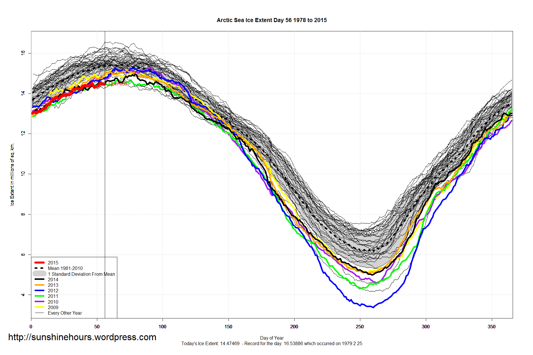 Sea Ice Extent – Day 56 Published on February 26, 2015 by sunshinehours1 The annual view today: Data: South / North Share this: Click to share on X (Opens in new window) X Click to share on Facebook (Opens in new window) Facebook Like Loading... Related