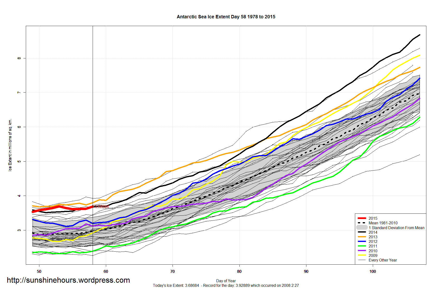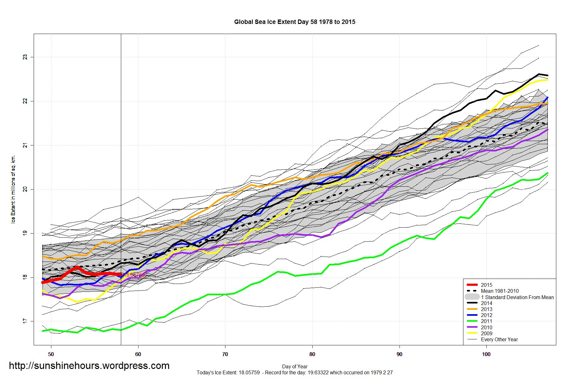 Sea Ice Extent – Day 58 Published on February 28, 2015 by sunshinehours1 Data: South / North Share this: Click to share on X (Opens in new window) X Click to share on Facebook (Opens in new window) Facebook Like Loading... Related