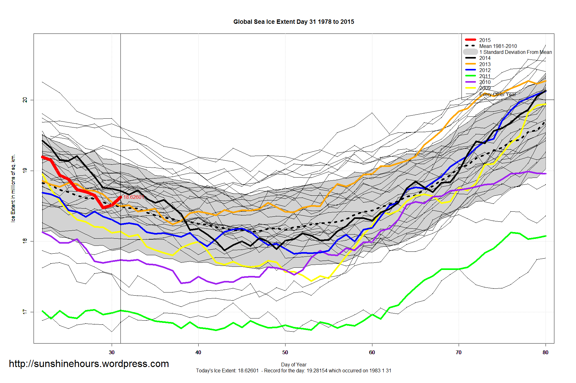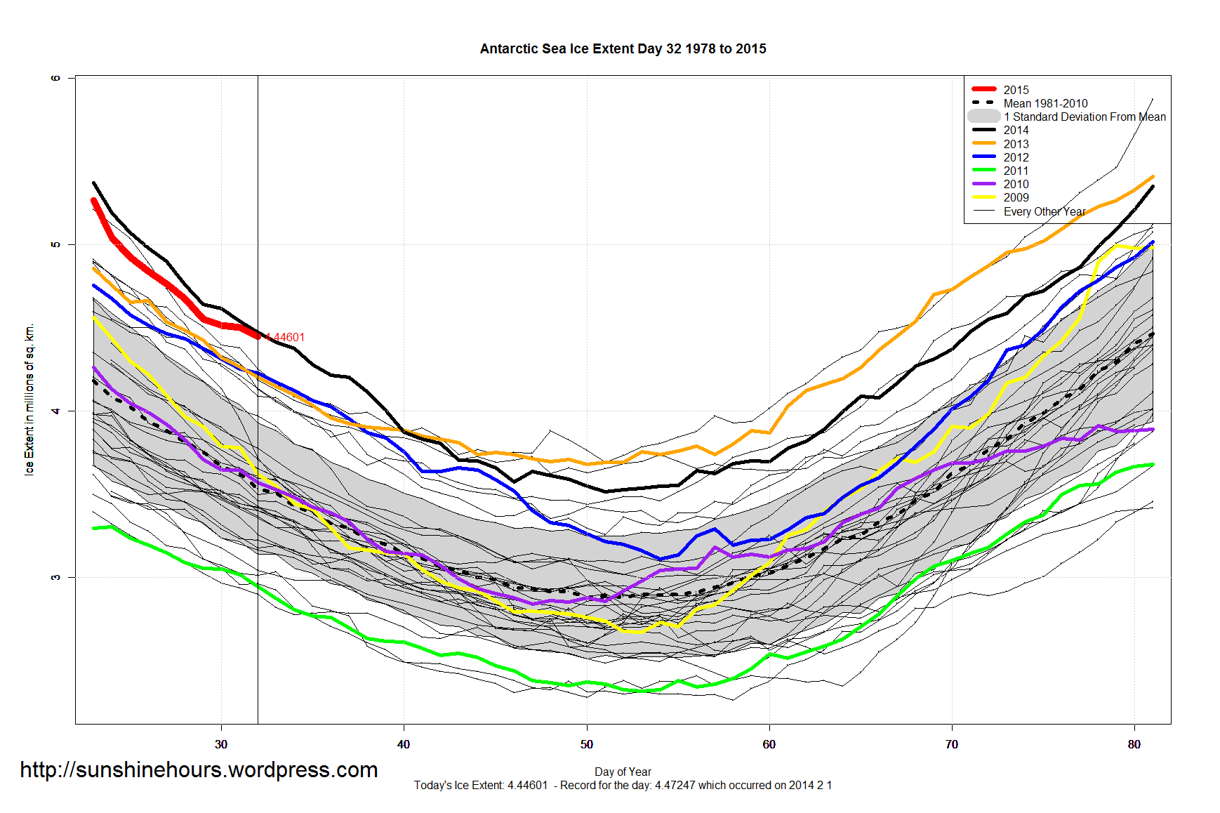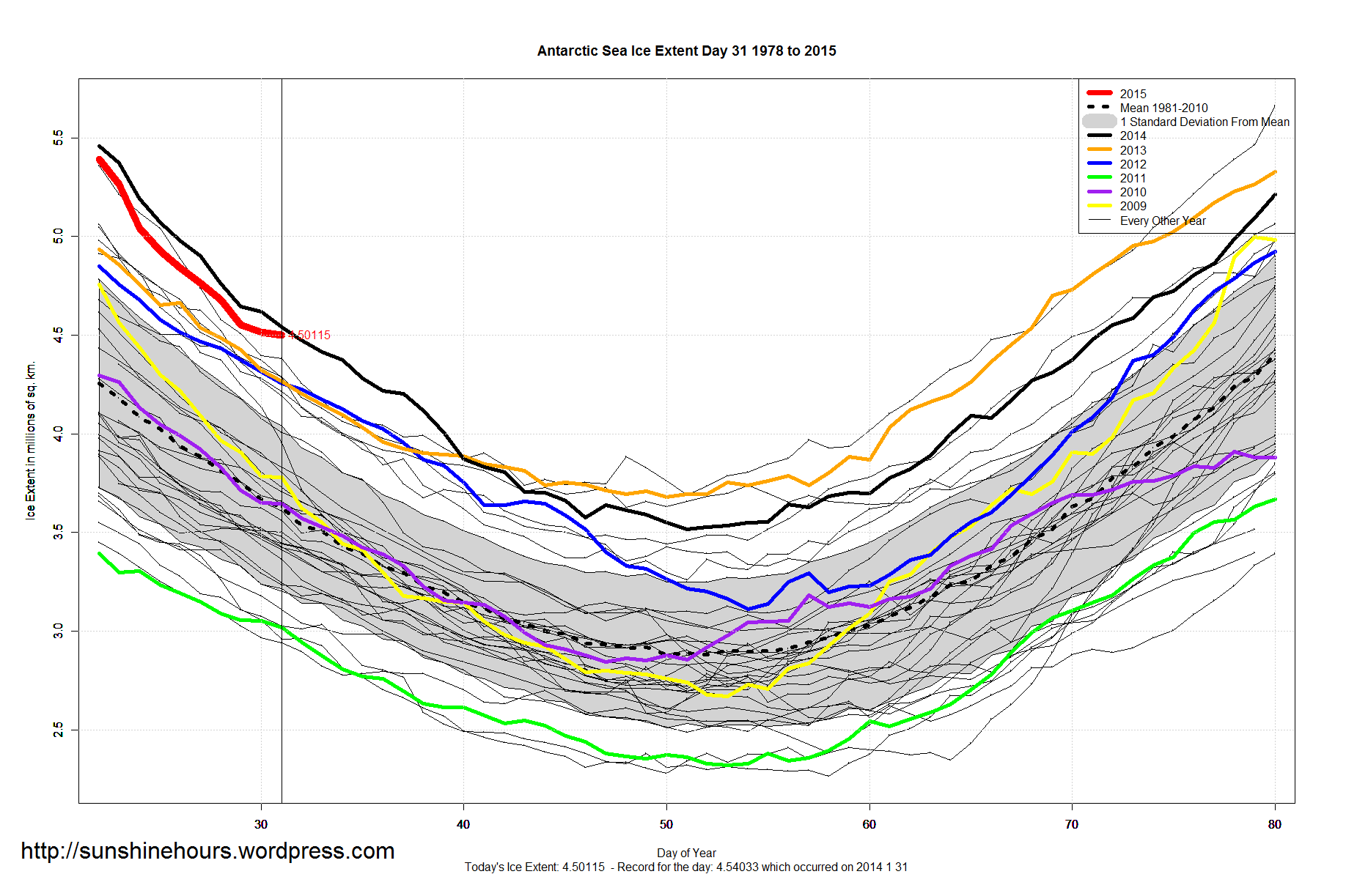 Normally (as you can see from the graph below) at this time of year Antarctic Sea Ice is high one or two years and then drops as much as 1.3 million sq km to a low (even a new) low and then repeats.