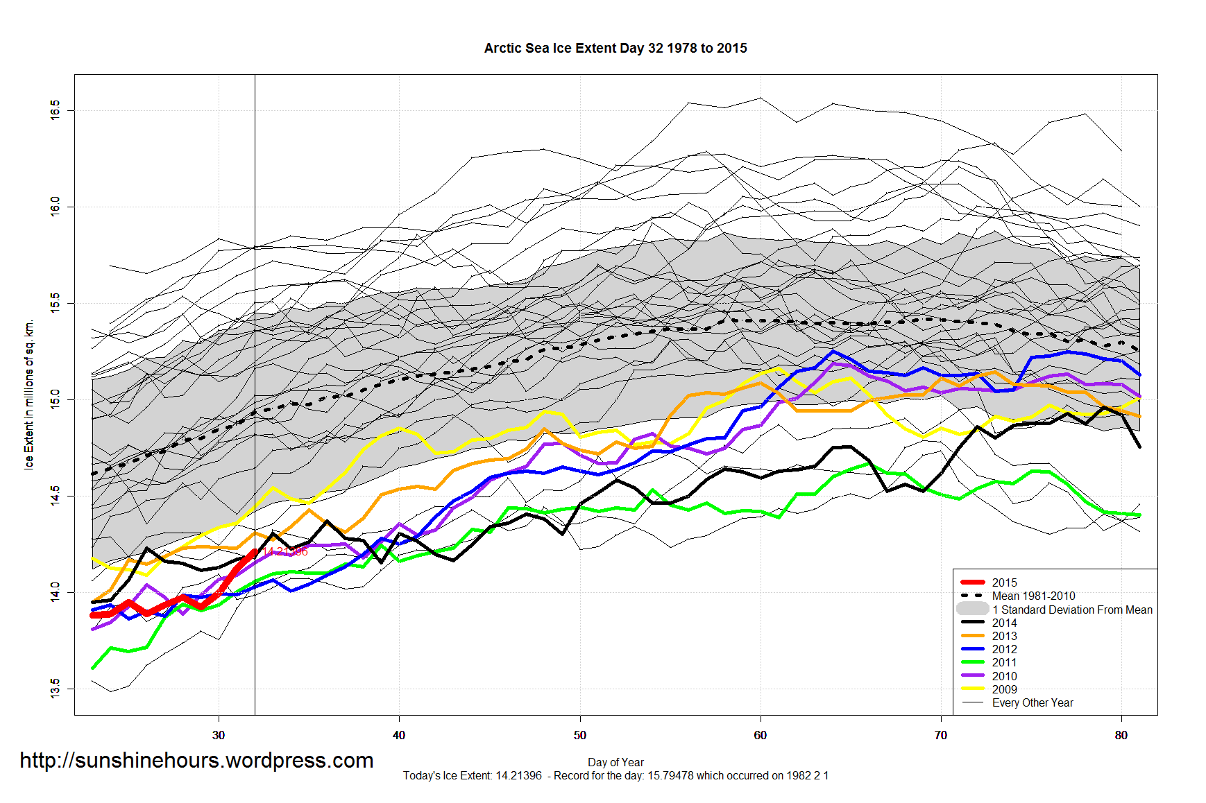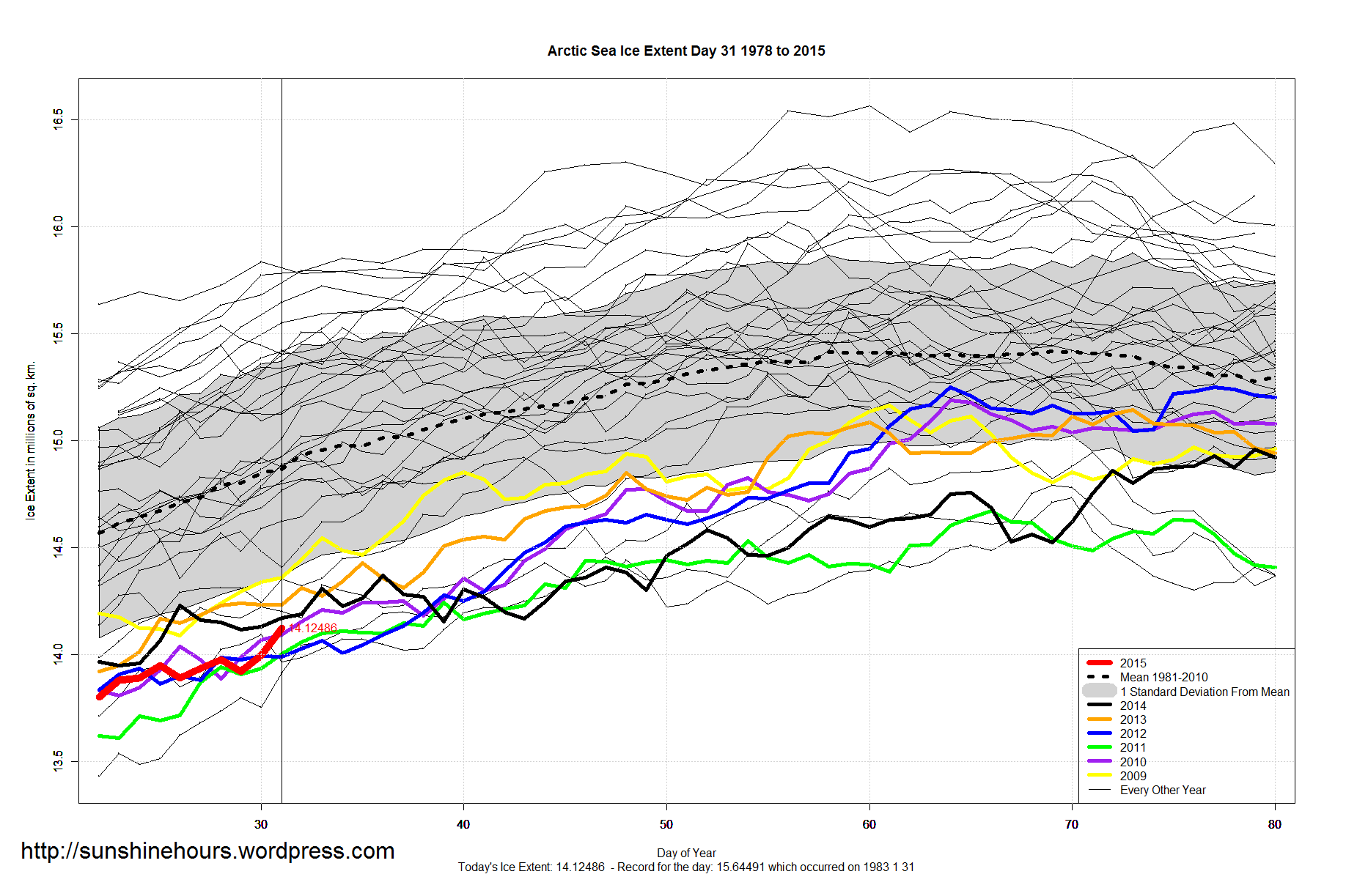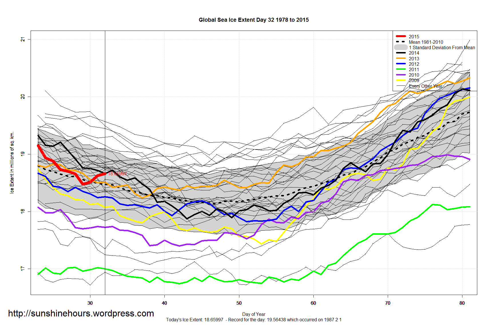 Normally (as you can see from the graph below) at this time of year Antarctic Sea Ice is high one or two years and then drops as much as 1.3 million sq km to a low (even a new) low and then repeats.