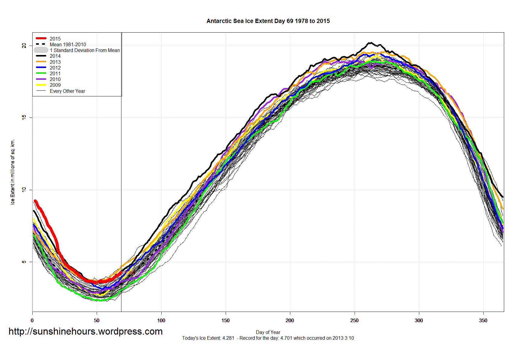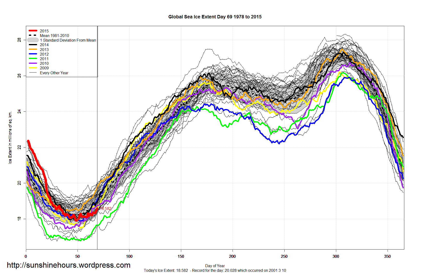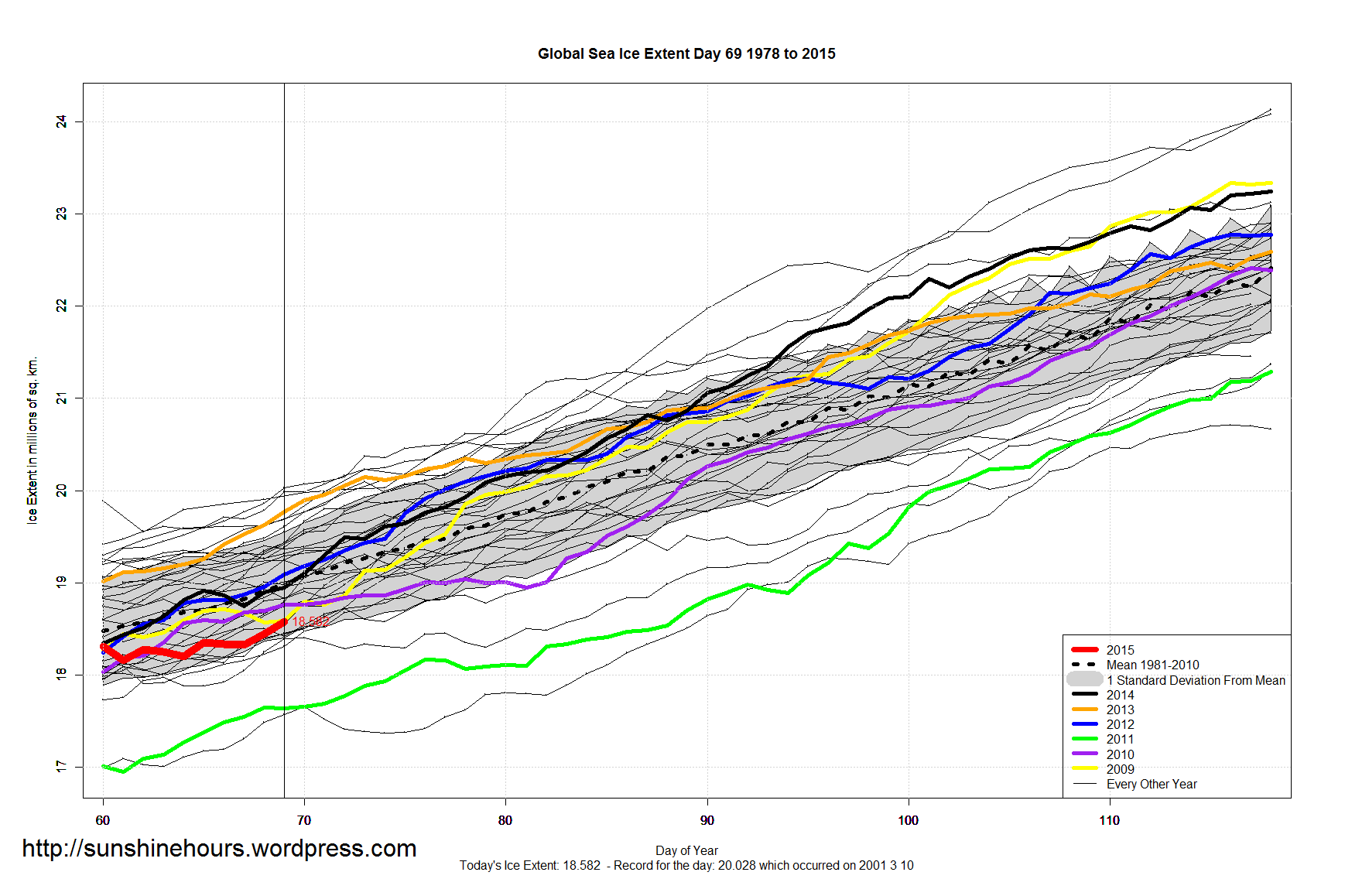 Sea Ice Extent – Day 69 Published on March 11, 2015 by sunshinehours1 Data: South / North Share this: Click to share on X (Opens in new window) X Click to share on Facebook (Opens in new window) Facebook Like Loading... Related