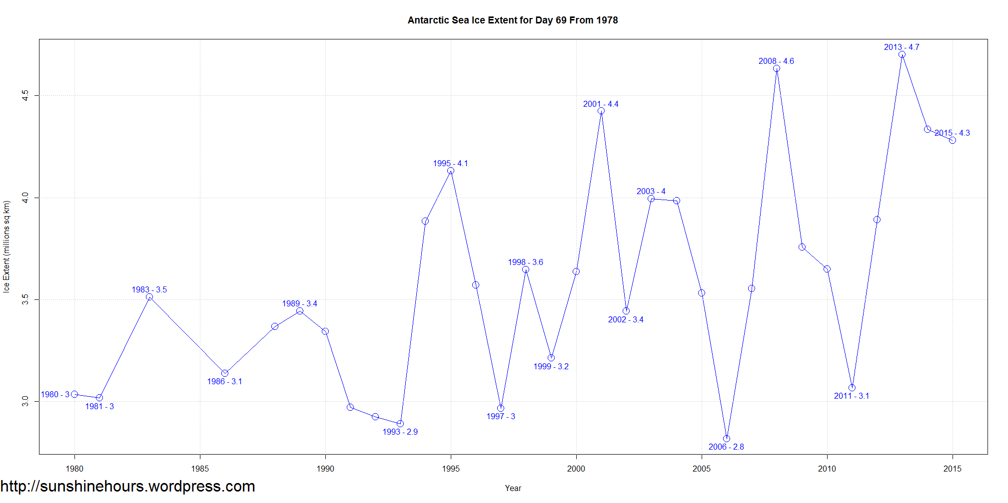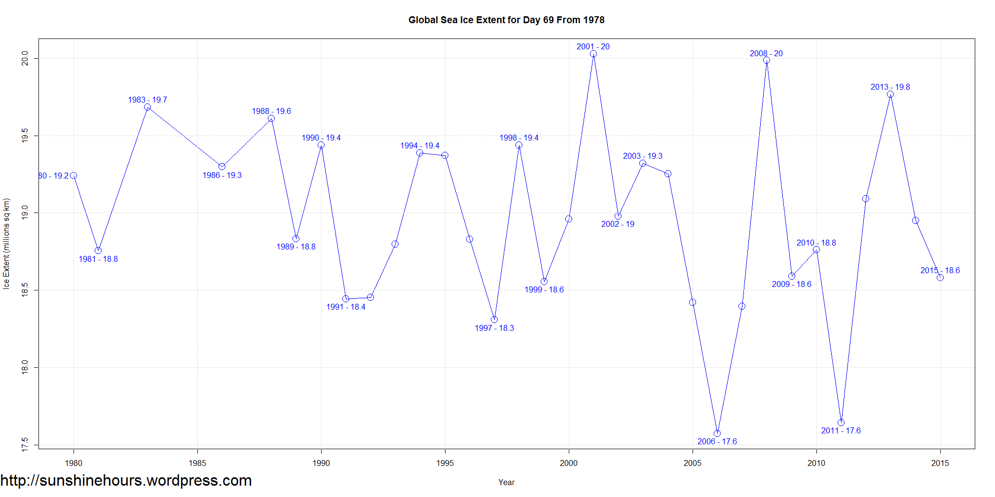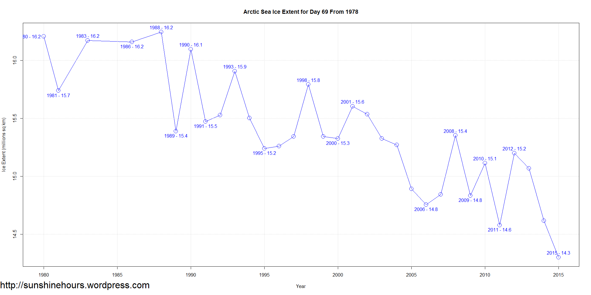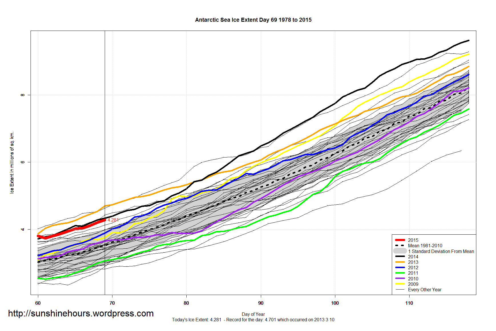 Sea Ice Extent – Day 69 Published on March 11, 2015 by sunshinehours1 Data: South / North Share this: Click to share on X (Opens in new window) X Click to share on Facebook (Opens in new window) Facebook Like Loading... Related