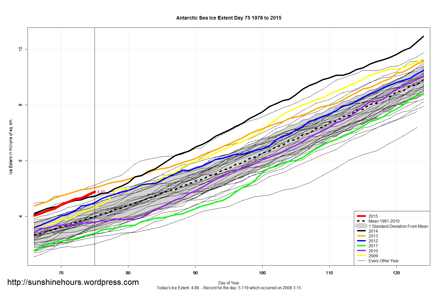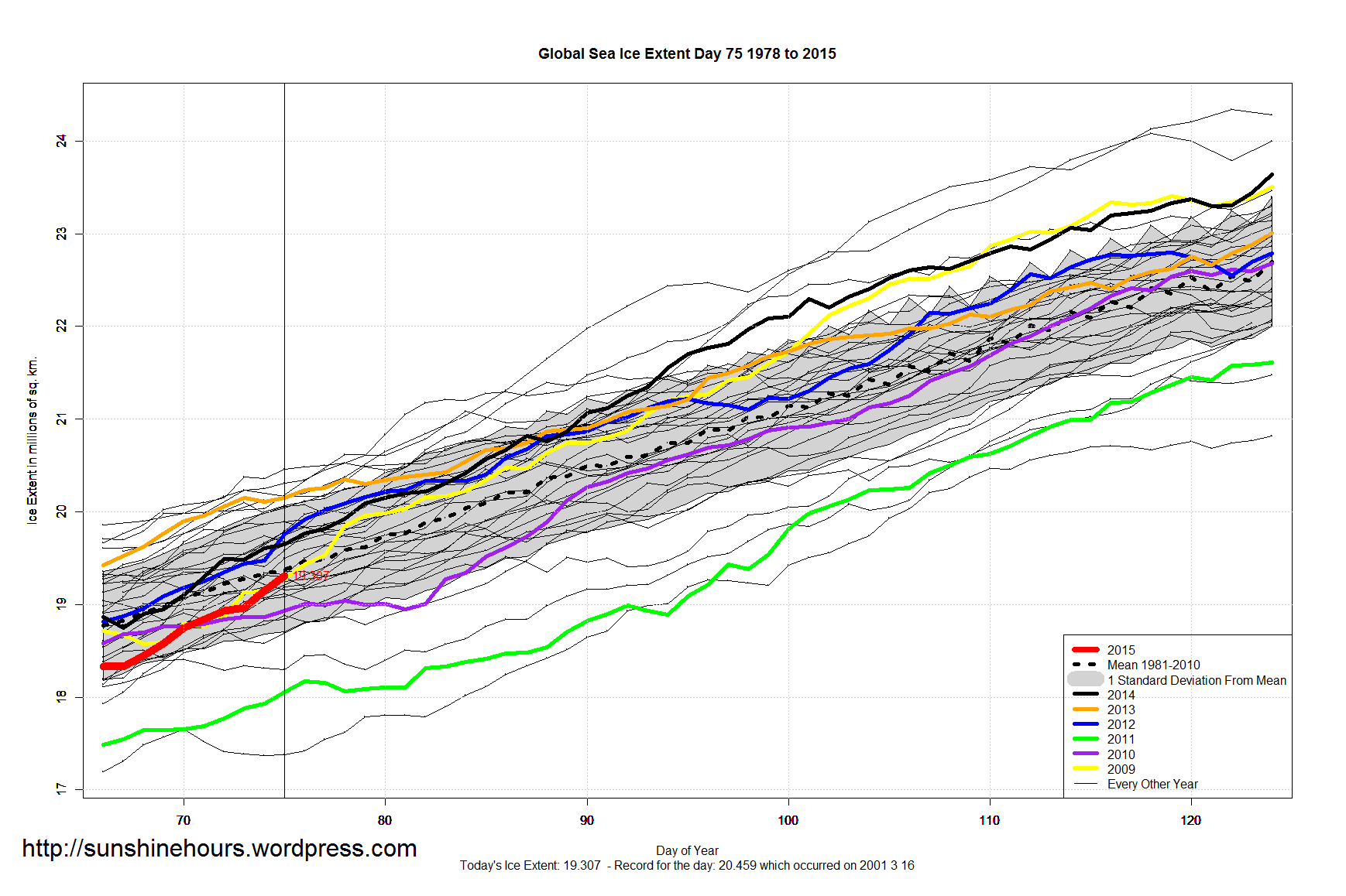 Back on March 10th (which was actually day 68) I called the Arctic Maximum at 14.595 million sq km. to have occurred on day 53.