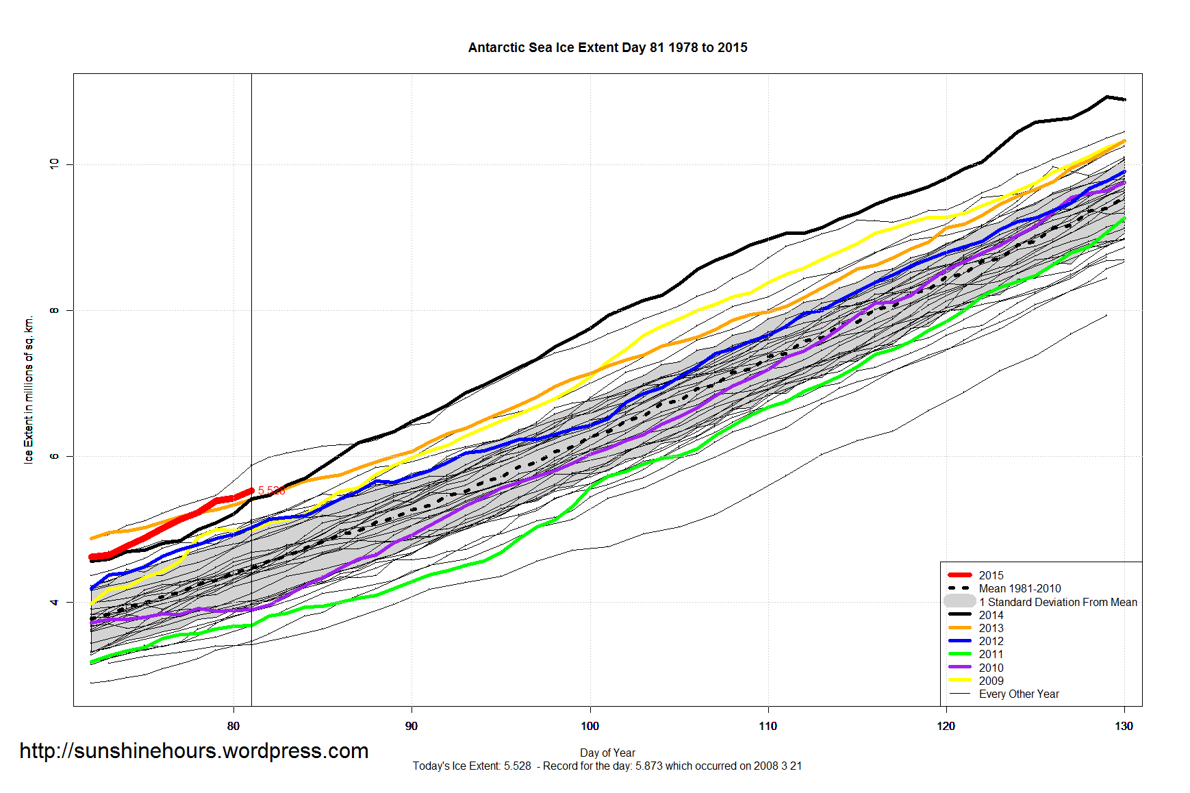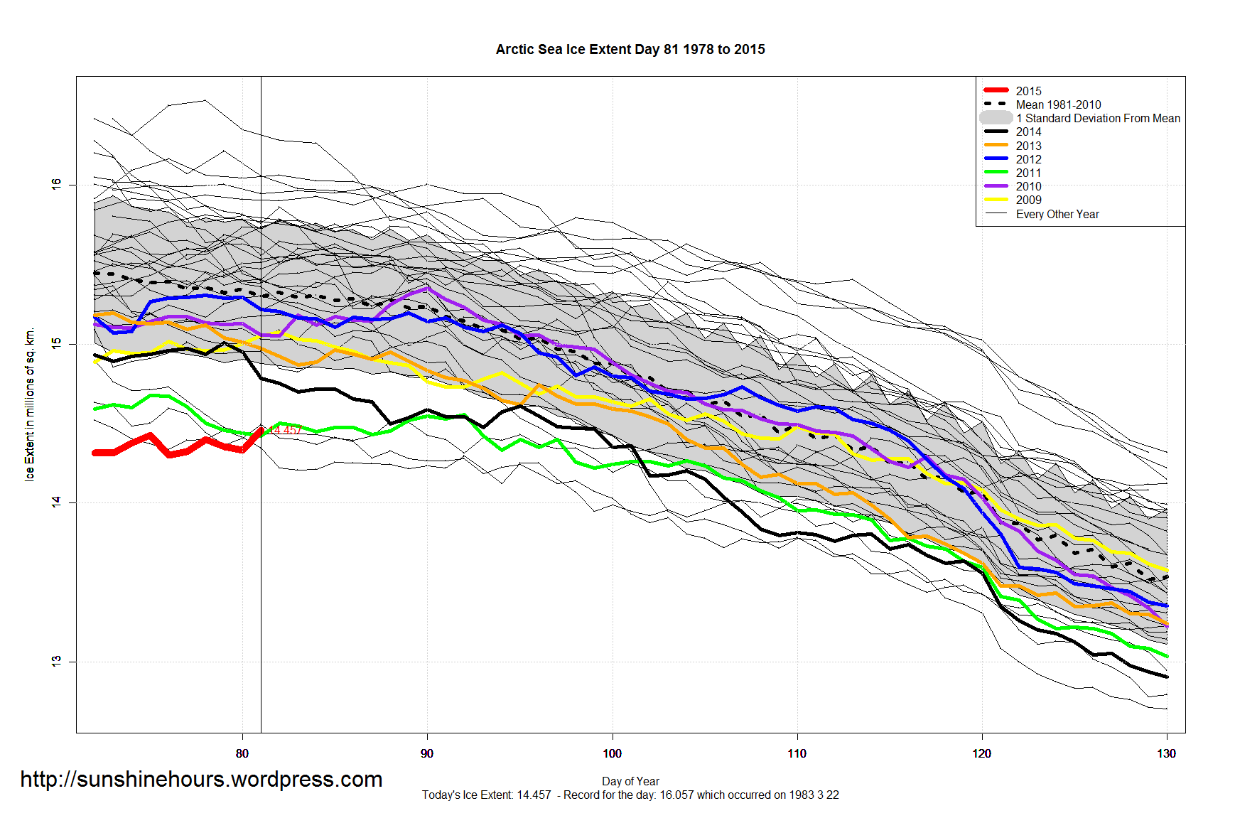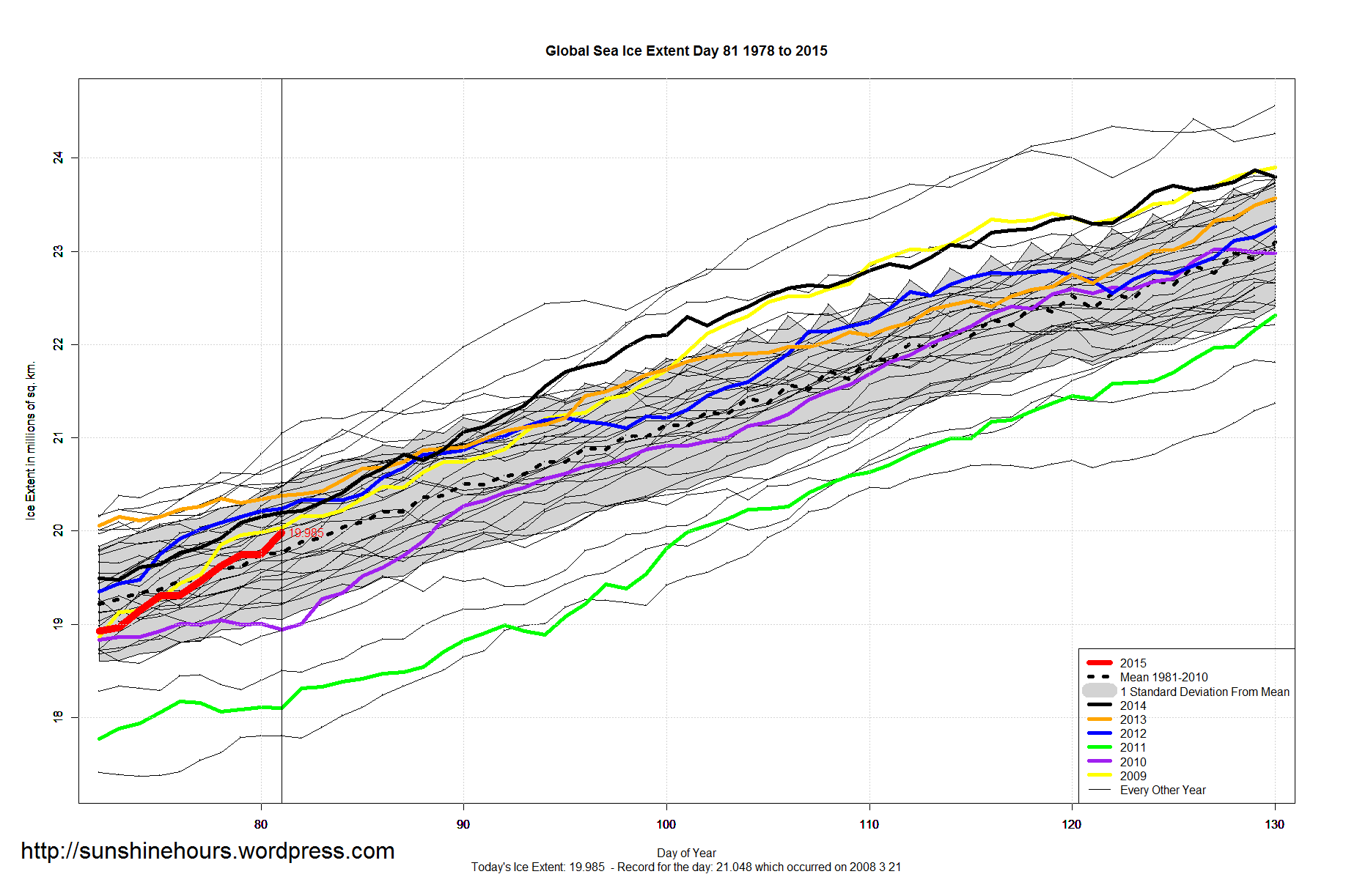 Sea Ice Extent – Day 81 – Global Sea Ice ‘Normal’ Published on March 23, 2015 by sunshinehours1 Data: South / North Share this: Click to share on X (Opens in new window) X Click to share on Facebook (Opens in new window) Facebook Like Loading... Related