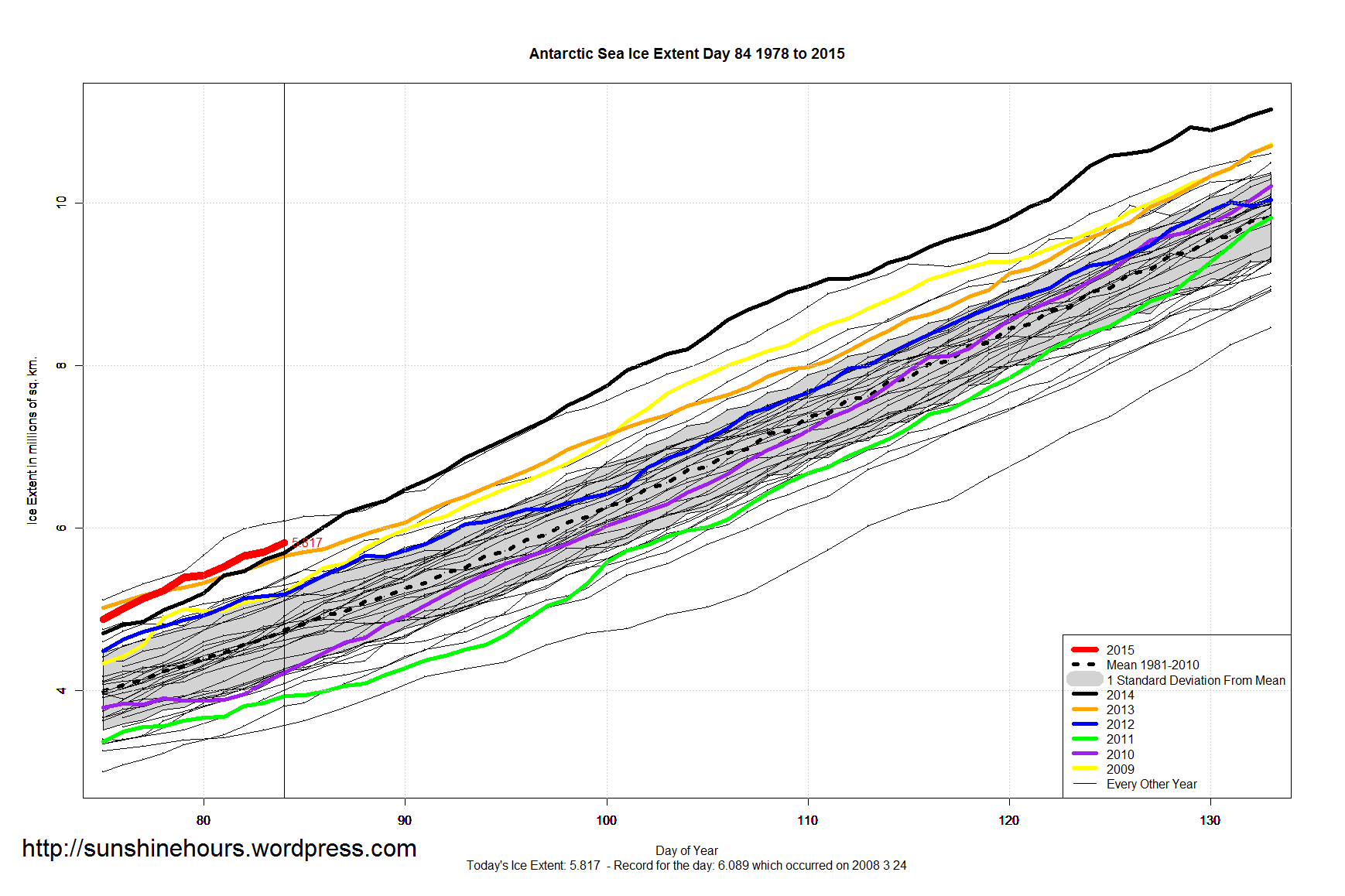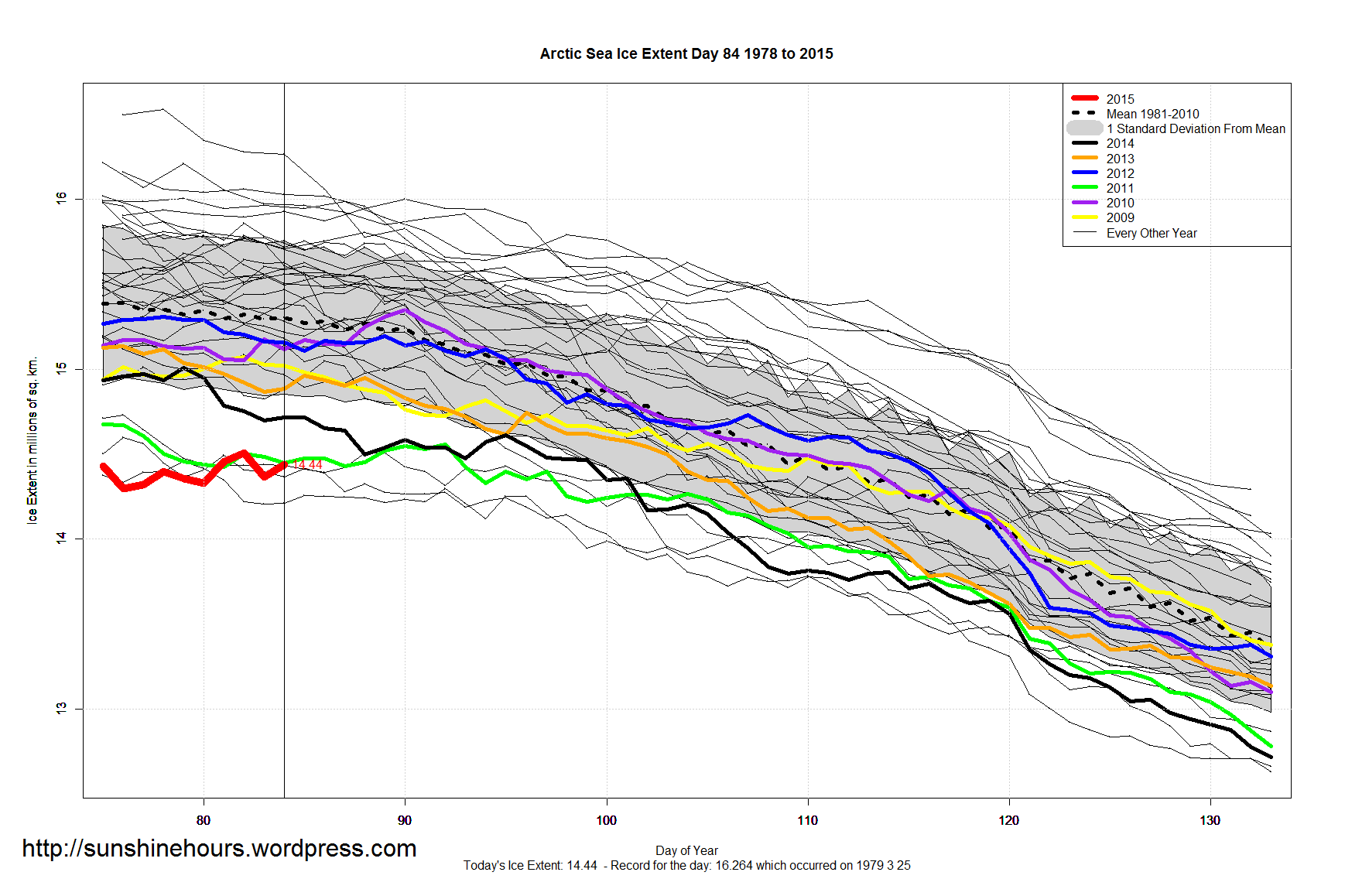 Sea Ice Extent – Day 84 – Global Sea Ice Above ‘Normal’ Published on March 26, 2015 by sunshinehours1 Data: South / North Share this: Click to share on X (Opens in new window) X Click to share on Facebook (Opens in new window) Facebook Like Loading... Related