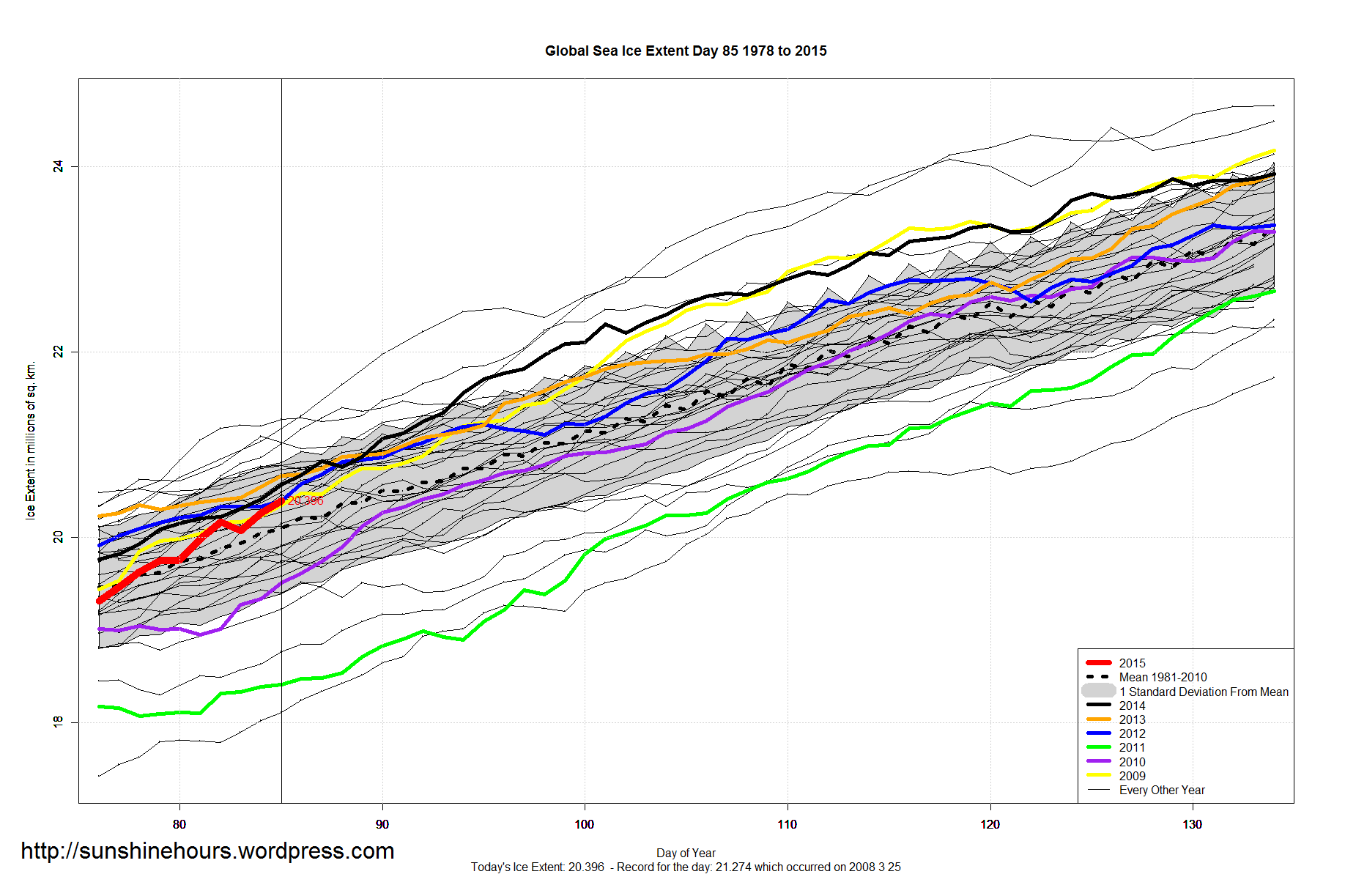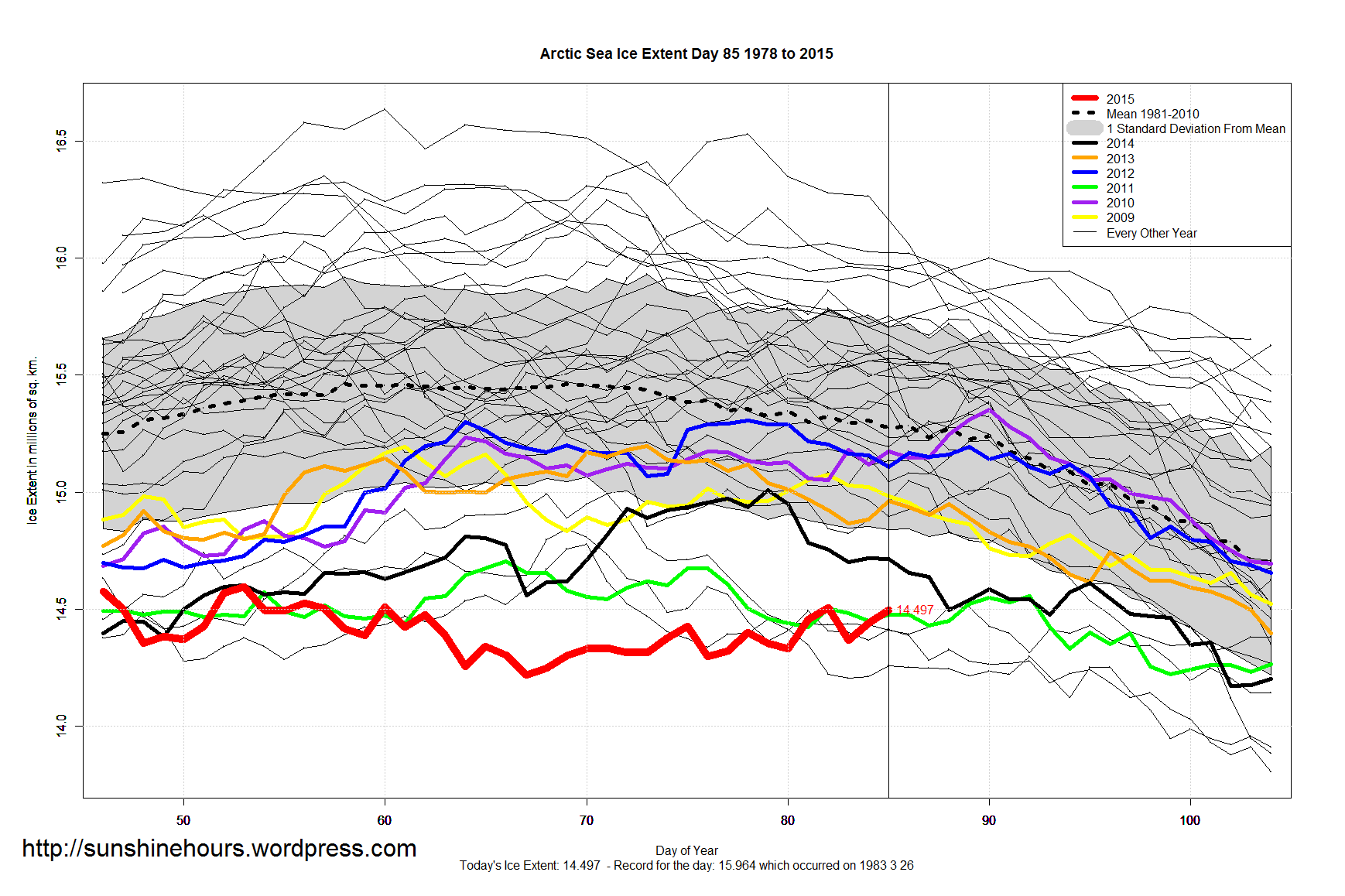 The Arctic is only 98,000 sq km below the ‘maximum’ for 2015 which I called on day 53 (which may still turn out to be wrong). (See bottom graph for last 40 days)