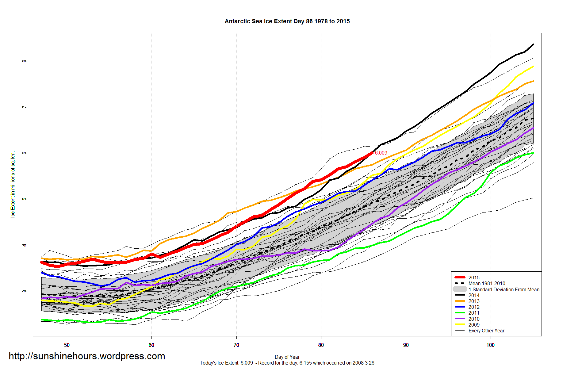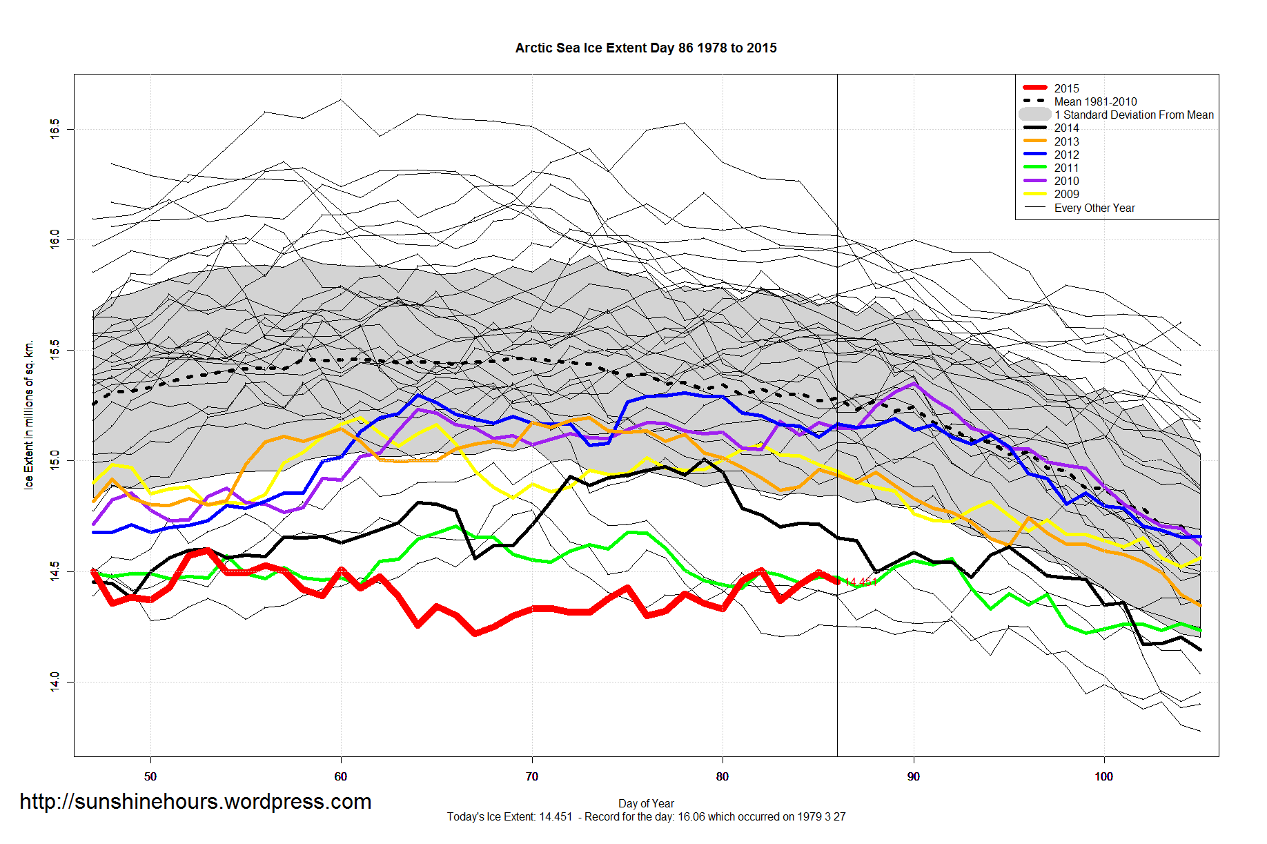 Sea Ice Extent – Day 85 – Global Sea Ice Above ‘Normal’ By 250,000 sq km Published on March 28, 2015 by sunshinehours1 Global Sea Ice is above the 1981-2010 mean. (I made a slight change in the zoomed in graphs to show more past days) Data: South / North Share this: Share on X (Opens in new window) X Share on Facebook (Opens in new window) Facebook Like Loading... Related