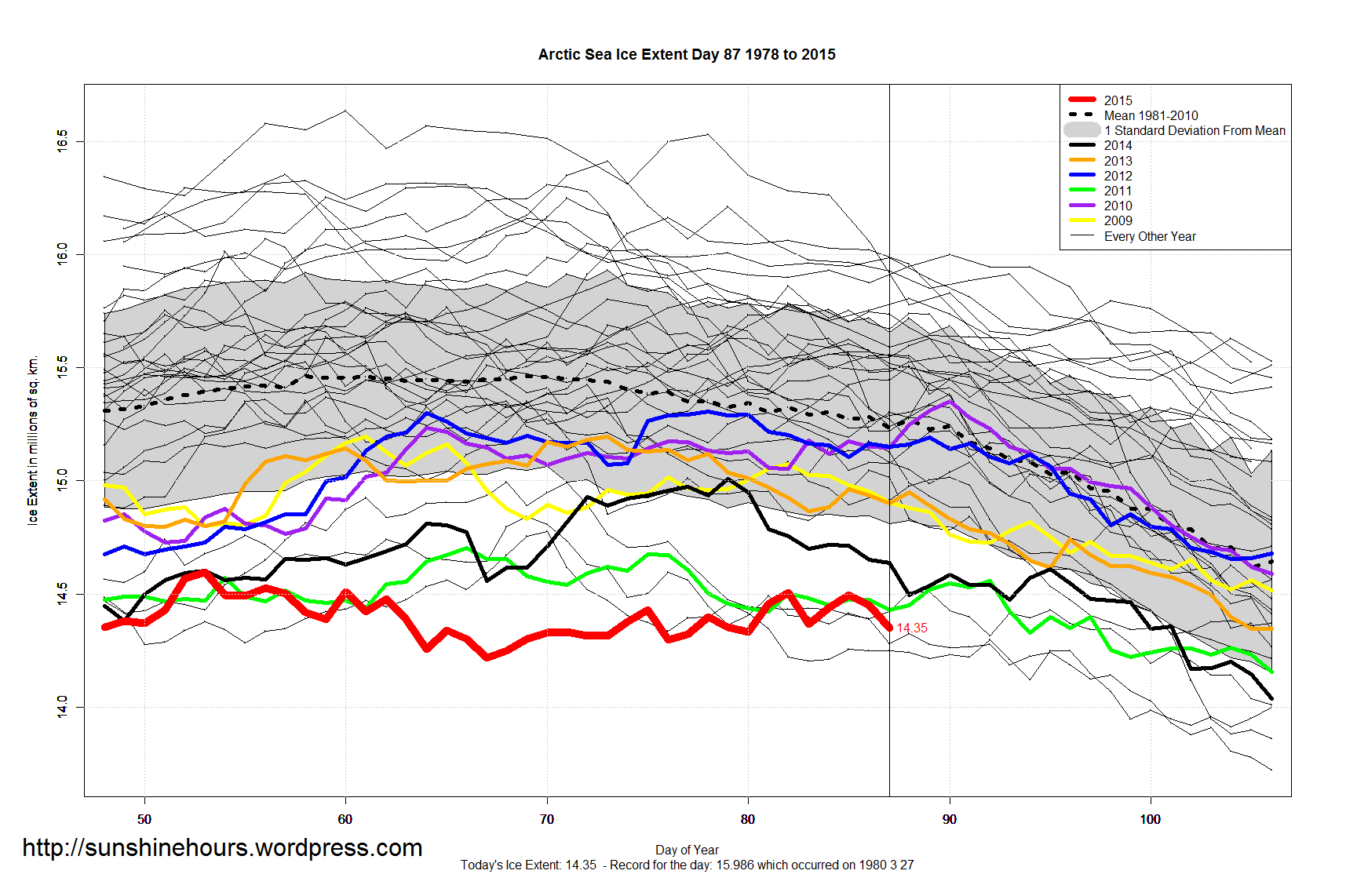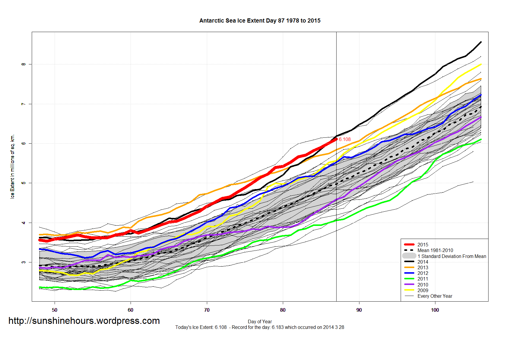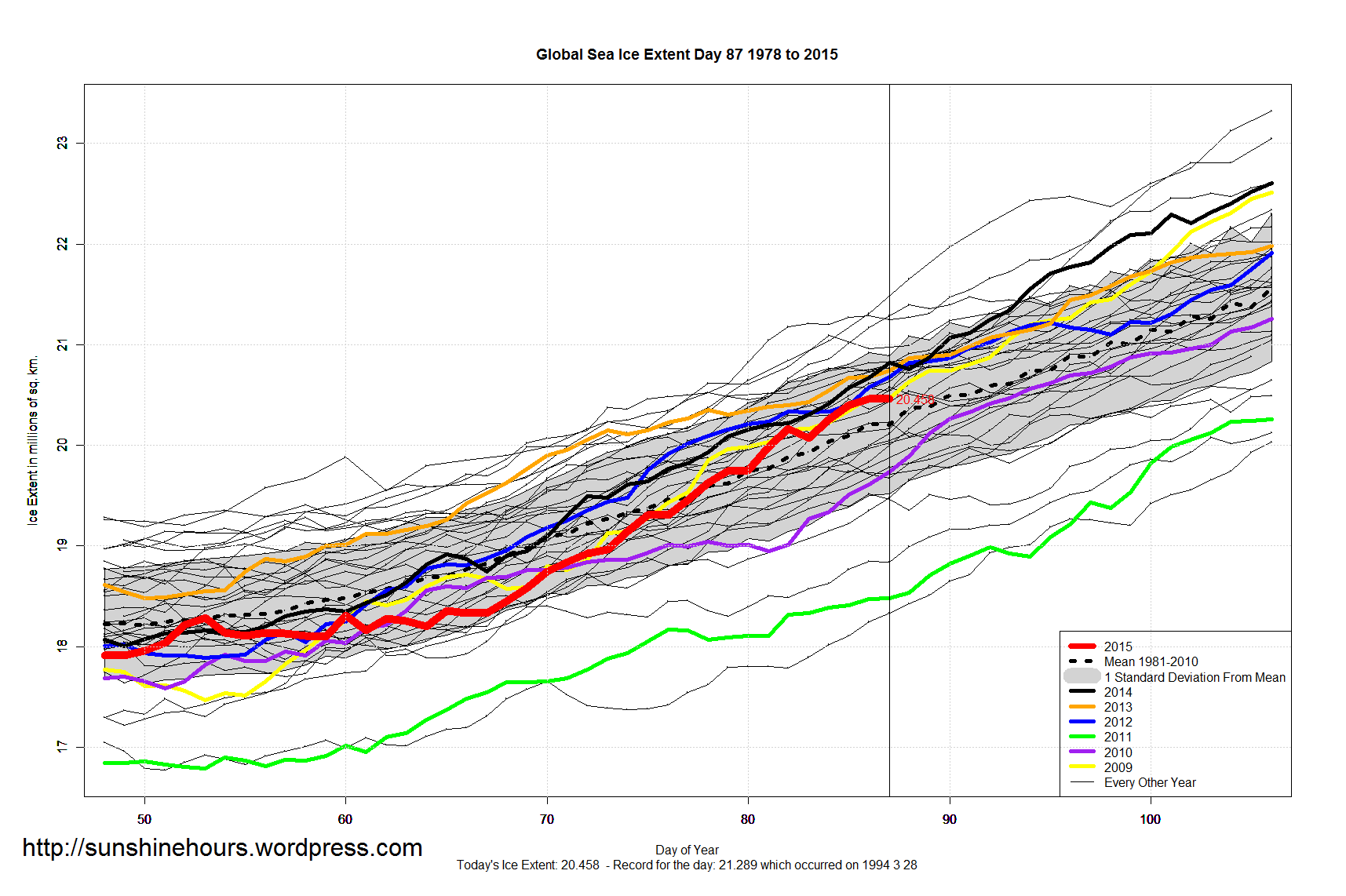 Sea Ice Extent – Day 87 – Global Sea Ice Above ‘Normal’ – Antarctica 1.1 million sq km Above ‘Normal’ Published on March 29, 2015 by sunshinehours1 Data: South / North Share this: Share on X (Opens in new window) X Share on Facebook (Opens in new window) Facebook Like Loading... Related