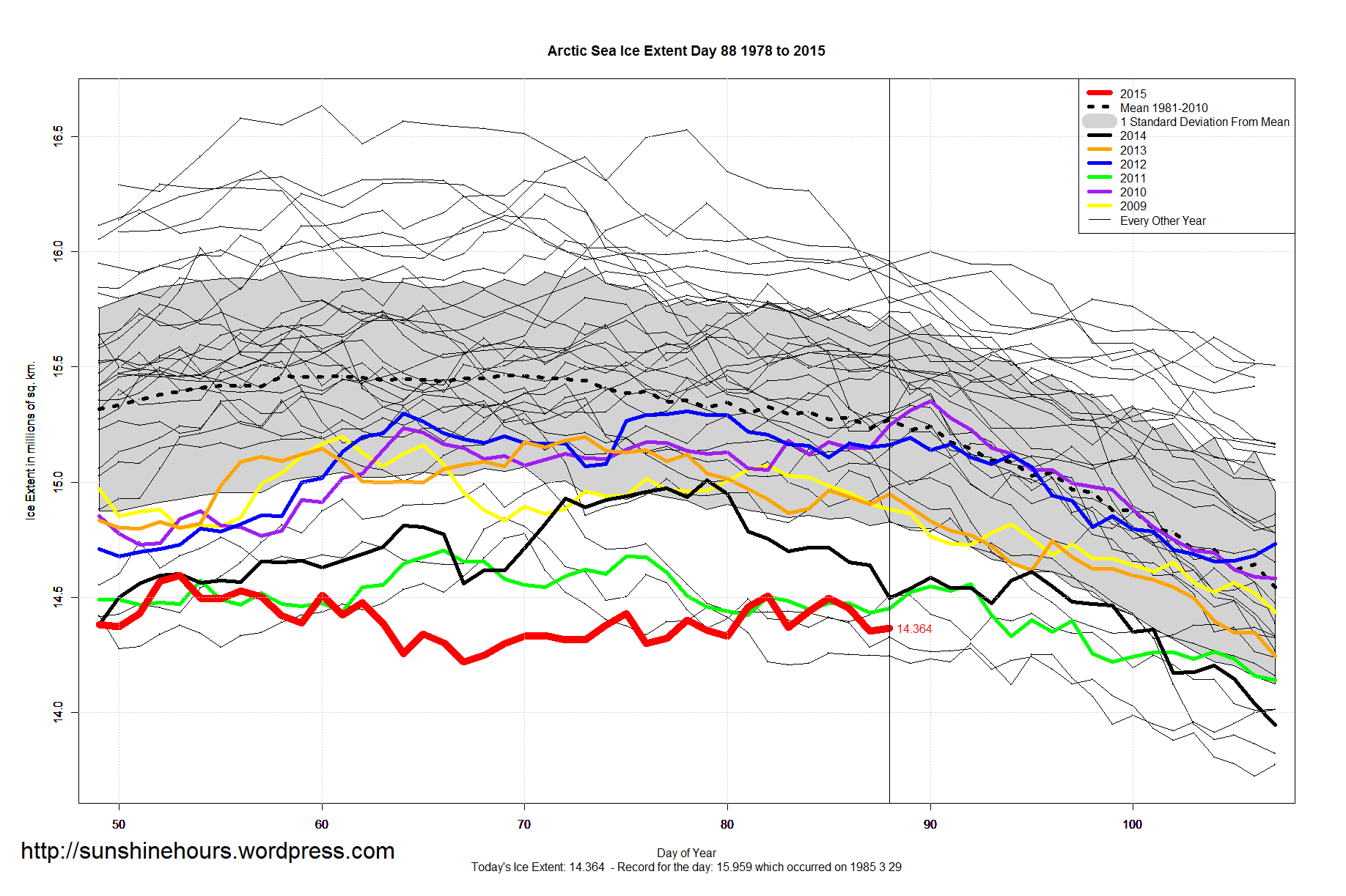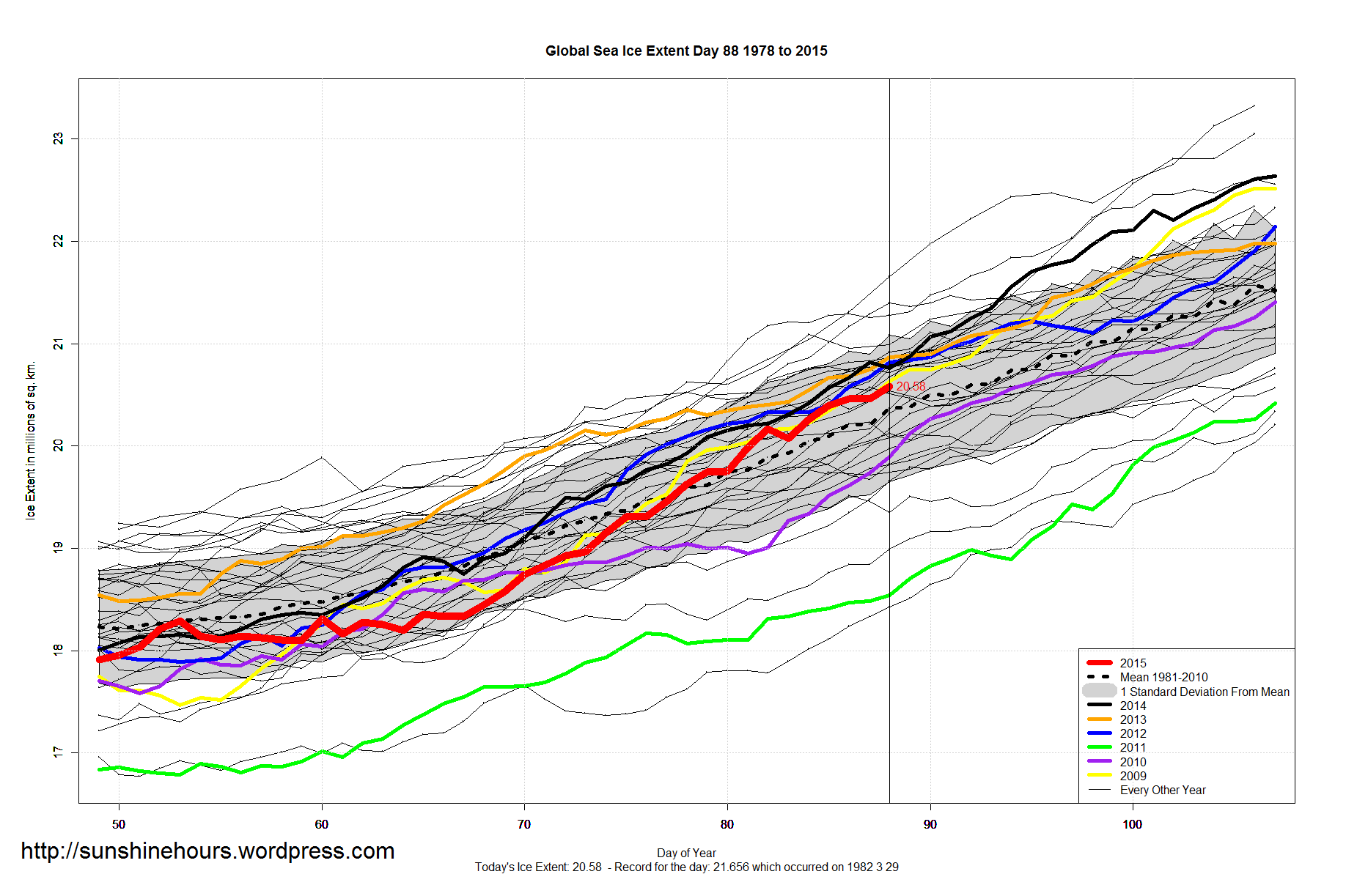 Sea Ice Extent – Day 88 – Global Sea Ice Above ‘Normal’ – Antarctica 1.1 million sq km Above ‘Normal’ Published on March 30, 2015 by sunshinehours1 Data: South / North Share this: Share on X (Opens in new window) X Share on Facebook (Opens in new window) Facebook Like Loading... Related