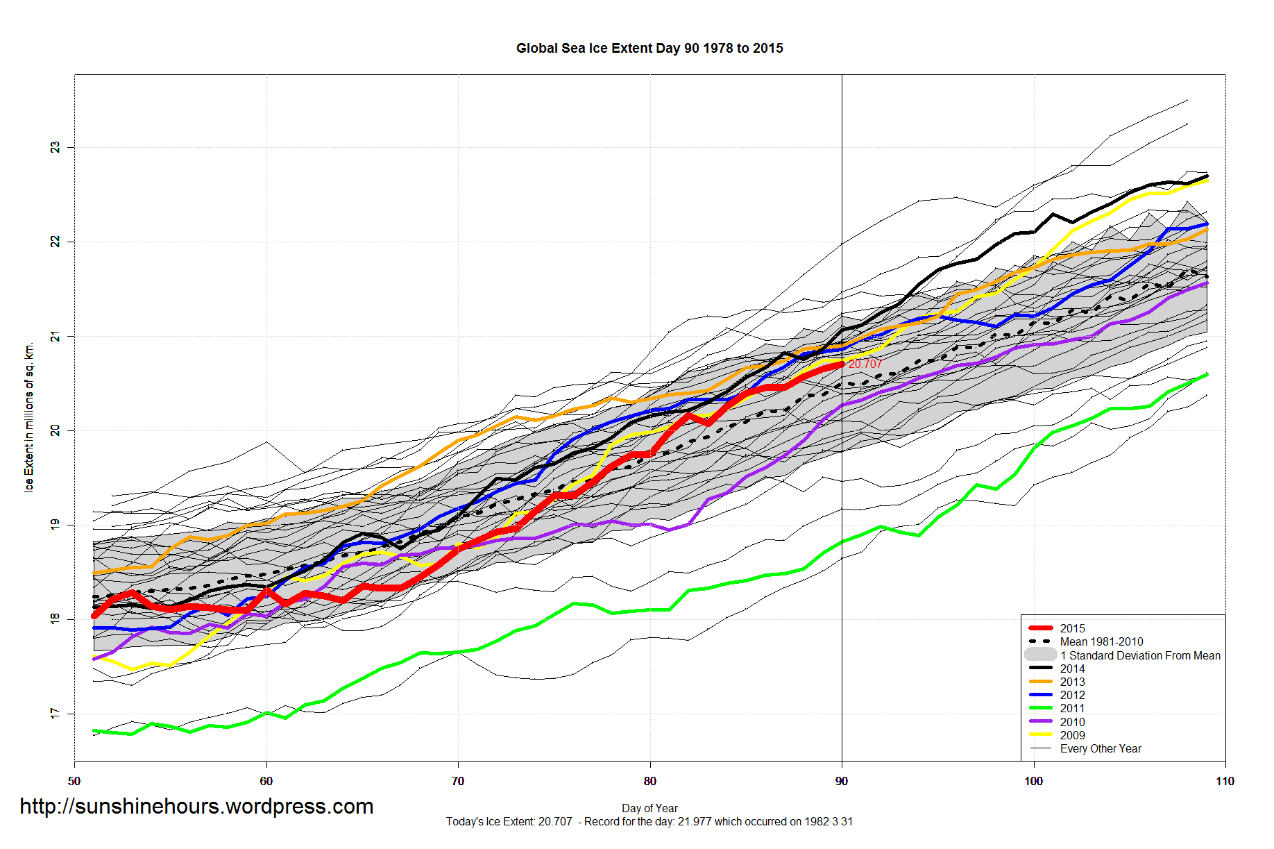 Sea Ice Extent – Day 90 – Global Sea Ice Still Above ‘Normal’ – Antarctica Still 1.1 million sq km Above ‘Normal’ Published on April 1, 2015 by sunshinehours1 Data: South / North Share this: Click to share on X (Opens in new window) X Click to share on Facebook (Opens in new window) Facebook Like Loading... Related