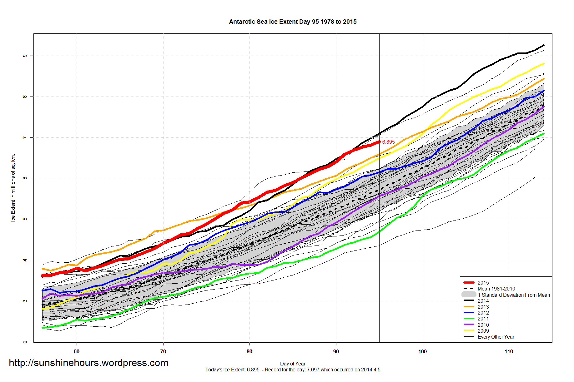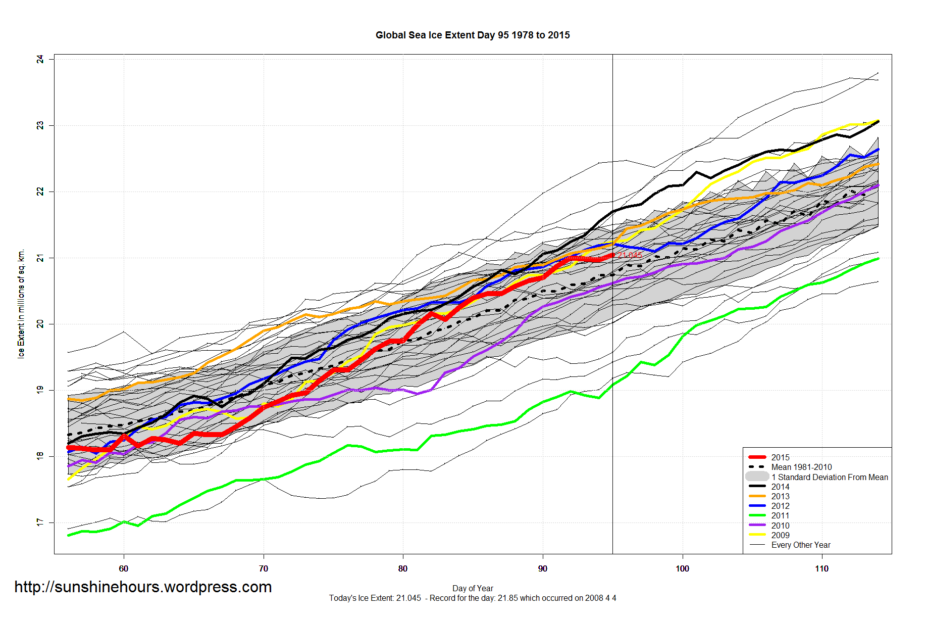 Sea Ice Extent – Day 95 – Global Sea Ice Above ‘Normal’ – Antarctica 1 million sq km Above ‘Normal’ Published on April 6, 2015 by sunshinehours1 Data: South / North Share this: Click to share on X (Opens in new window) X Click to share on Facebook (Opens in new window) Facebook Like Loading... Related