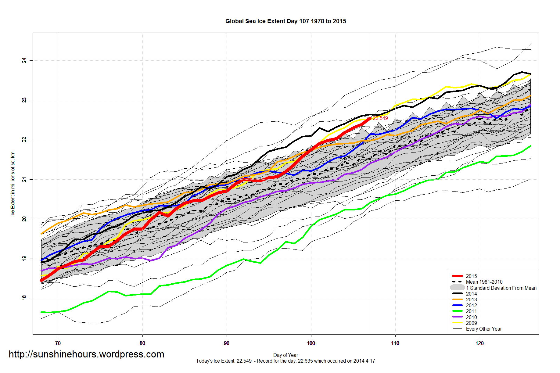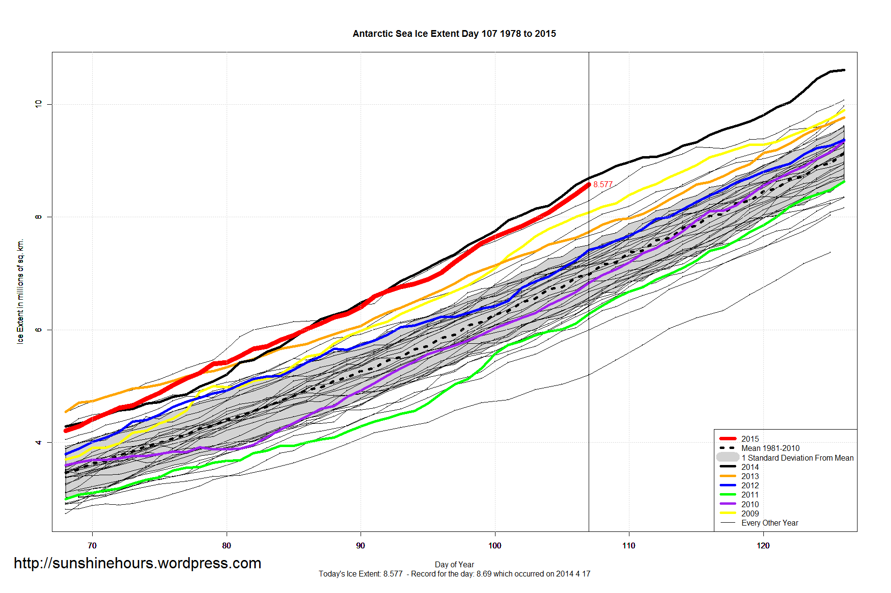 Sea Ice Extent – Day 107 – 5th Highest Global Sea Ice For This Day – Antarctic 1.6 million above ‘Normal’ Published on April 18, 2015April 18, 2015 by sunshinehours1 5th Highest Global Sea Ice For This Day. Above one standard deviation. Antarctic 1.6 million above the 1981-2010 mean. Data: South / North Share this: Click to share on X (Opens in new window) X Click to share on Facebook (Opens in new window) Facebook Like Loading... Related