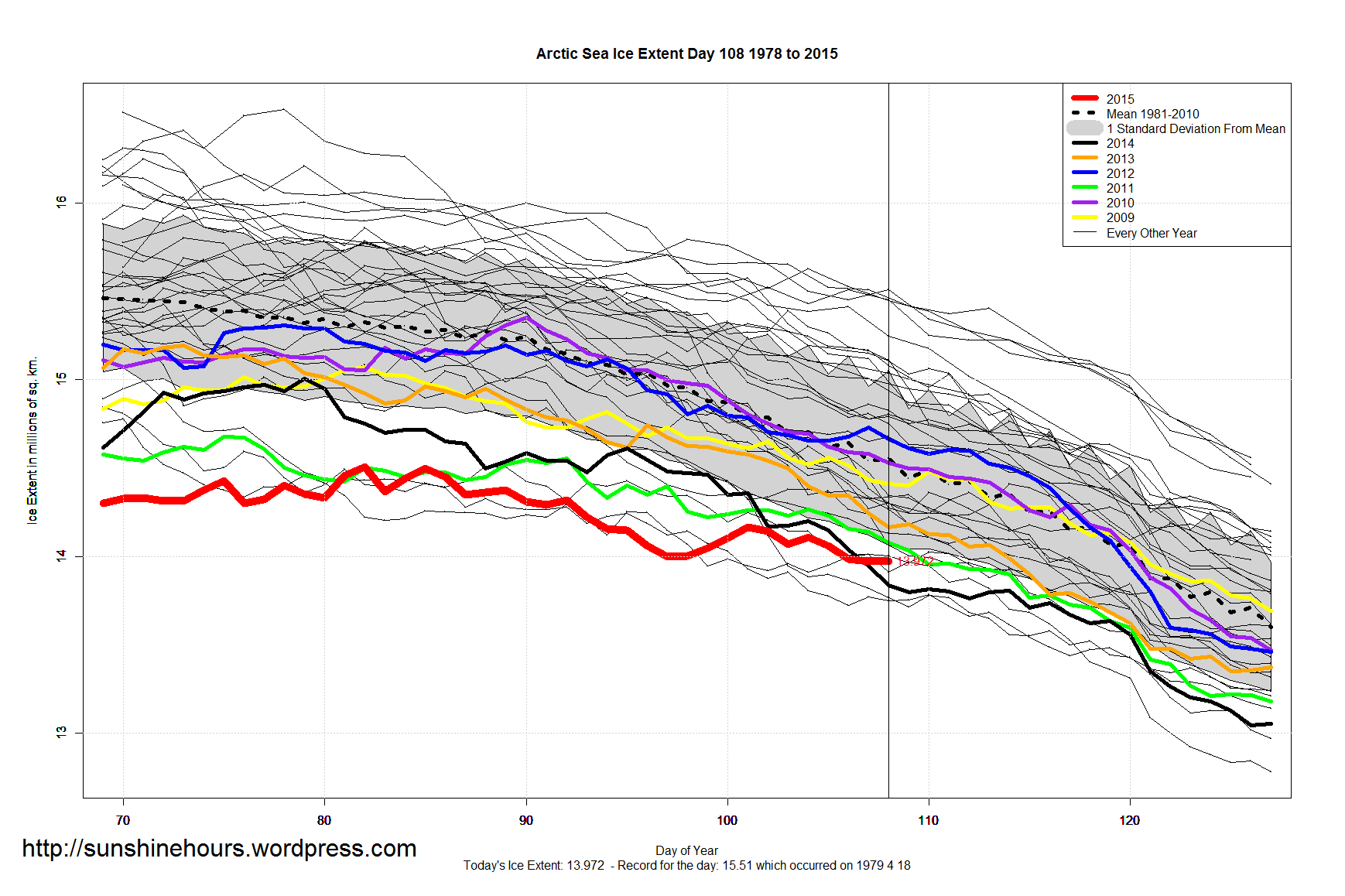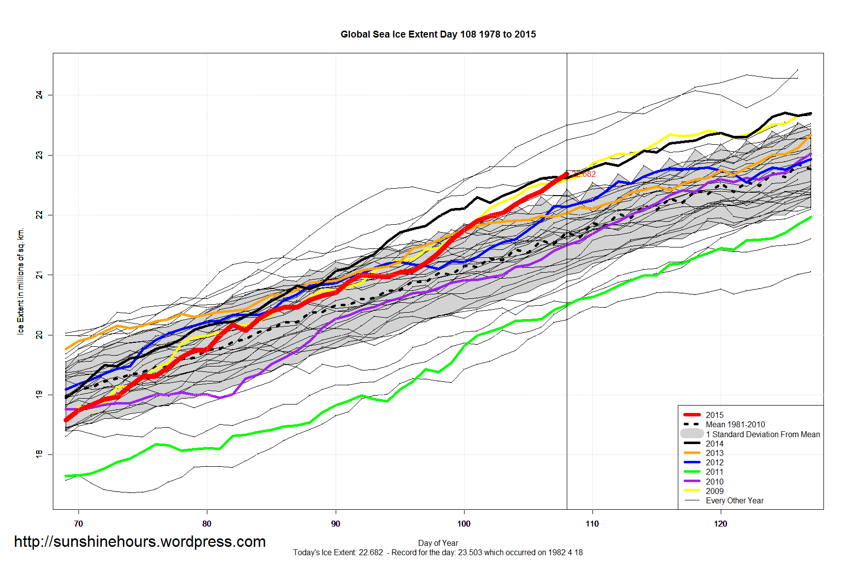 Sea Ice Extent – Day 108 – 4th Highest Global Sea Ice For This Day – Antarctic 1.6 million above ‘Normal’ Published on April 19, 2015 by sunshinehours1 4th Highest Global Sea Ice For This Day. Above one standard deviation. Antarctic 1.6 million above the 1981-2010 mean. Data: South / North Share this: Click to share on X (Opens in new window) X Click to share on Facebook (Opens in new window) Facebook Like Loading... Related