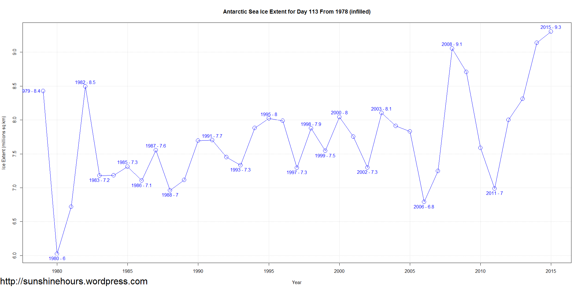 Antarctic Sea Ice Extent for Day 113 From 1978 (infilled)