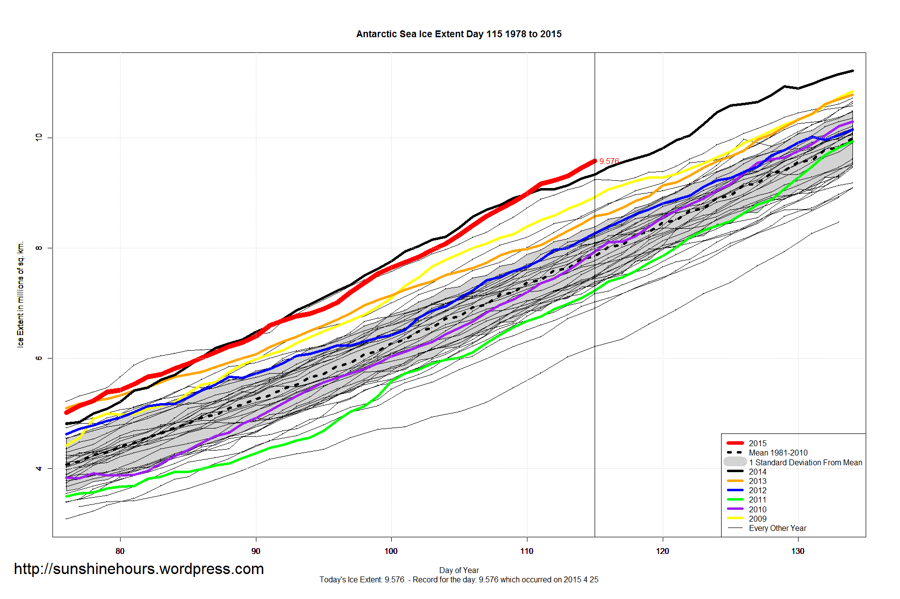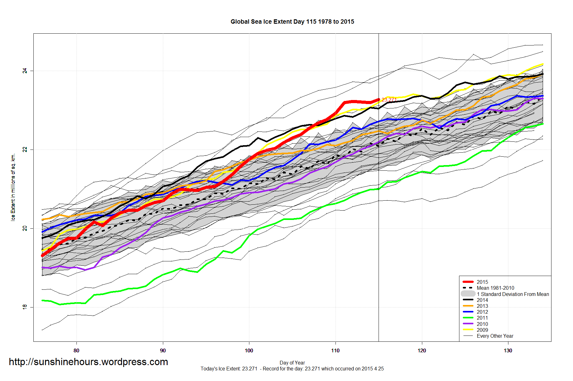 Sea Ice Extent – Day 115 – 3rd Highest Global Sea Ice For This Day – Antarctic Sets 27th Daily Record For 2015 Published on April 26, 2015 by sunshinehours1 3rd Highest Global Sea Ice For This Day – Above one standard deviation. 27th Daily Record for Antarctic – 1.7 million above the 1981-2010 mean. Data: South / North Share this: Share on X (Opens in new window) X Share on Facebook (Opens in new window) Facebook Like Loading... Related