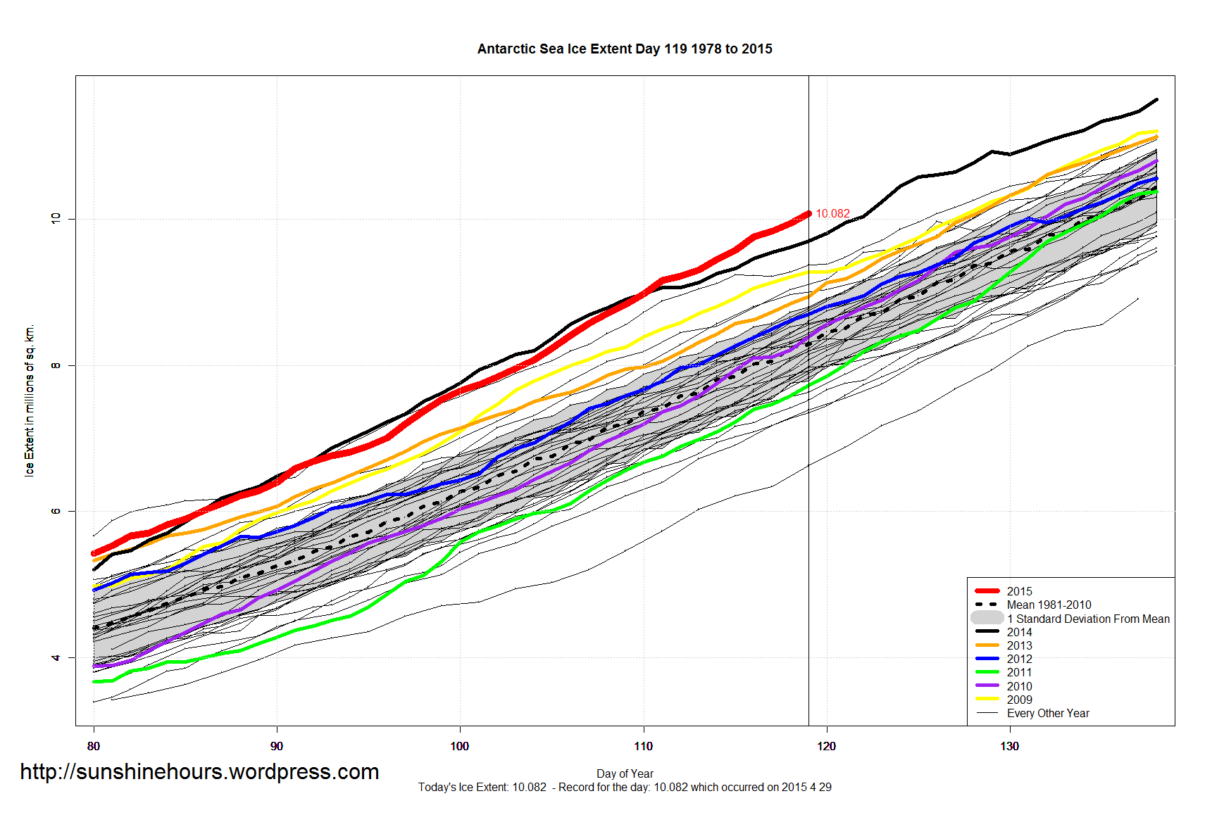 One thought on “Sea Ice Extent – Day 119 – 3rd Highest Global Sea Ice For This Day – Antarctic Sets 31st Daily Record For 2015”