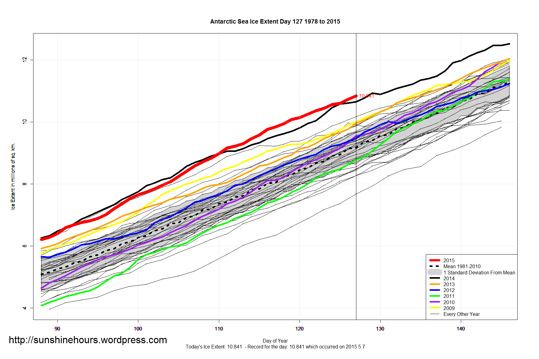Sea Ice Extent – Day 127 – 3rd Highest Global Sea Ice For This Day – Antarctic Sets 39th Daily Record For 2015 Published on May 8, 2015 by sunshinehours1 3rd Highest Global Sea Ice For This Day – Above one standard deviation. 39th Daily Record for Antarctic – 1.67 million above the 1981-2010 mean. – Above 3 standard deviations. Data: South / North Share this: Click to share on X (Opens in new window) X Click to share on Facebook (Opens in new window) Facebook Like Loading... Related