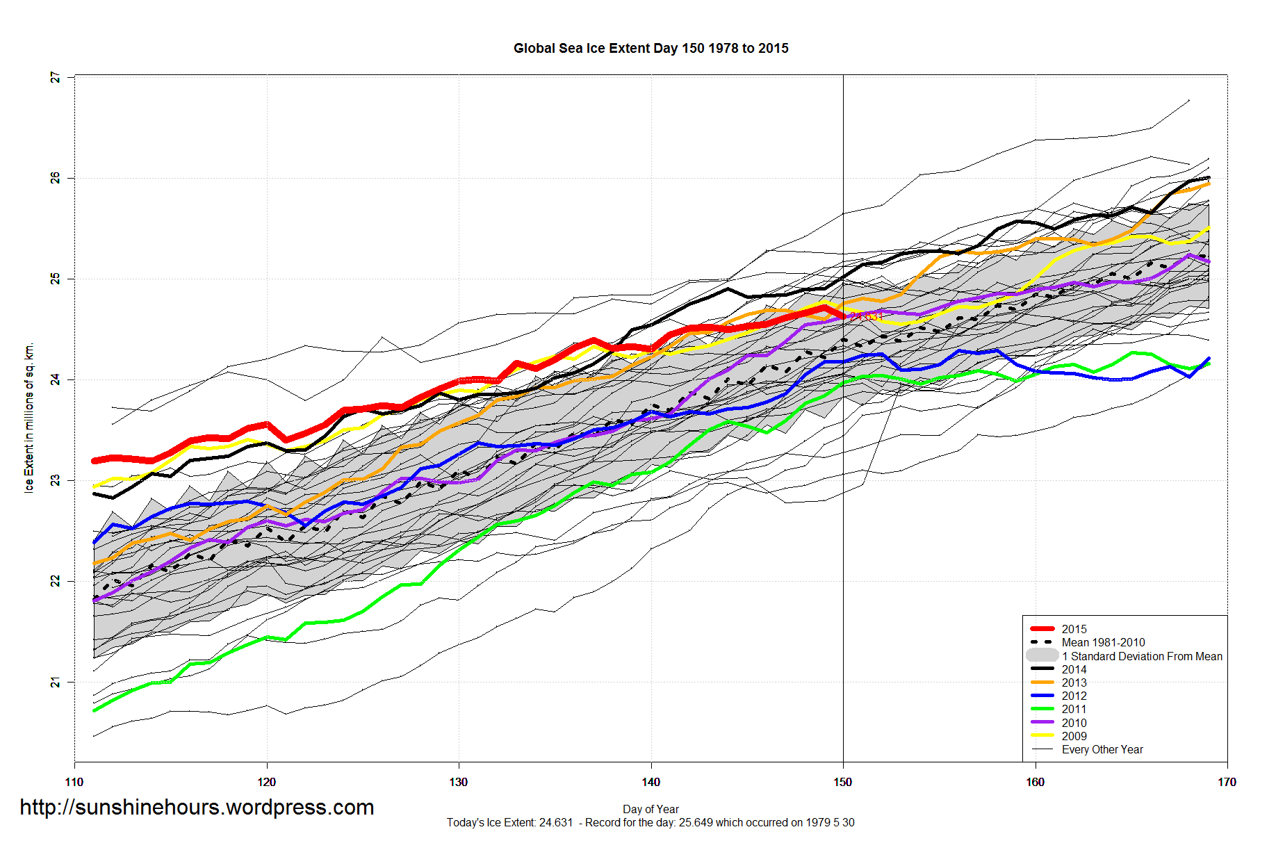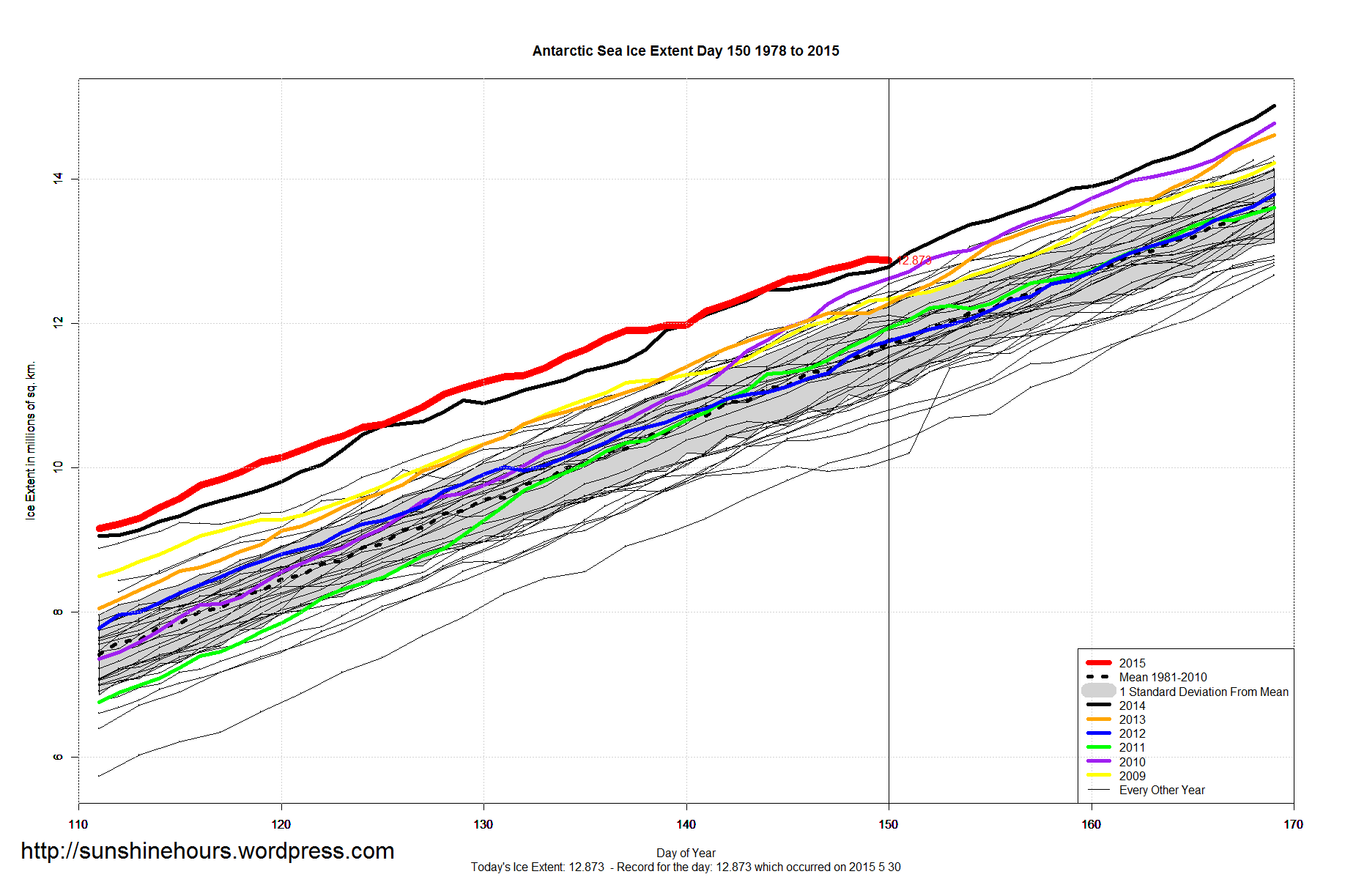 Sea Ice Extent – Day 150 – Antarctic Sets 61st Daily Record – 12th Highest Global Sea Ice For This Day Published on May 31, 2015 by sunshinehours1 61st Daily Record for Antarctic – 1.4 million above the 1981-2010 mean. – Above 2 standard deviations. 12th Highest Global Sea Ice For This Day. South / North Share this: Click to share on X (Opens in new window) X Click to share on Facebook (Opens in new window) Facebook Like Loading... Related