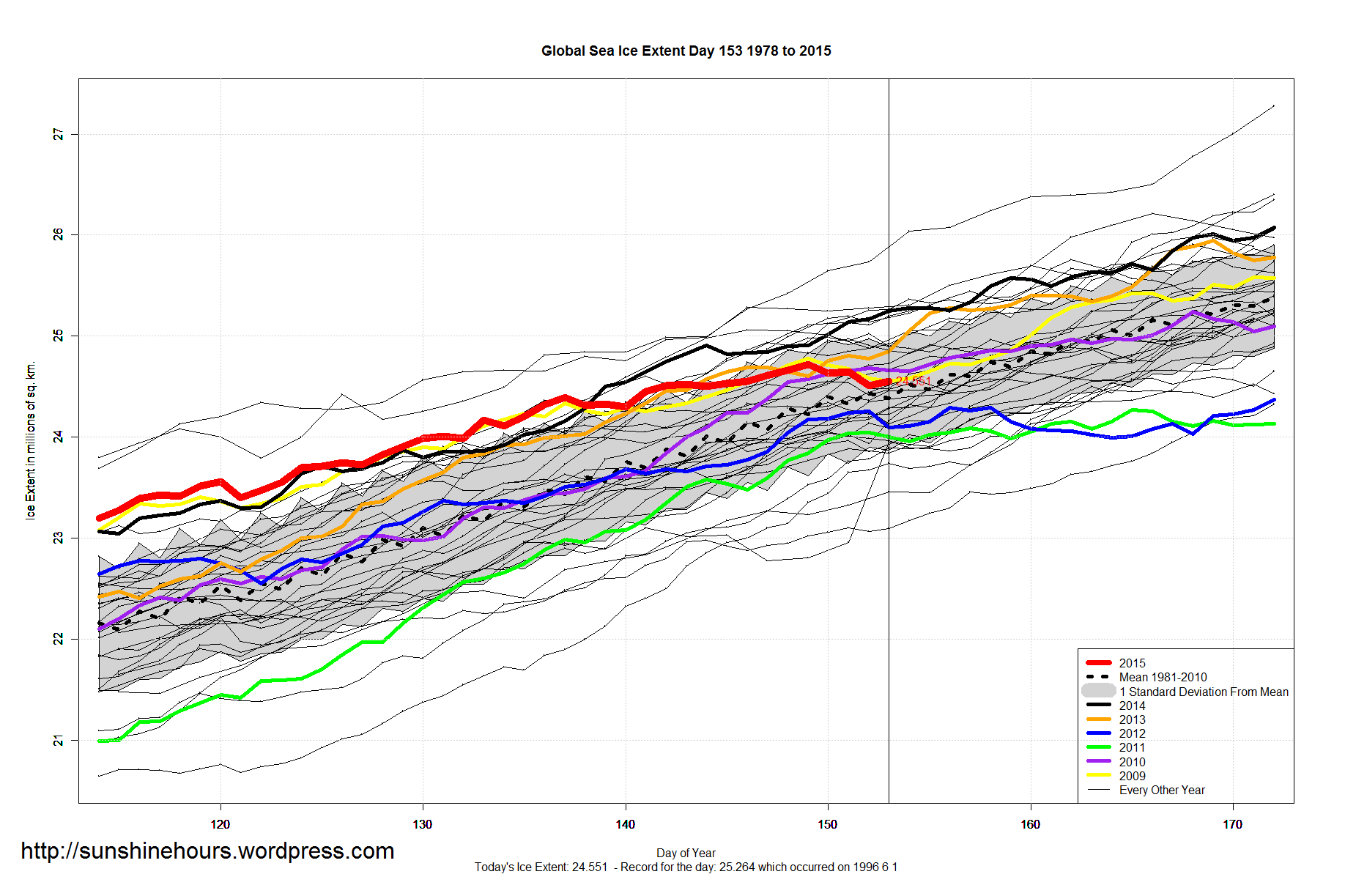 Sea Ice Extent – Day 153 – Antarctic 2nd Highest – Global 15th Highest For This Day Published on June 3, 2015 by sunshinehours1 2nd Highest Antarctic Sea Ice For This Day – 1 million above the 1981-2010 mean. – Above 2 standard deviation. 15th Highest Global Sea Ice For This Day. South / North Share this: Click to share on X (Opens in new window) X Click to share on Facebook (Opens in new window) Facebook Like Loading... Related