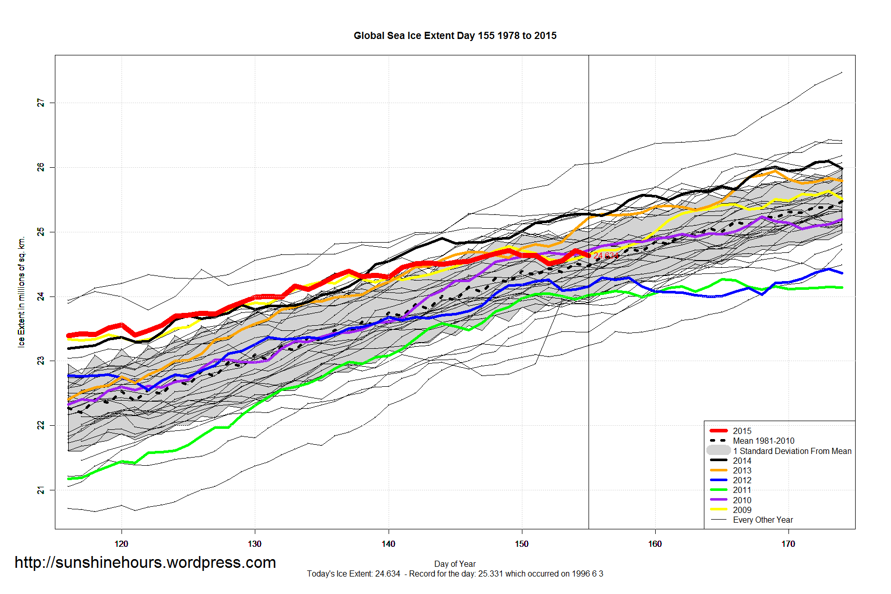 2 thoughts on “Sea Ice Extent – Day 155 – Antarctic 2nd Highest – Global 18th Highest For This Day”