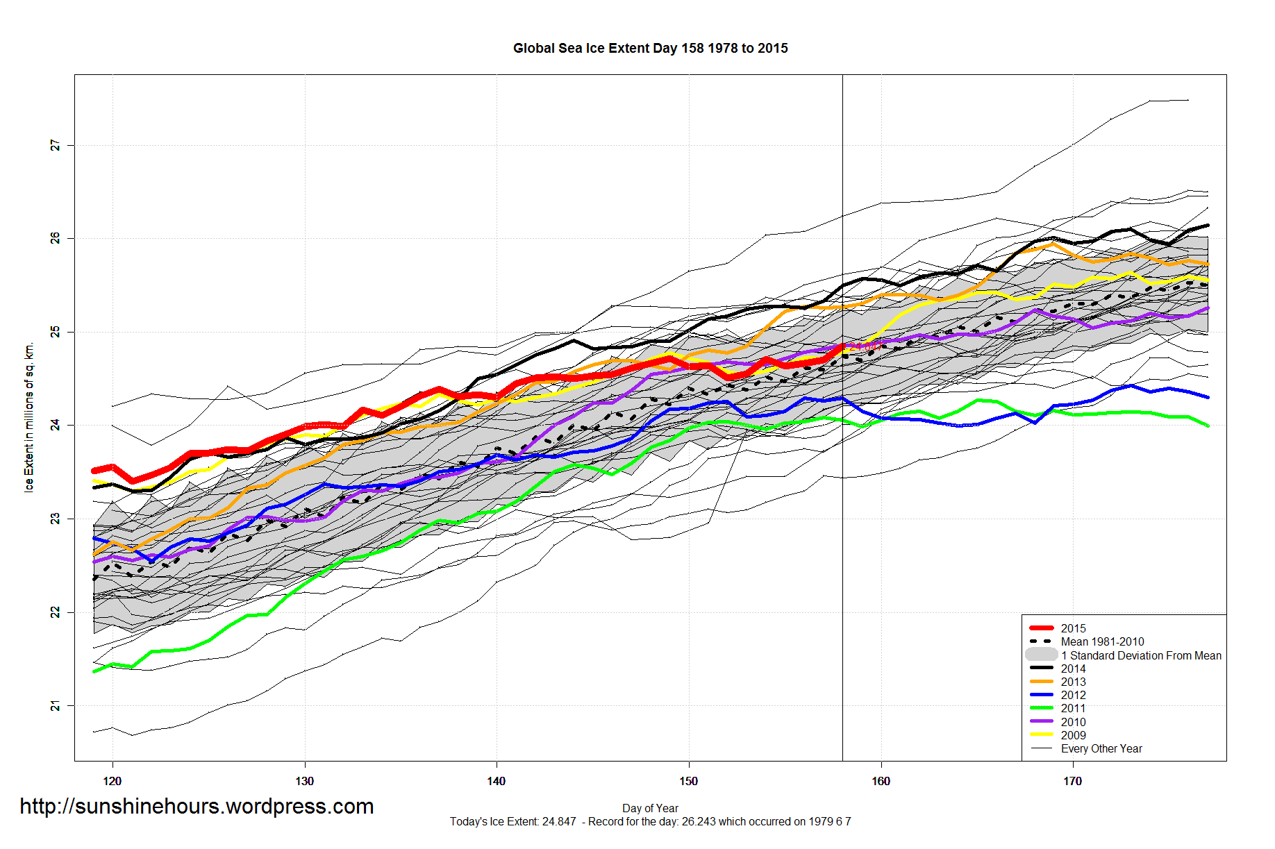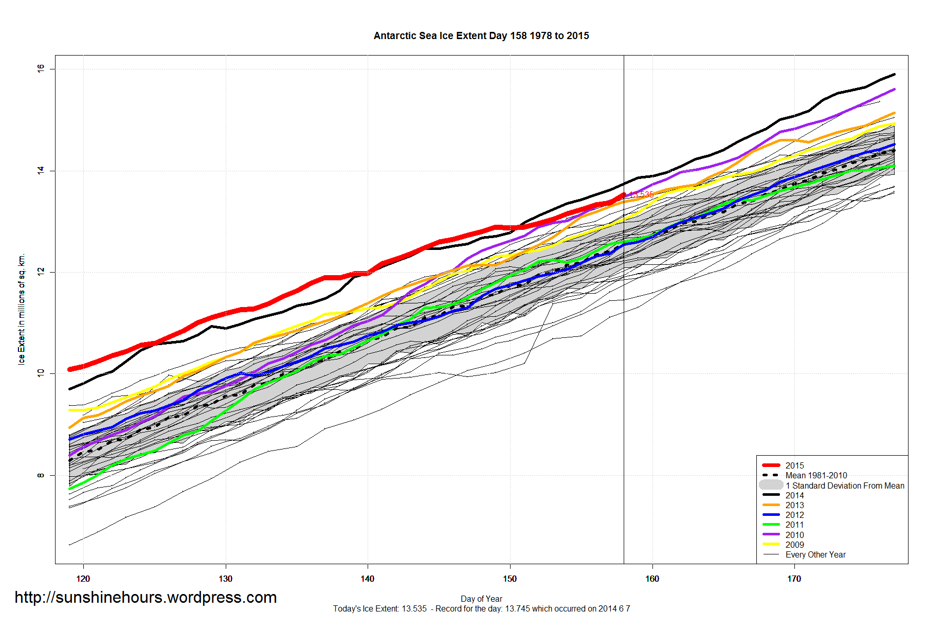 Sea Ice Extent – Day 158 – Antarctic 2nd Highest – Global 16th Highest For This Day Published on June 8, 2015 by sunshinehours1 2nd Highest Antarctic Sea Ice For This Day – 1 million above the 1981-2010 mean. – Above 2 standard deviation. 16th Highest Global Sea Ice For This Day – Above the 1981-2010 mean. South / North Share this: Click to share on X (Opens in new window) X Click to share on Facebook (Opens in new window) Facebook Like Loading... Related