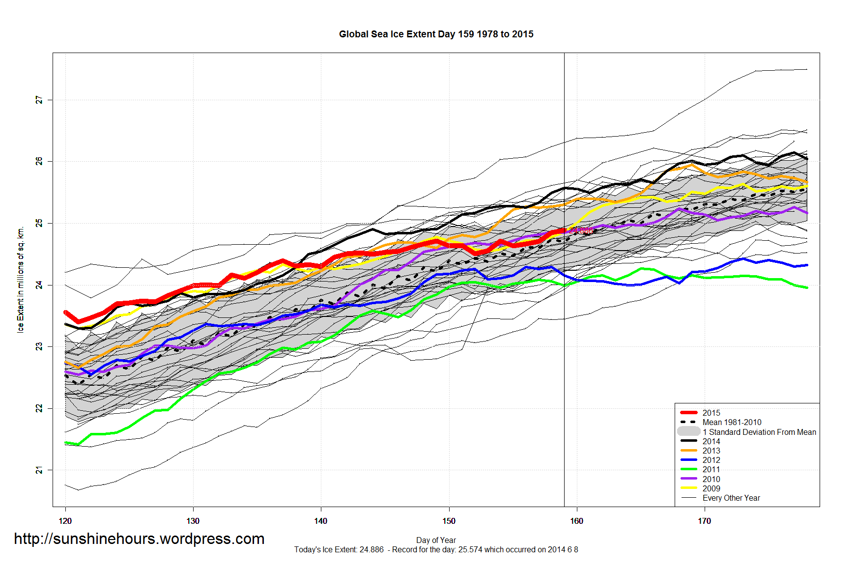 Sea Ice Extent – Day 159 – Antarctic 3rd Highest – Global 14th Highest For This Day