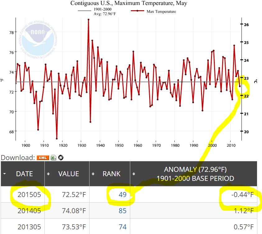 USA NOAA May 2015 Tmax – 49th Coldest out of 121 (-0.44F Colder Than 1901-2000) Published on June 16, 2015 by sunshinehours1 According to the NOAA, May 2015 was ranked 49th coldest out of 121. Share this: Click to share on X (Opens in new window) X Click to share on Facebook (Opens in new window) Facebook Like Loading... Related